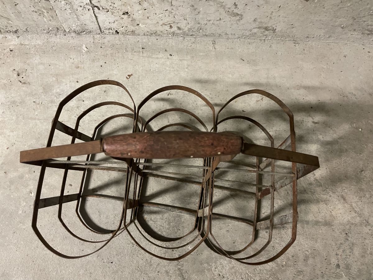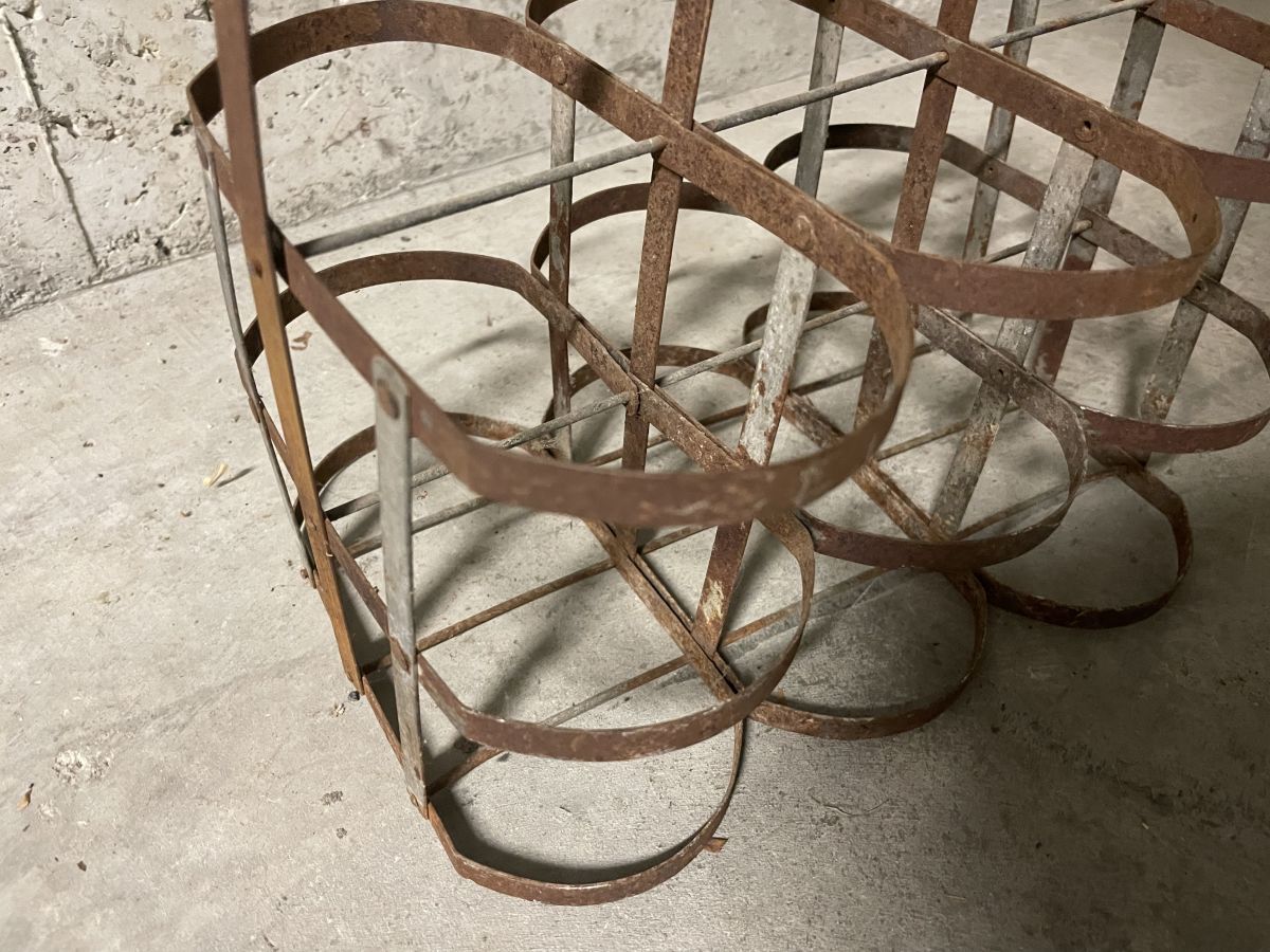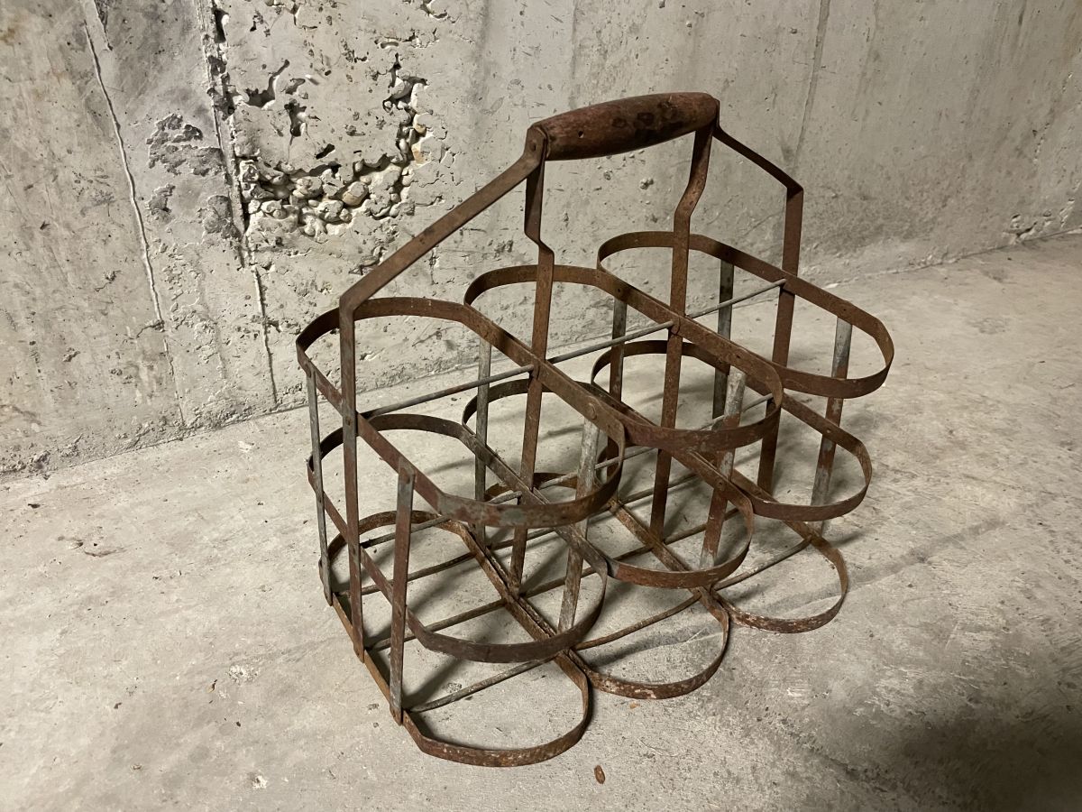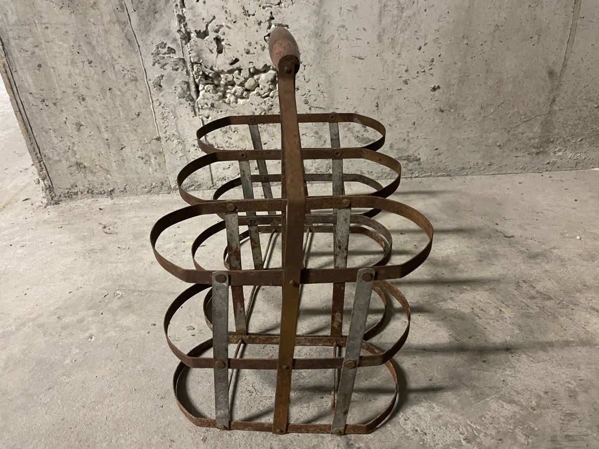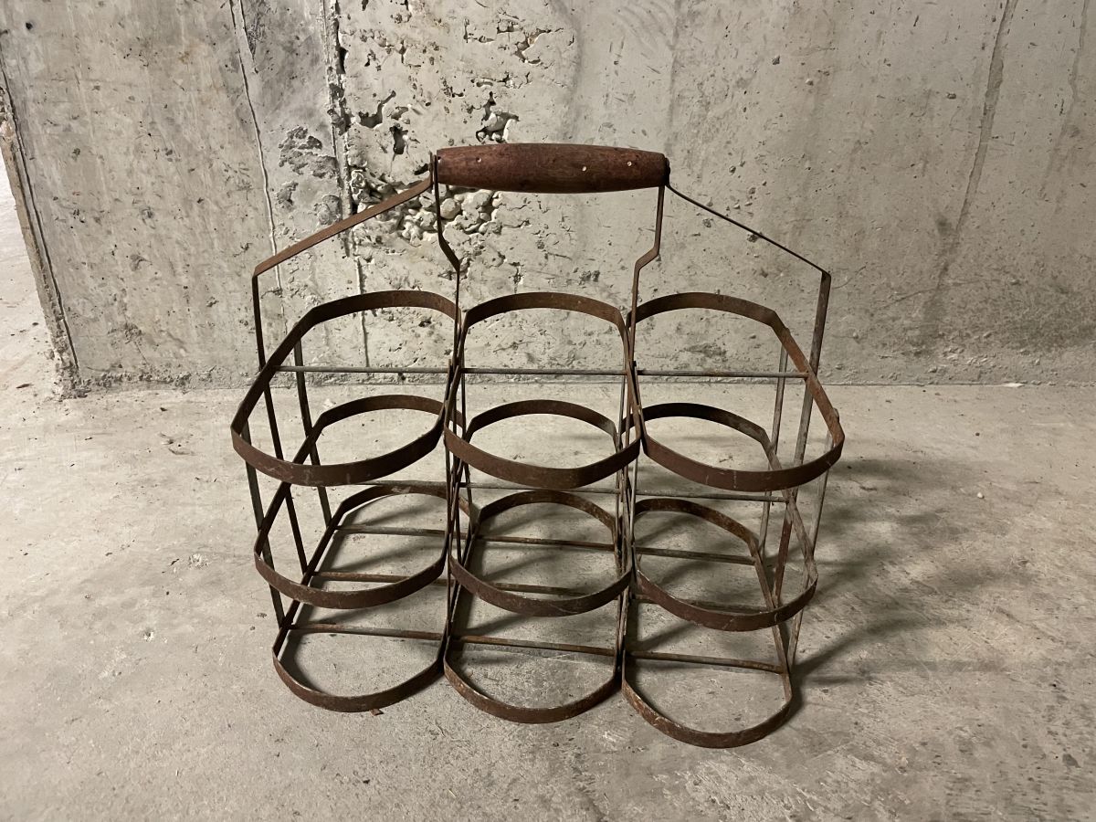 Porte-bouteilles en métal des années 50, dans son jus, capacité 6 bouteilles, dimensions (cm) : L.30xH.29xP.21.