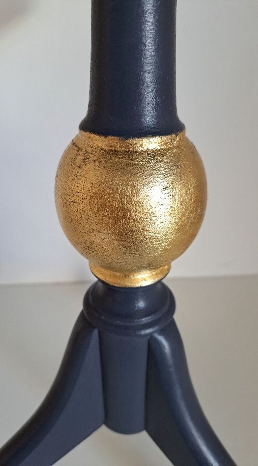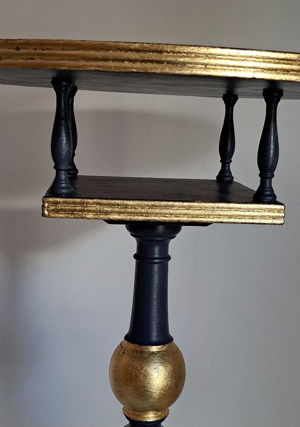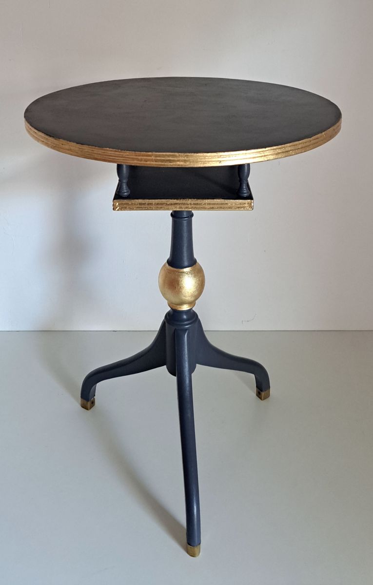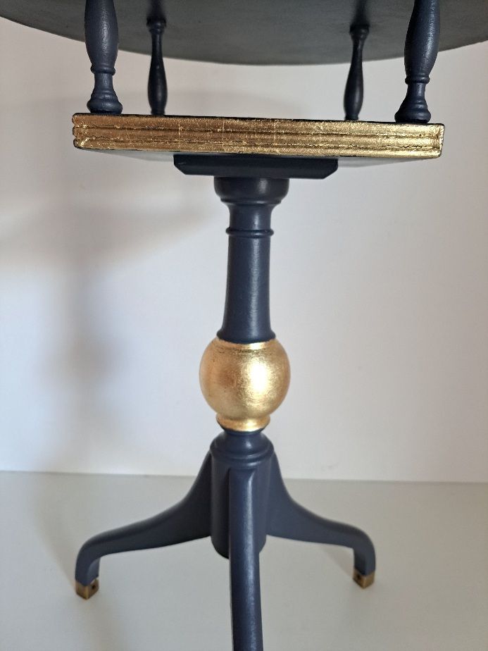 Marque : Table d'appoint peint en gris foncé avec des détails à la fausse feuille doré.