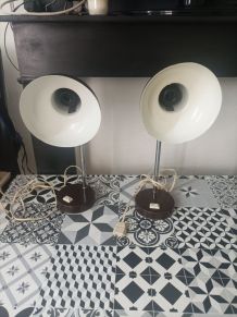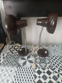 Petite lampe cocotte en métal jaune sablé et tige en métal doré des années 50, hauteur 25cm, diamètre de la base 10cm, diamètre de l’abat-jour 10cm, quelques traces d’usage normal, fil en tissu un peu dénudé à quelques endroits, en parfait état de fonctionnement, bon état général.