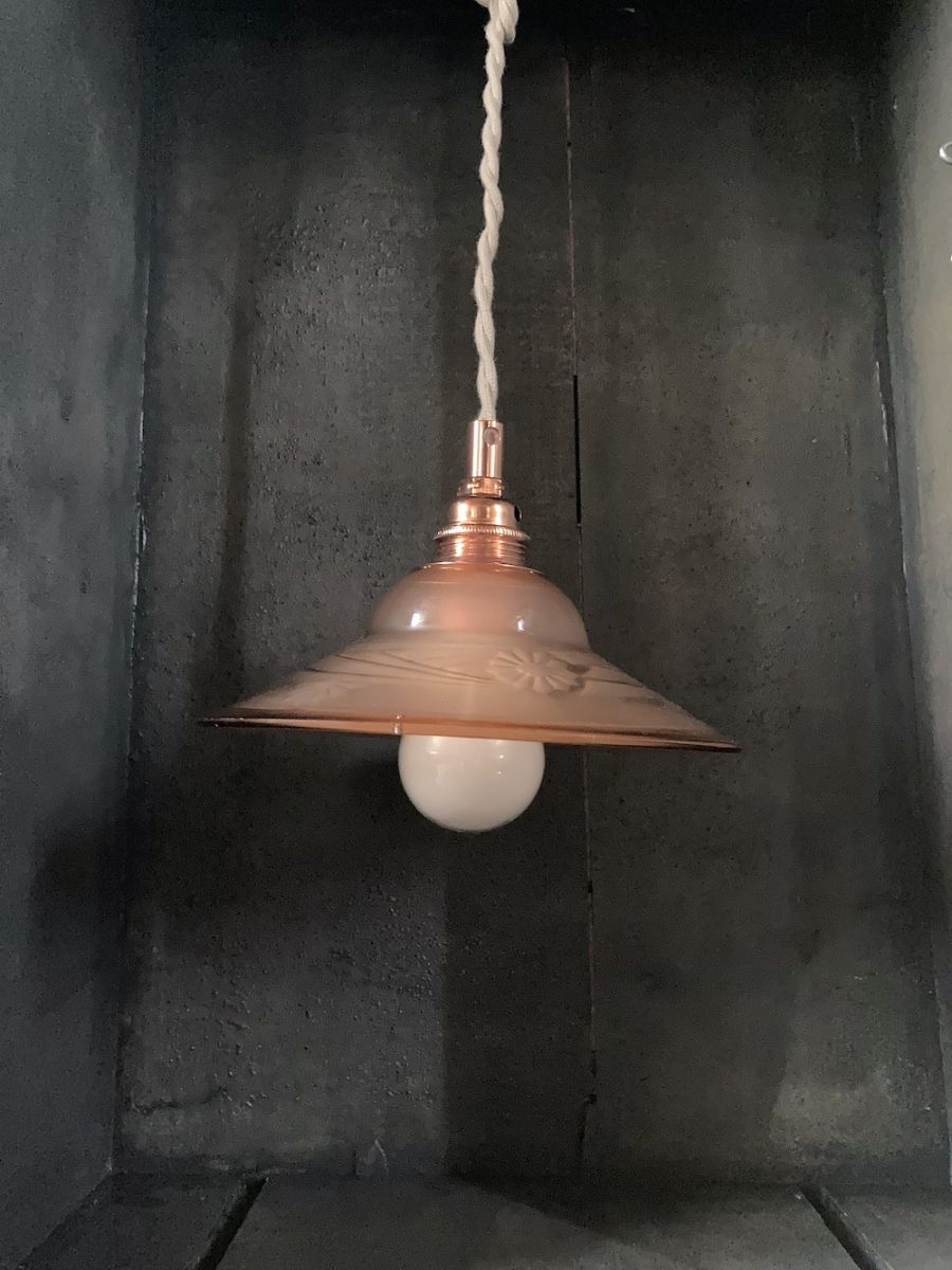 Cette baladeuse en verre rose est une pièce unique créée à partir d'un abat-jour en verre décoré. Je l'ai récupéré sur un ancien luminaire déniché en Picardie. Sa couleur rose cuivrée et ses motifs floraux font sa touche d'originalité et ajoutent une douceur et élégance à votre intérieur. Sa forme évasée laisse apparaitre en partie l'ampoule. Vous pourrez vous amuser à varier les ambiances lumineuses en utilisant une ampoule au verre ambré et filament apparent pour un style plus vintage ou une ampoule en verre opalin pour un éclairage doux et diffusant,