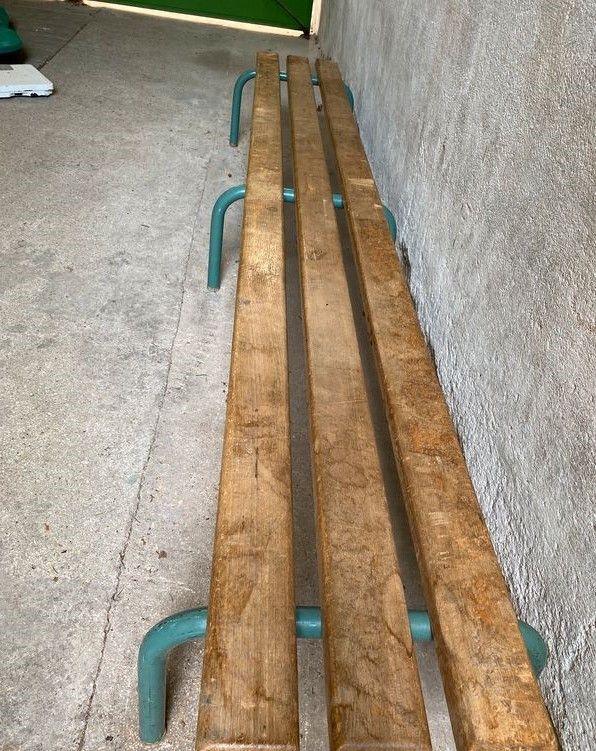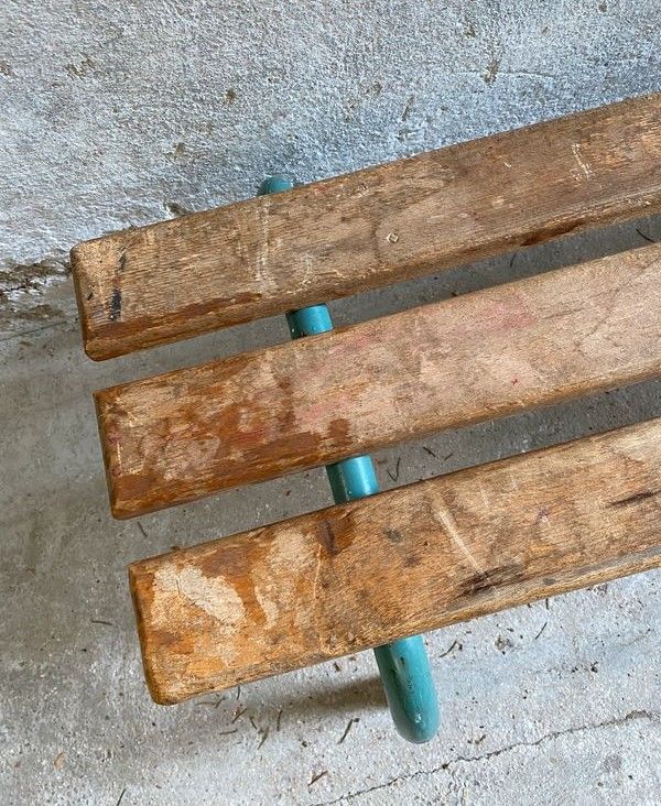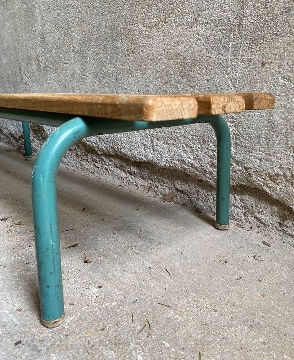 Adorable banc d'école maternelle, avec son piètement en acier tubulaire vert bleu, typique qui lui donne un style industrielle et ses lattes de bois massif, qui lui donne une assise confortable.