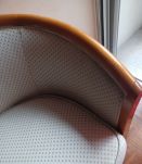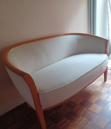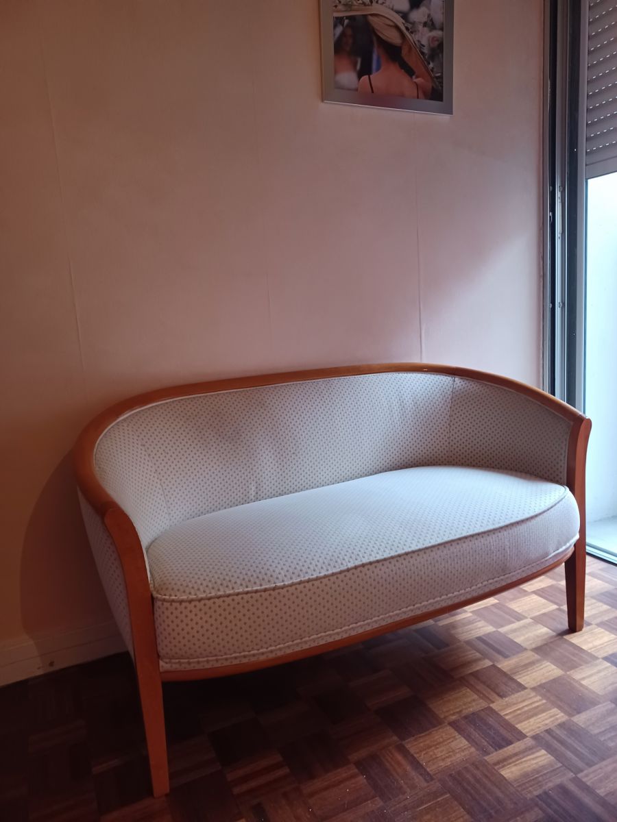 Très beau canapé fixe refait par un tapissier parisien en tissu beige, petits points verts. Très compact il peut trouver sa place dans un salon ou une chambre. Excellent état ! Bois vernis clair ...très original et bonne assise !