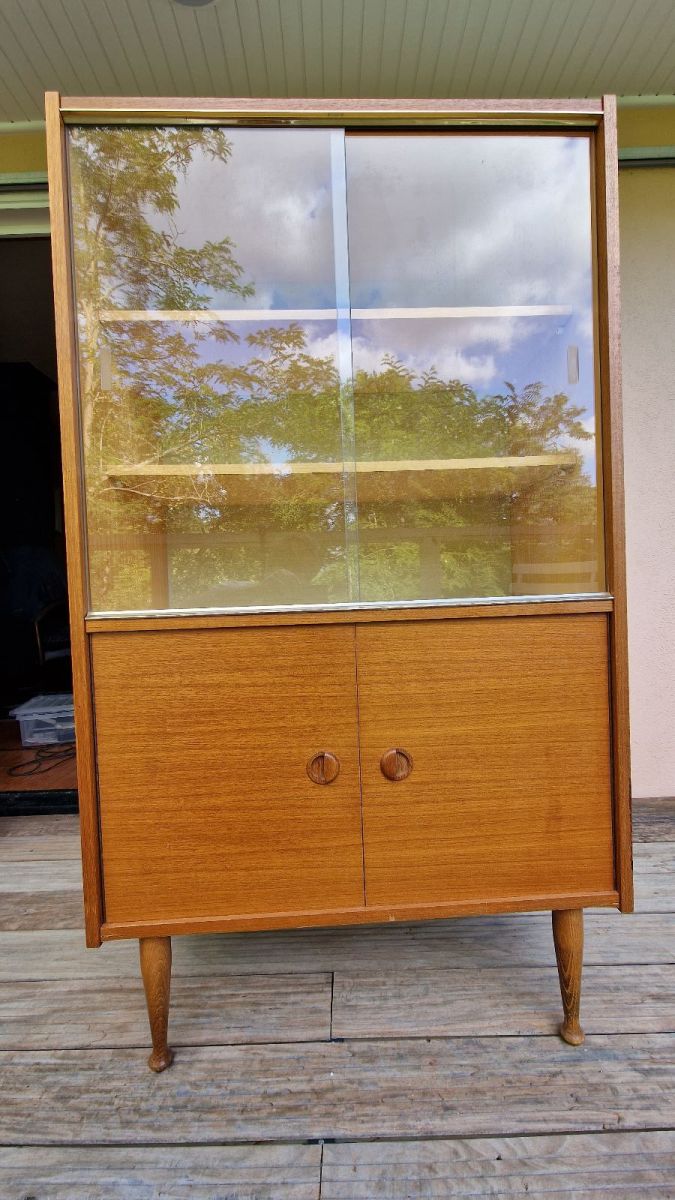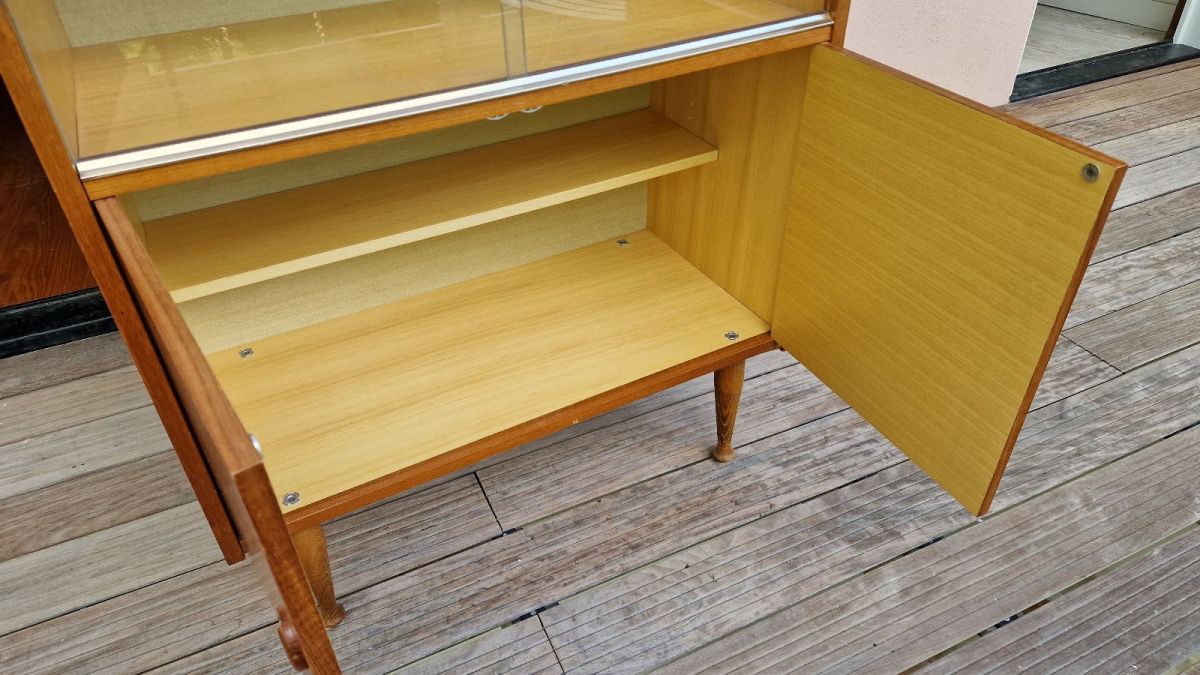 Bibliothèque vintage en bois plaqué intérieur et extérieur acacia, composée de 2 parties, vitrine coulissante partie haute et étagères partie basse. Meuble année 60 en parfait état