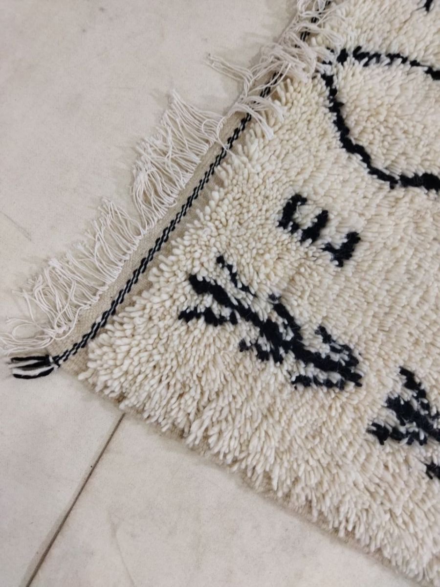 Tapis traditionnel marocain en laine, tissé à la main, qui perdurera pendant des années. Porteur d'art, d'histoire, de douceur et d'élégance, il s'intègrera harmonieusement à tous les styles de décoration, apportant une touche ethnique et chaleureuse à votre intérieur. Nous utilisons les meilleures techniques de tissage pour nos tapis, qui sont confectionnés à partir de 100% de laine. Nous entretenons une collaboration directe avec les artisans, car il nous tient à cœur de comprendre leur savoir-faire, d'apprendre la symbolique de leurs créations, puis de la partager avec vous à travers bohowool. Chaque tapis est unique et reflète la vie du tisserand qui l'a façonné. N'hésitez pas à nous indiquer si vous préférez une autre taille, une combinaison de couleurs ou un motif particulier. Si vous êtes intéressé par un tapis de dimensions différentes, nous pouvons le confectionner pour vous dans les plus brefs délais. Nos tapis sont expédiés depuis le maroc, et les frais de douane sont à la charge des clients. Nous avons besoin de 3 à 5 jours pour traiter les commandes, et les délais de livraison varient entre 4 et 9 jours. Faites l'acquisition d'un morceau d'art et de tradition marocains pour votre intérieur, tout en soutenant nos artisans talentueux." n'hésitez pas à me demander si vous avez besoin de plus d'informations ou de modifications supplémentaires !.