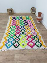 Tapis traditionnel marocain en laine, tissé à la main, qui perdurera pendant des années. Porteur d'art, d'histoire, de douceur et d'élégance, il s'intègrera harmonieusement à tous les styles de décoration, apportant une touche ethnique et chaleureuse à votre intérieur. Nous utilisons les meilleures techniques de tissage pour nos tapis, qui sont confectionnés à partir de 100% de laine. Nous entretenons une collaboration directe avec les artisans, car il nous tient à cœur de comprendre leur savoir-faire, d'apprendre la symbolique de leurs créations, puis de la partager avec vous à travers bohowool. Chaque tapis est unique et reflète la vie du tisserand qui l'a façonné. N'hésitez pas à nous indiquer si vous préférez une autre taille, une combinaison de couleurs ou un motif particulier. Si vous êtes intéressé par un tapis de dimensions différentes, nous pouvons le confectionner pour vous dans les plus brefs délais. Nos tapis sont expédiés depuis le maroc, et les frais de douane sont à la charge des clients. Nous avons besoin de 3 à 5 jours pour traiter les commandes, et les délais de livraison varient entre 4 et 9 jours. Faites l'acquisition d'un morceau d'art et de tradition marocains pour votre intérieur, tout en soutenant nos artisans talentueux." n'hésitez pas à me demander si vous avez besoin de plus d'informations ou de modifications supplémentaires !.
