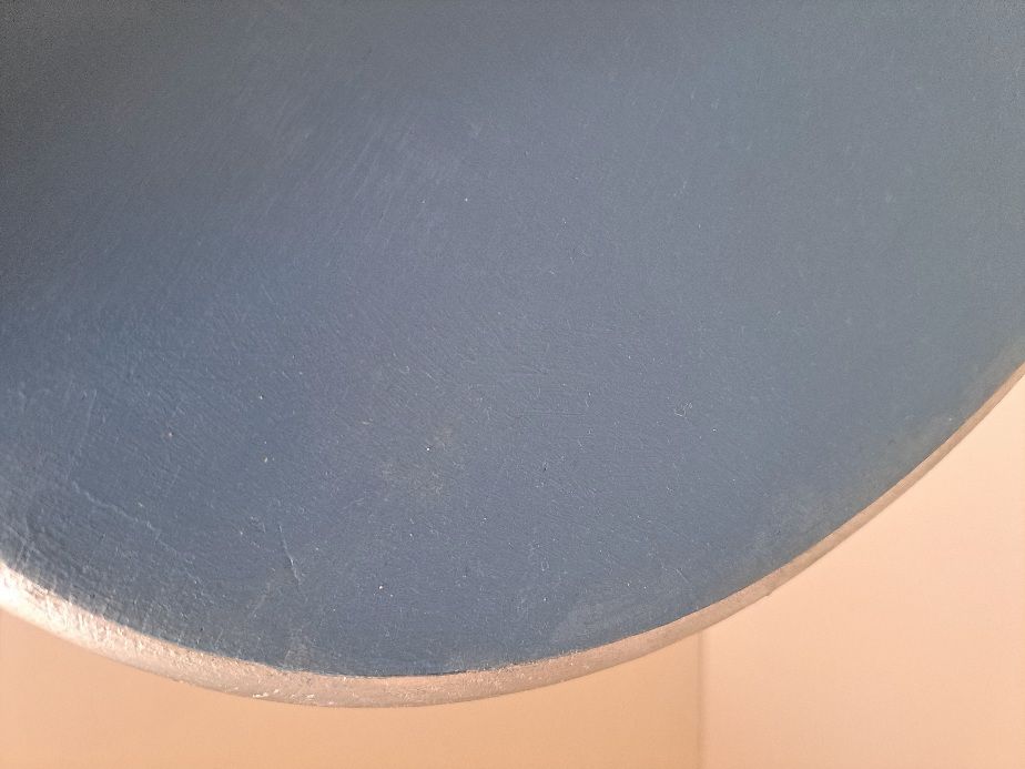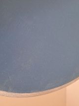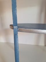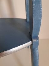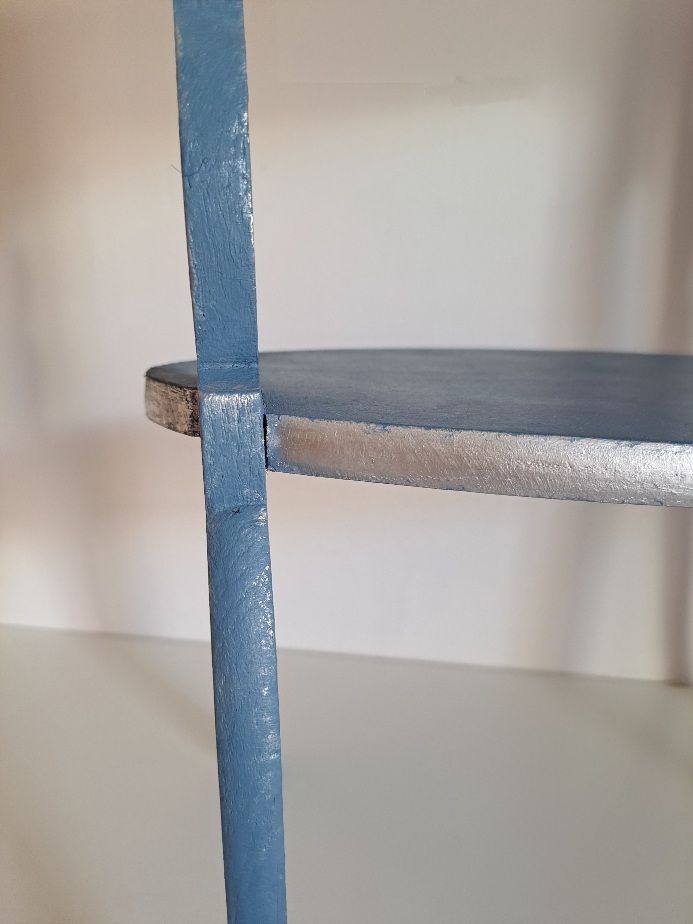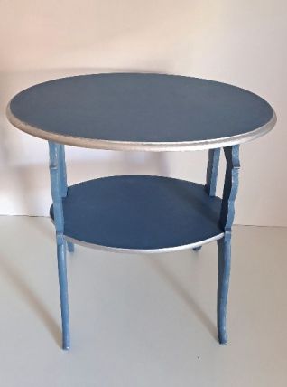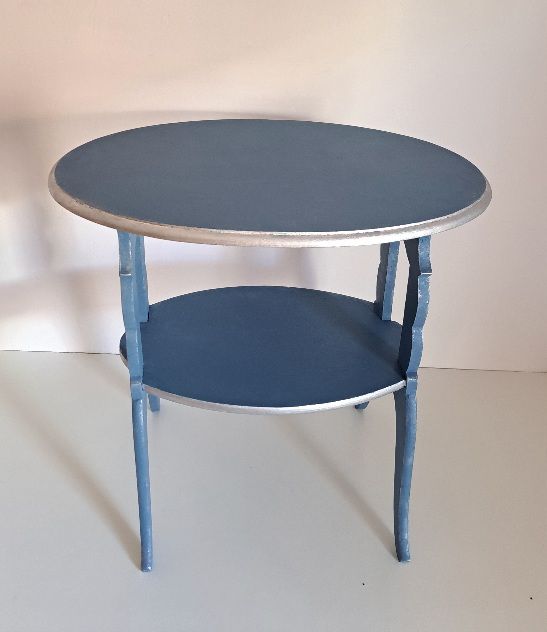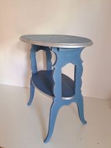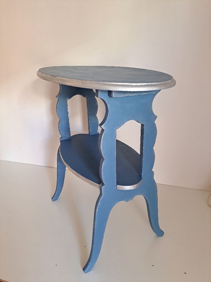 Marque : Petite table d'appoint peinte en bleu avec des détails argentés et cire naturelle.