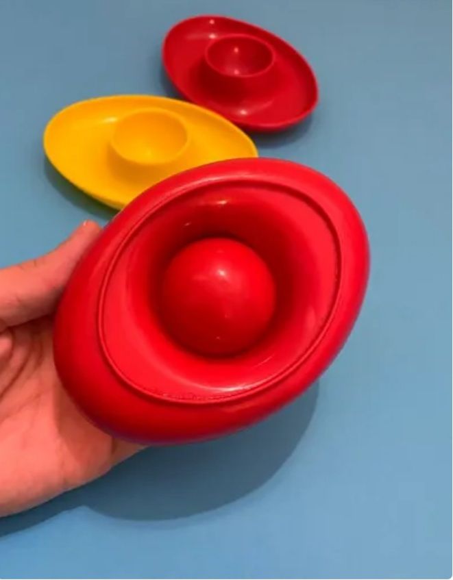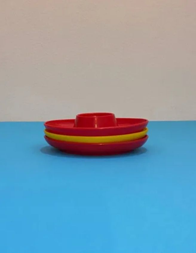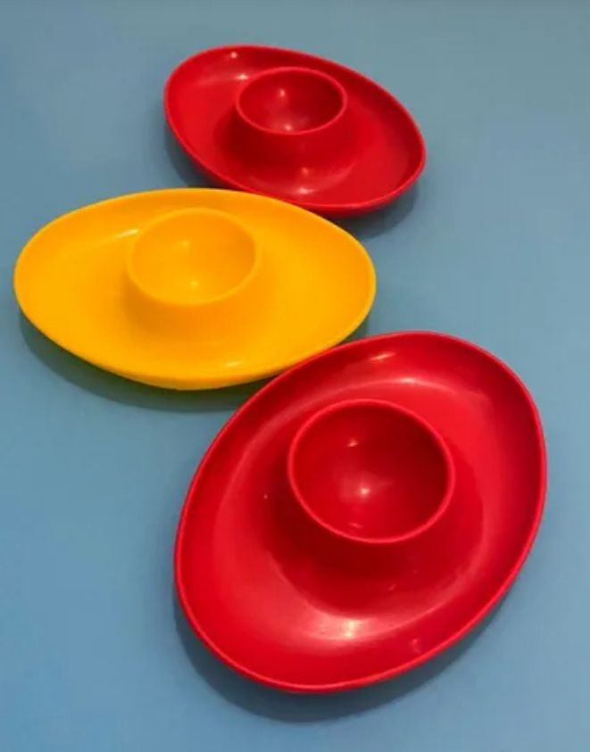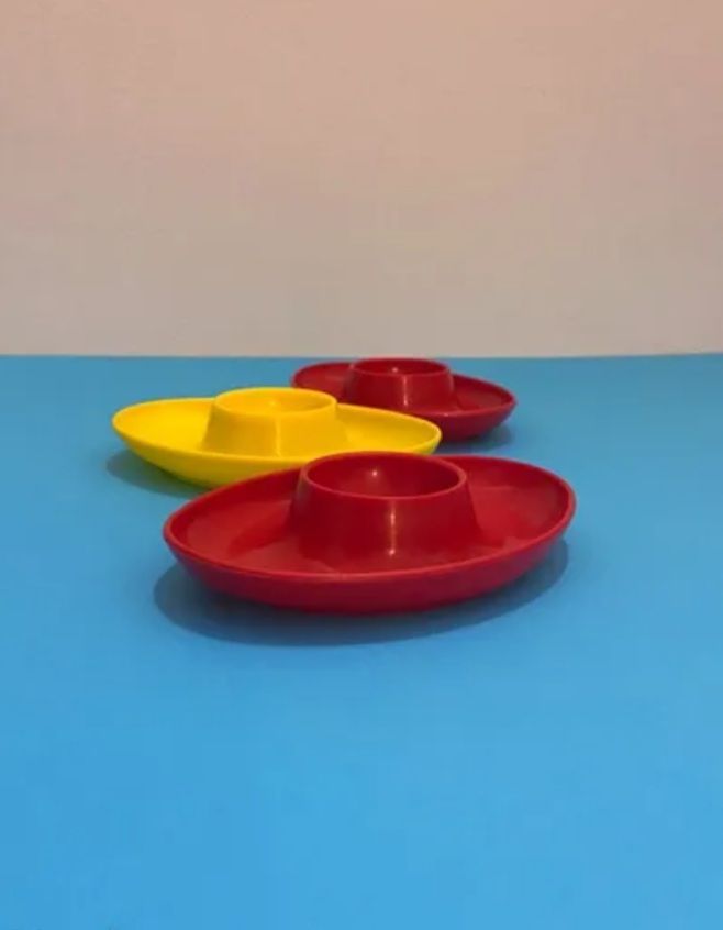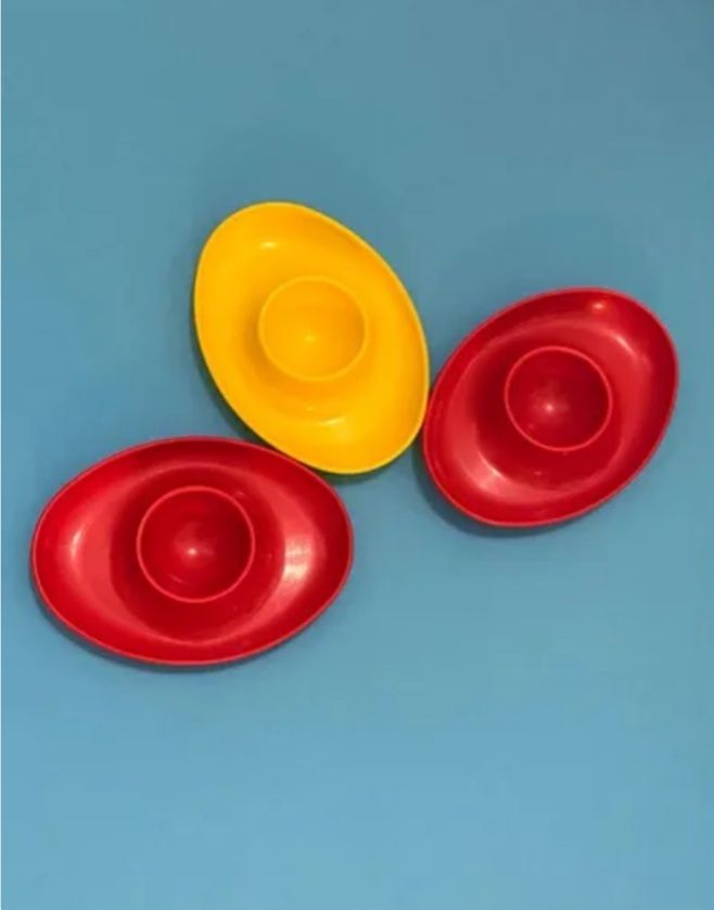 Lot de 3 coquetiers vintage, années 1970. En plastique, forme bateau et couleur flashy qui rappelle directement la période space age. 2 rouges et 1 jaune. Très bon état.