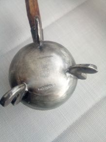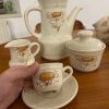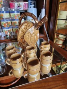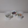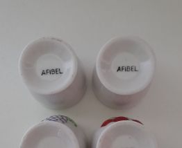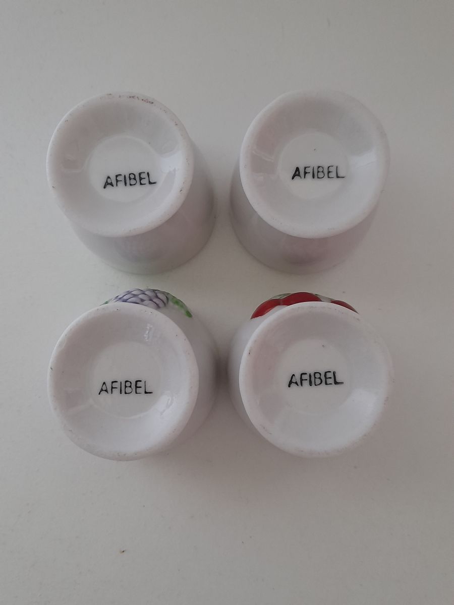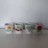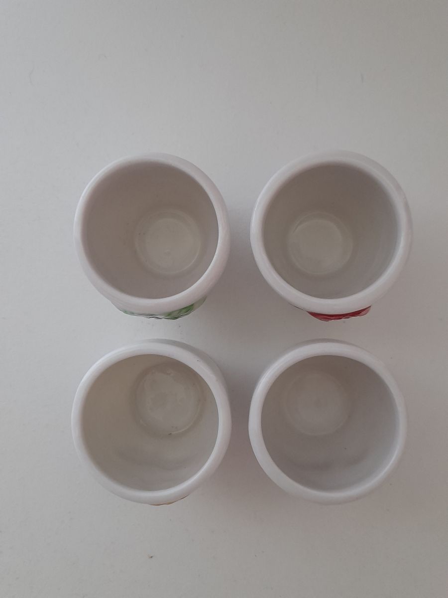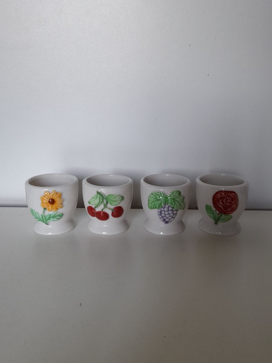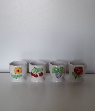 Ensemble de 4 coquetiers vintage années 1970, déor en relief fleurs et fruits (raisin / cerise / tournesol / rose), en faïence, marque Afibel. Excellent état.