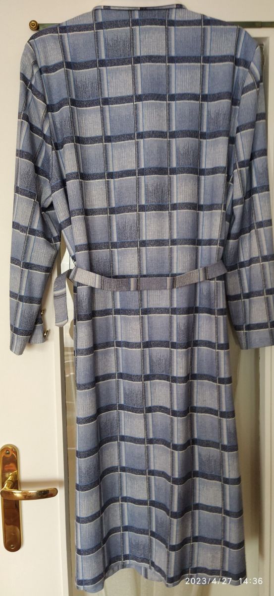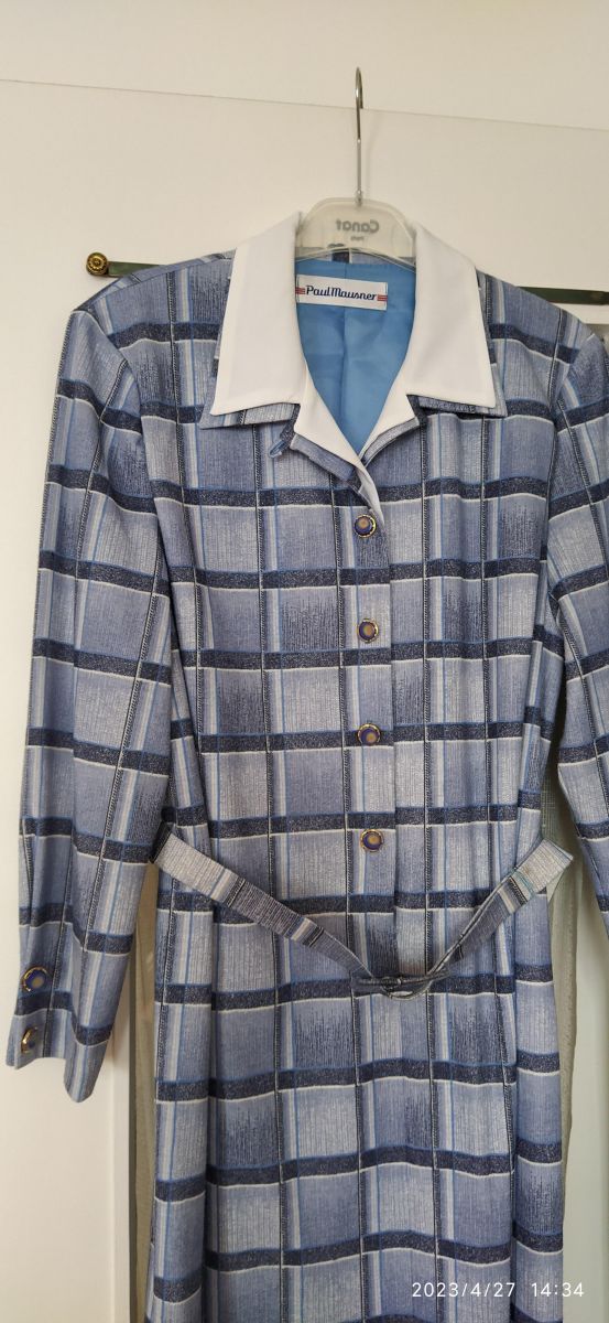 Très belle robe droite avec ceinture en jersey, ton bleu gris et manches longues.