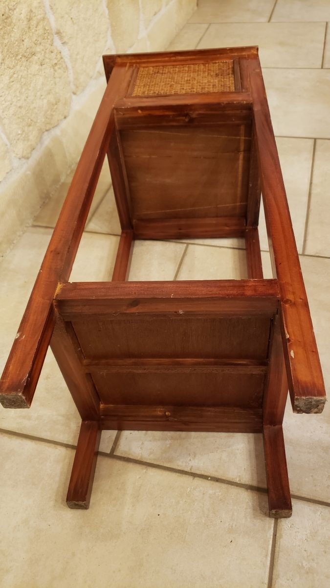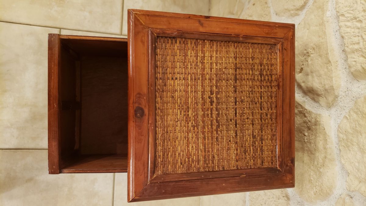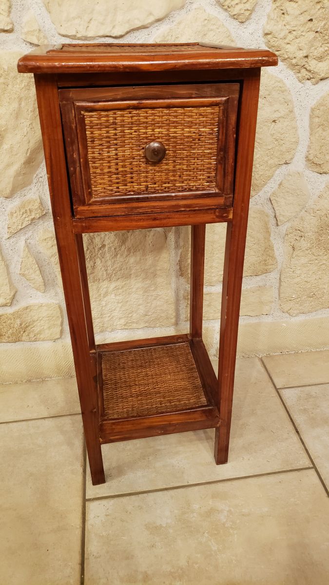 Pratique, aux couleurs naturelles, ce petit meuble vintage en bois et rotin tressé peut s'intégrer dans n'importe quelle pièce de la maison. Il est composé d'un tiroir et d'une tablette qui lui offre encore plus de rangement.
