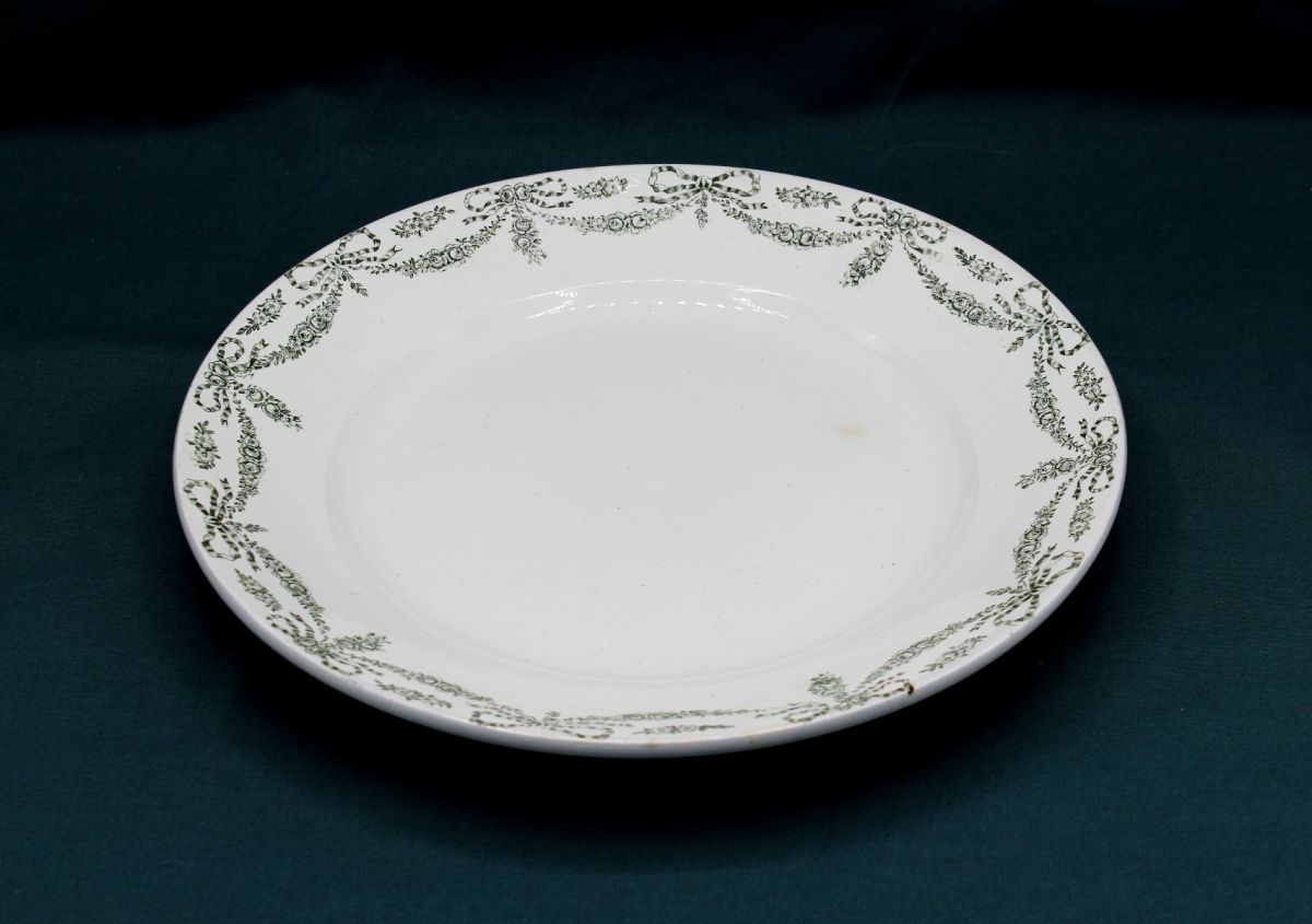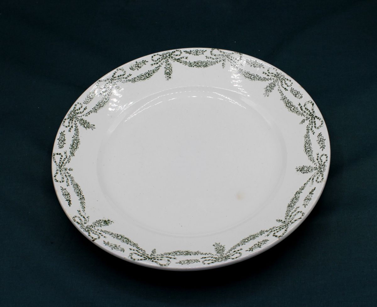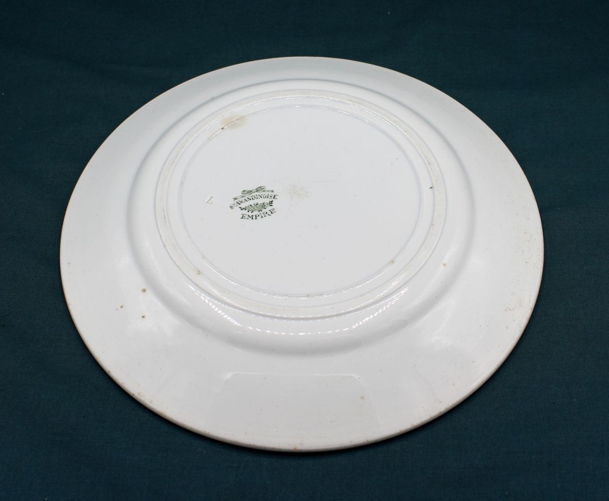 Grand Plat rond de la Faïencerie Sainte Amandinoise (St Amand les Eaux) du modèle Empire à palmettes vert foncé.