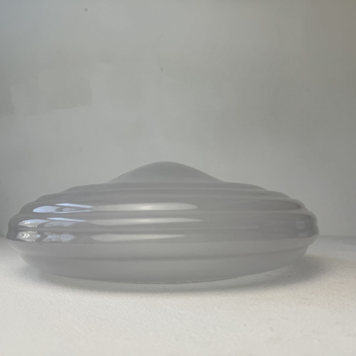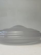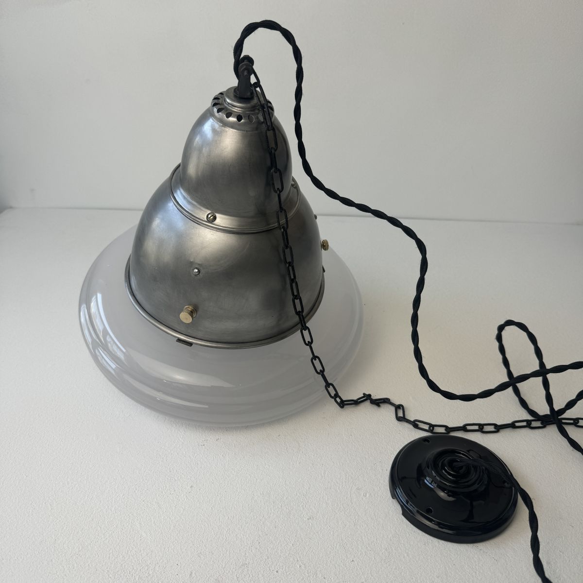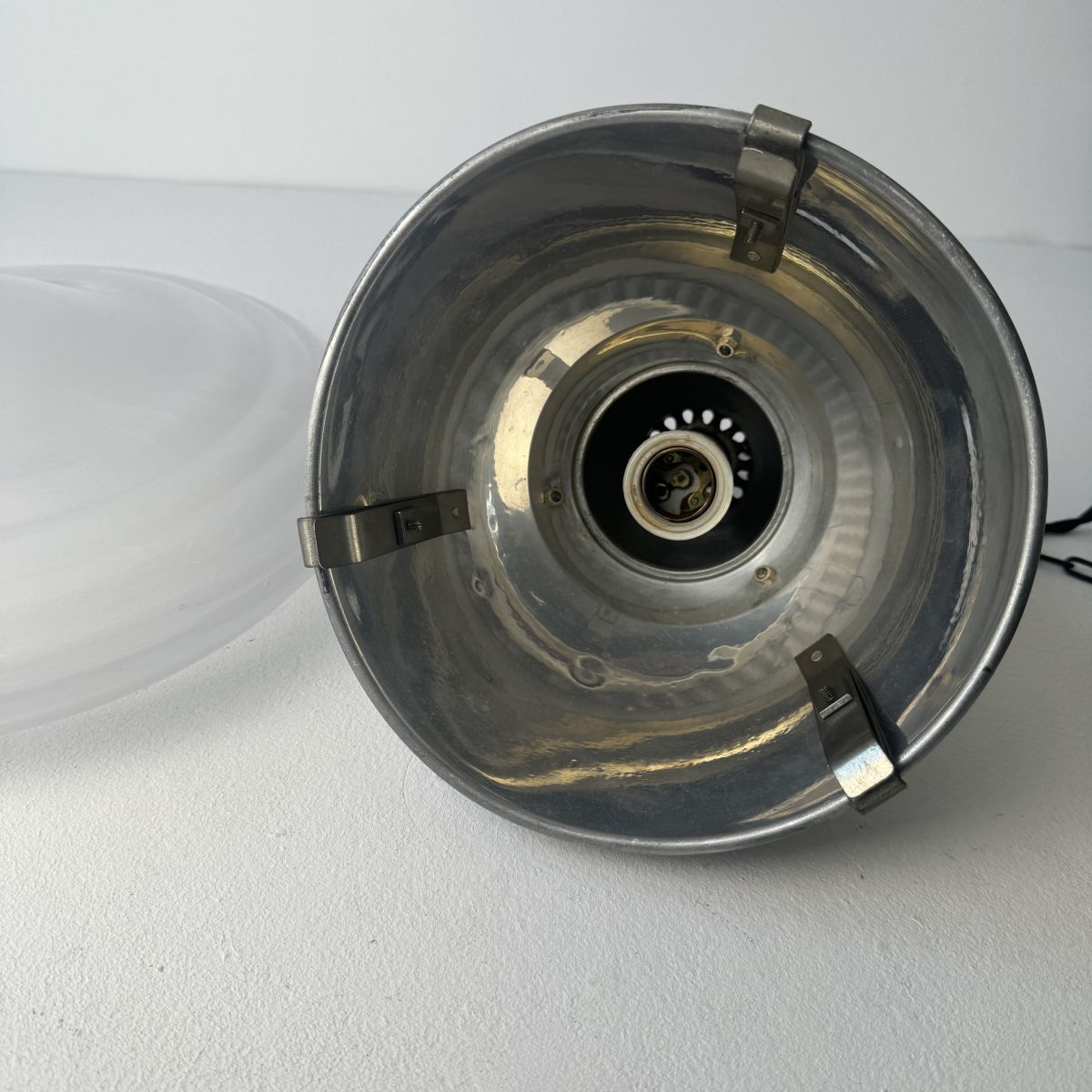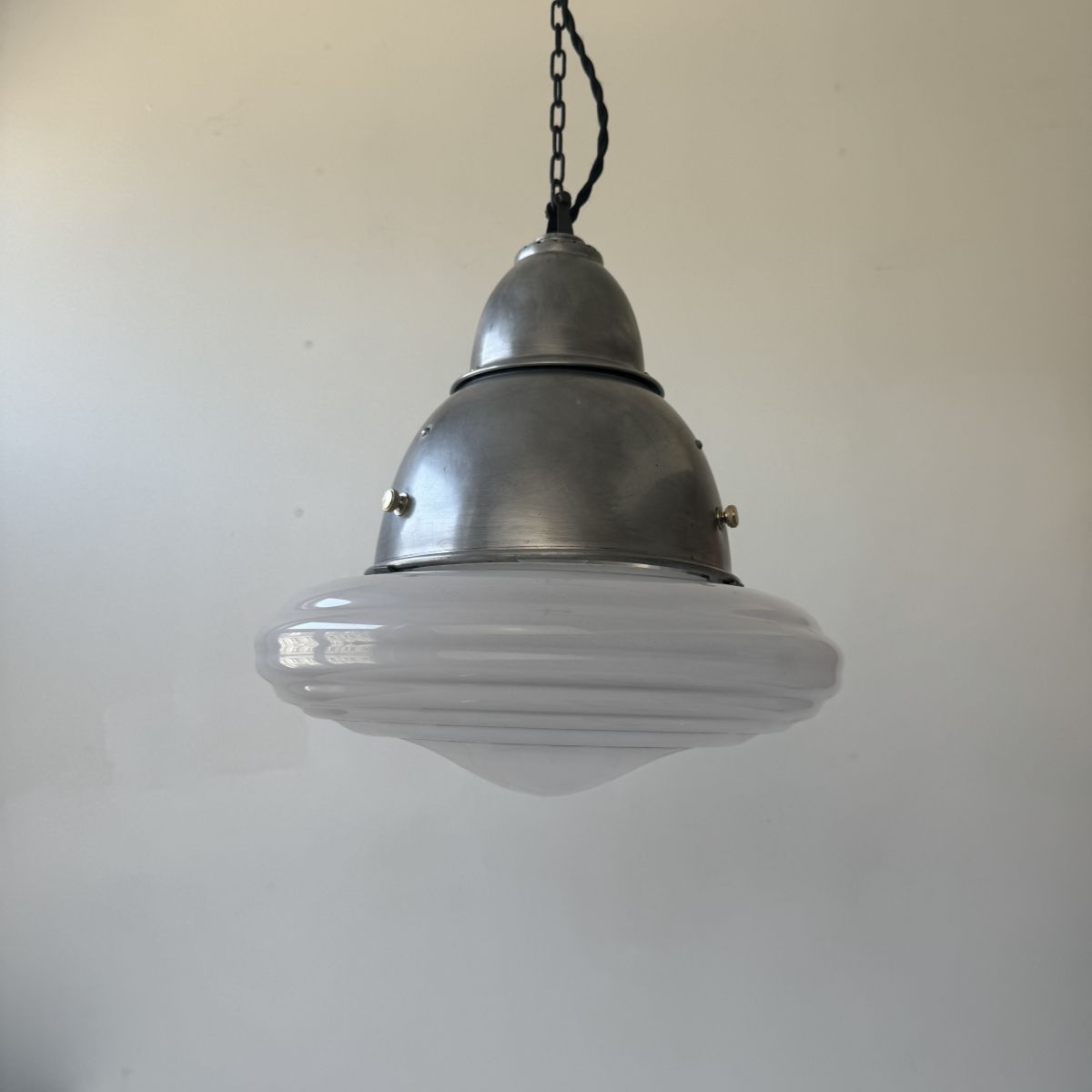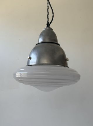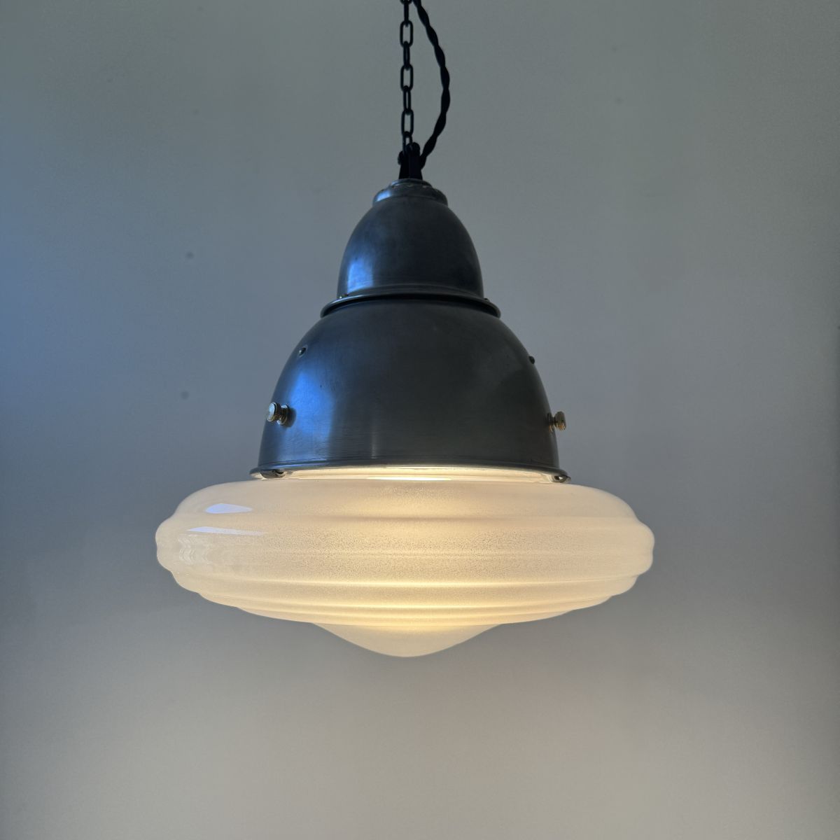Rare. Suspension d'atelier en verre et aluminium épais. En bel état général avec quelques traces du temps. Elle a été poncée et patinée couleur anthracite.