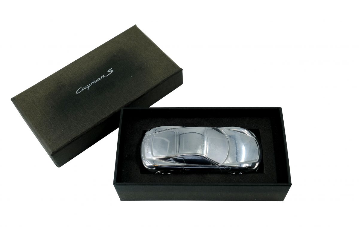 Miniature Porsche Cayman S en métal chrome massif en très bon état dans sa boîte d'origine.