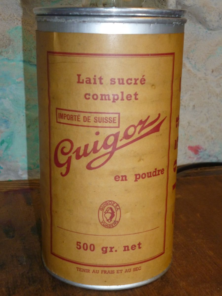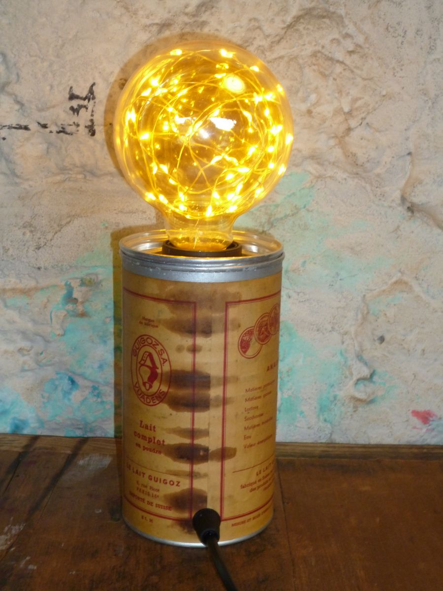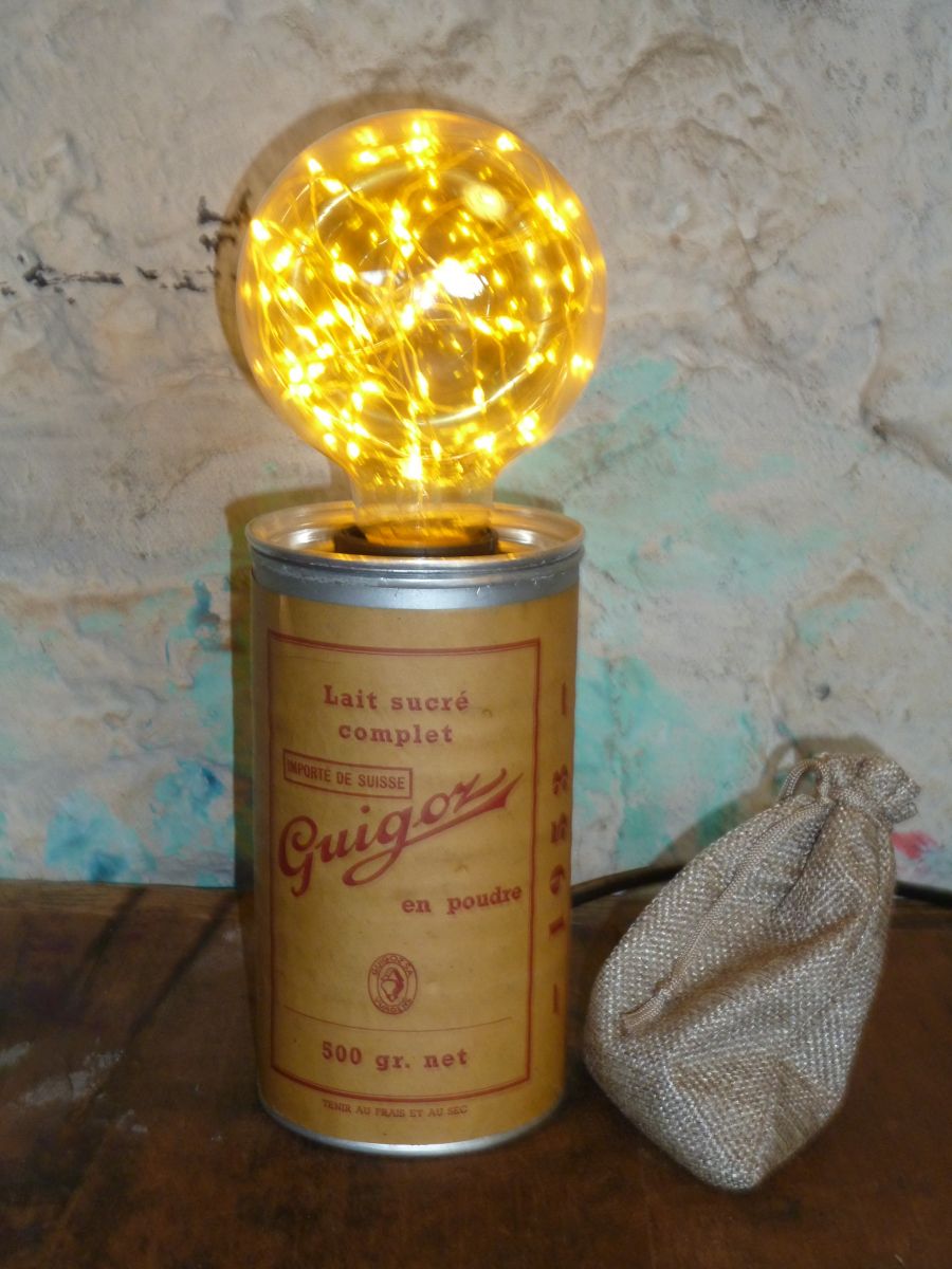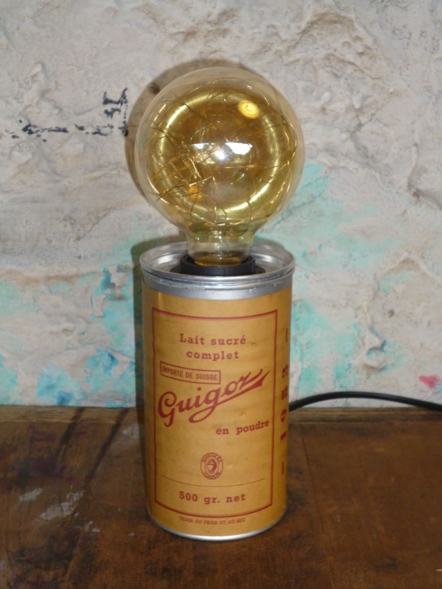 Lampe réalisée a partir d'une ancienne boite métallique " GUIGOZ - 1953 " .
