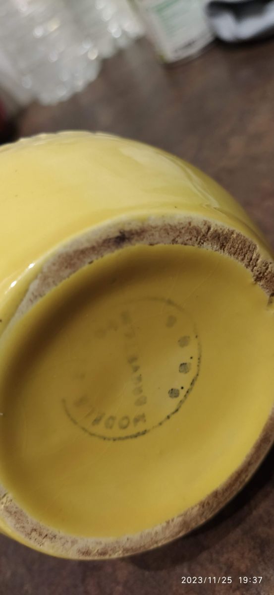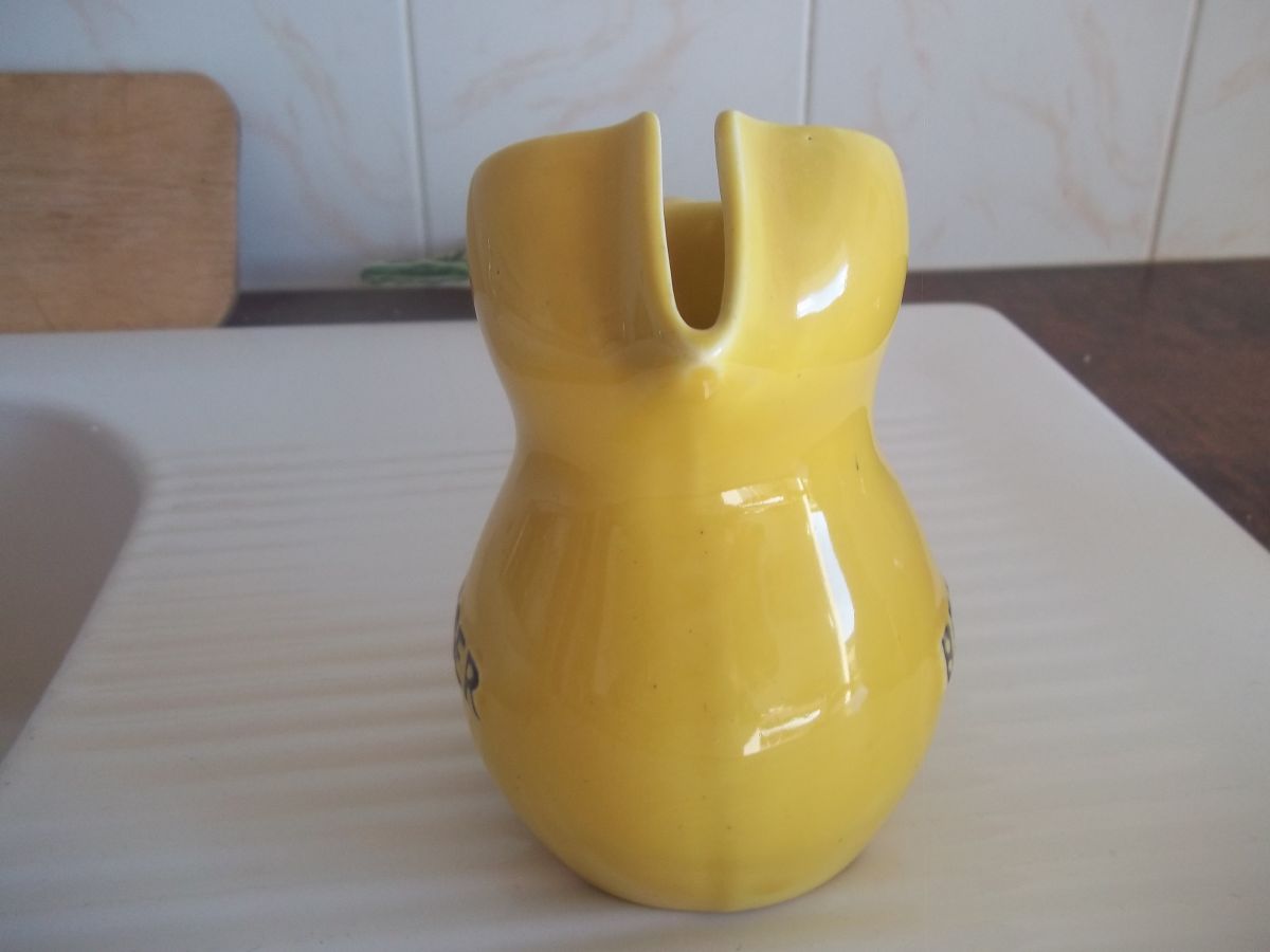 Modèle jaune bombé avec écriture en noir.