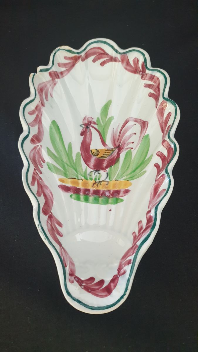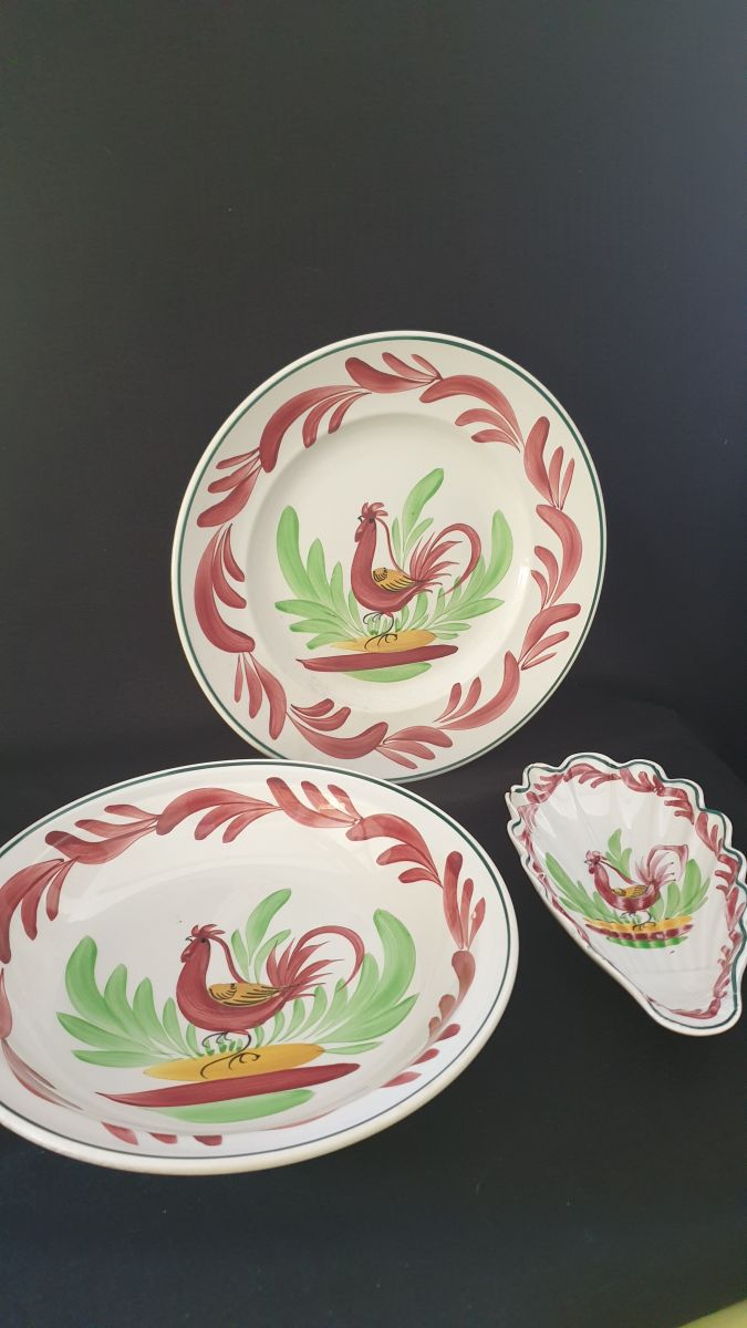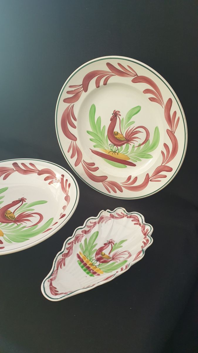 Ensemble de 3 plats de service en véritable opaque de Luneville décor au coq sur tertre.