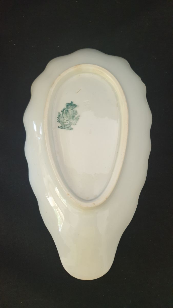 L'ensemble comprend : 1 plat plat de 28,5 cm de diamètre ,1 plat creux de 27 cm de diamètre et 1 ravier forme feuille (23x12cm)