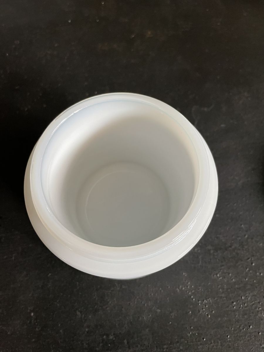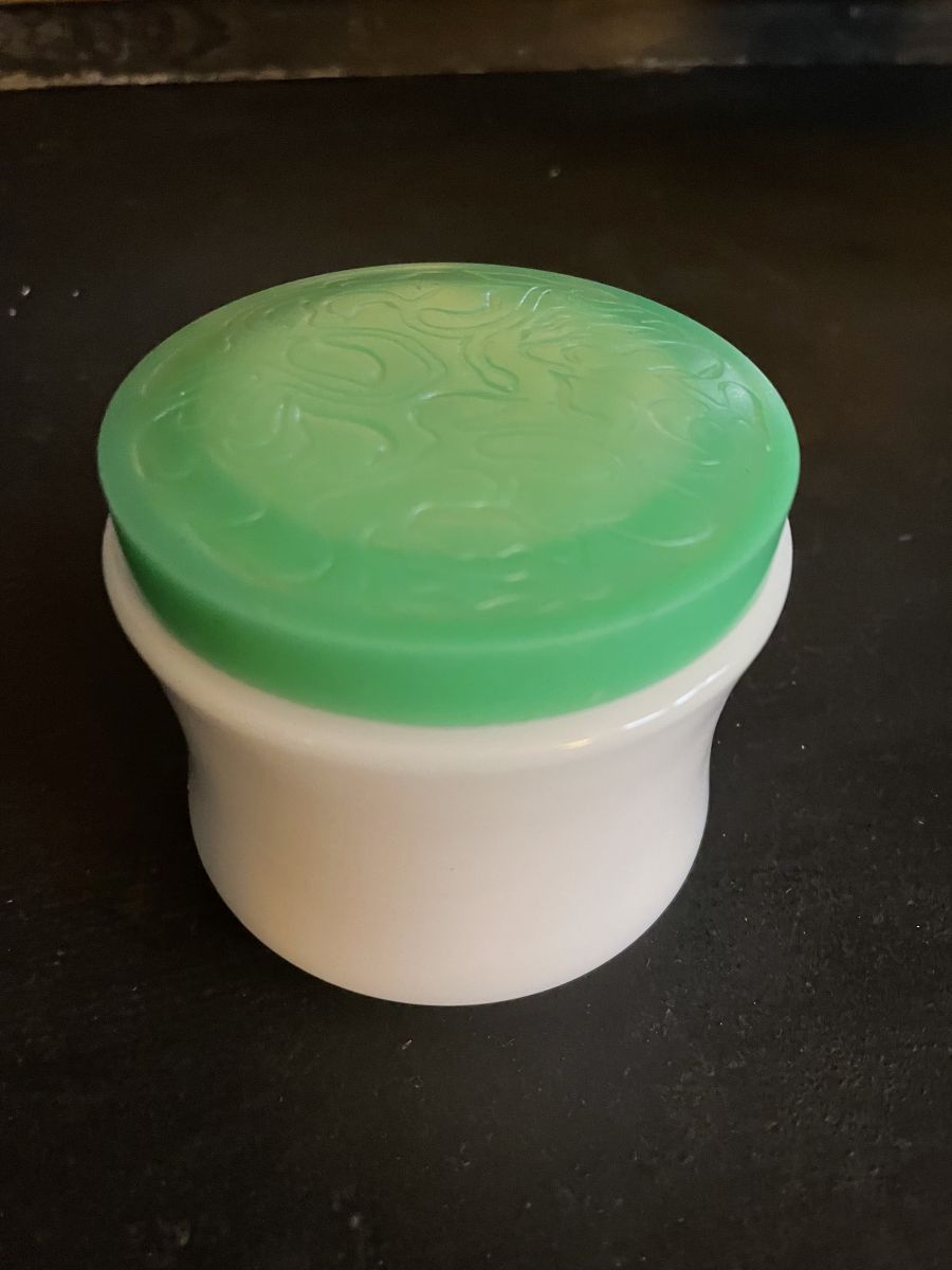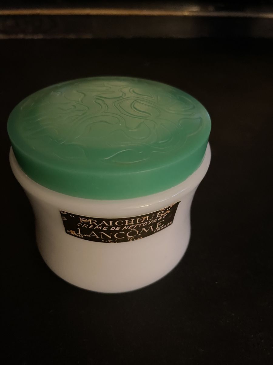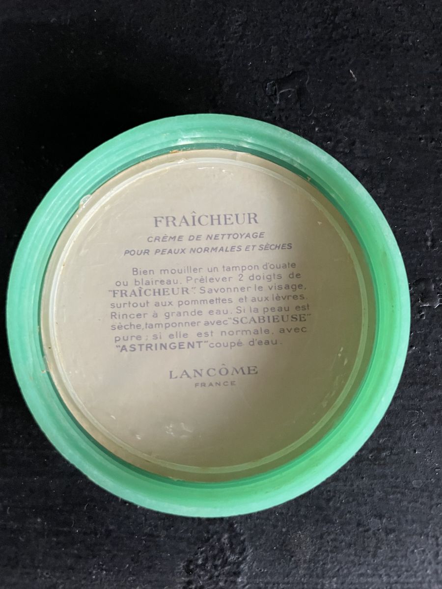 Très joli pot vintage (fin 1950-début 1960) , vide de crème Lancôme " Fraicheur". Le pot assez lourd ( + de 500 g) est en verre opaque blanc . Il est coiffé d'un couvercle de couleur verte ( en polopaze?) avec des dessins gravés pouvant figurer des algues. L'étiquette dorée est simplement collée et peut s'enlever aisément. Aucun éclat, diamètre : 8,5 cm et hauteur 7,5 cm.