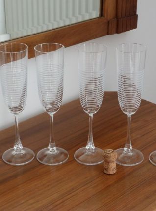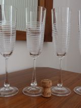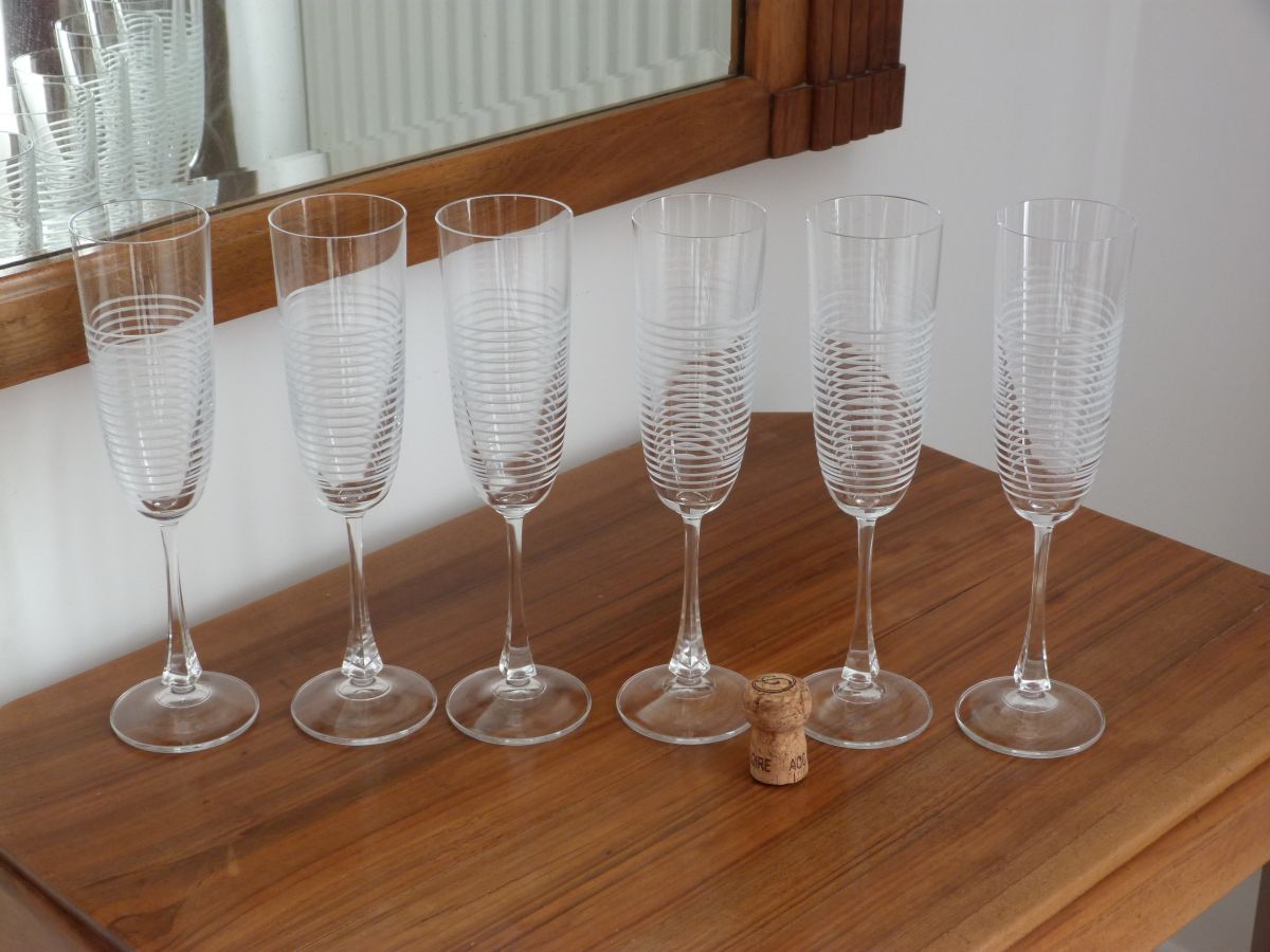 Un très joli lot de 6 grandes flûtes à champagne (peut-être en cristal car le son est clair, mais je n'en suis pas sûr).
