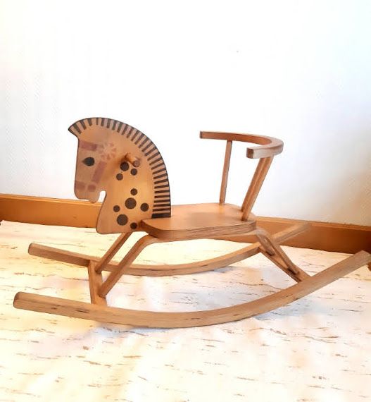 Petit cheval à bascule en bois à dossier. Peinture afin de décorer la tête du cheval. Deux poignées latérales afin que l'enfant s'accroche pour se balancer.