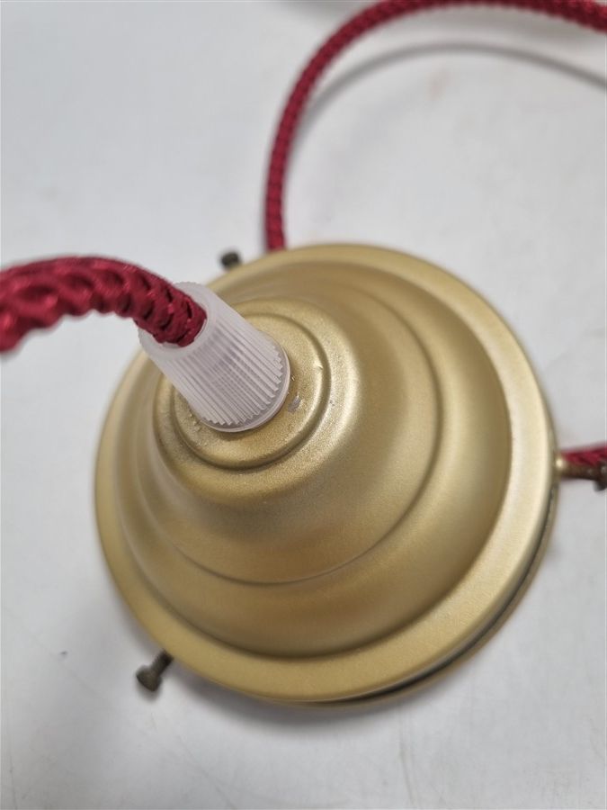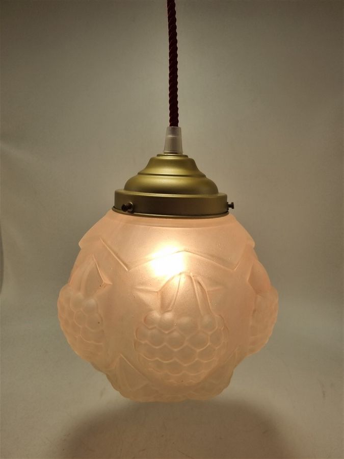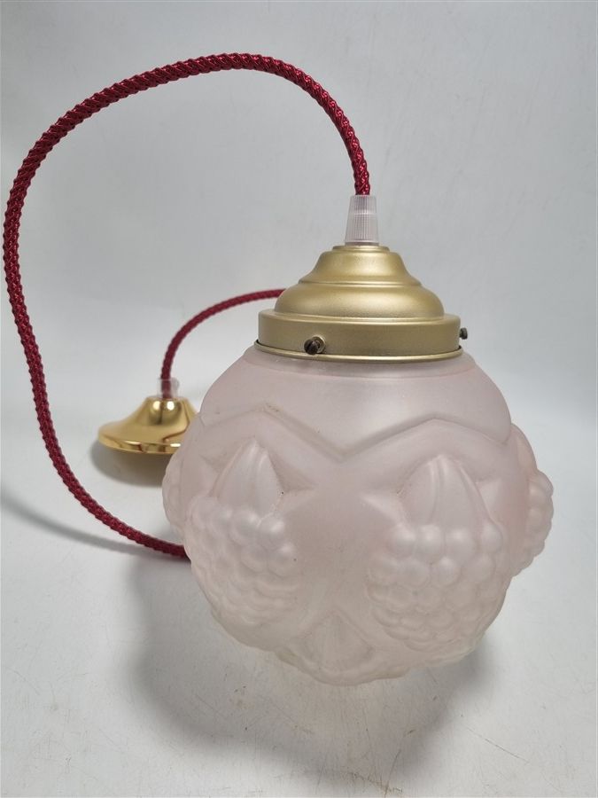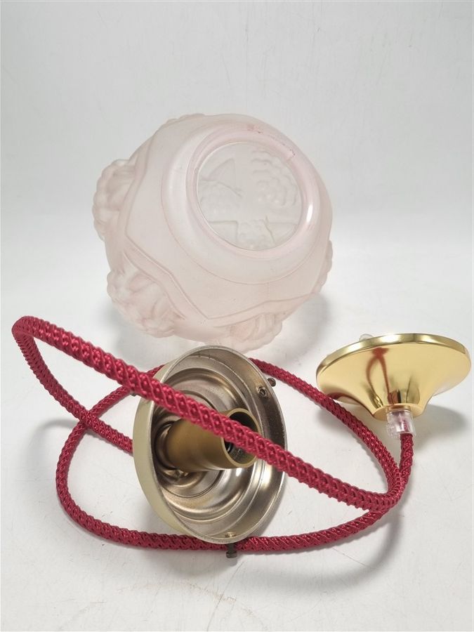 Suspension vintage en verre dépoli rose pâle. L'ensemble présente quelques traces du temps, son état général est très bon.