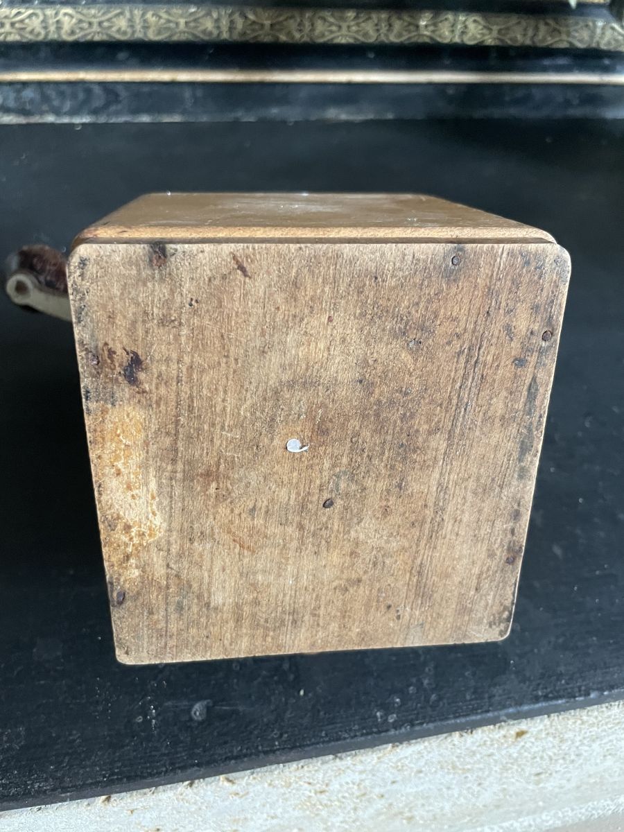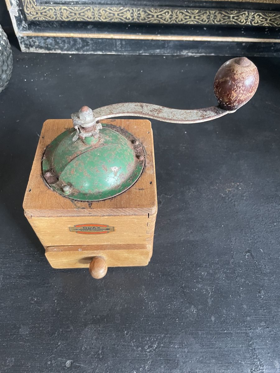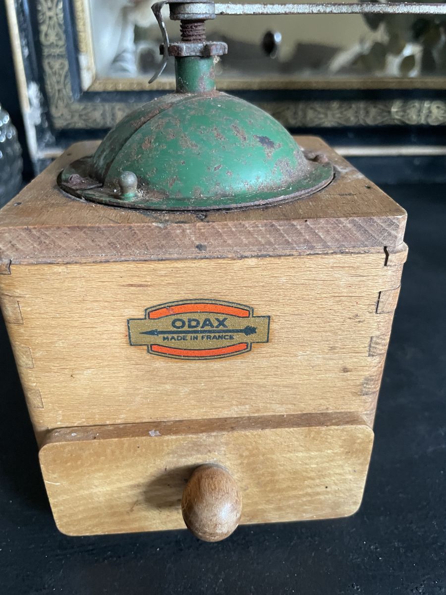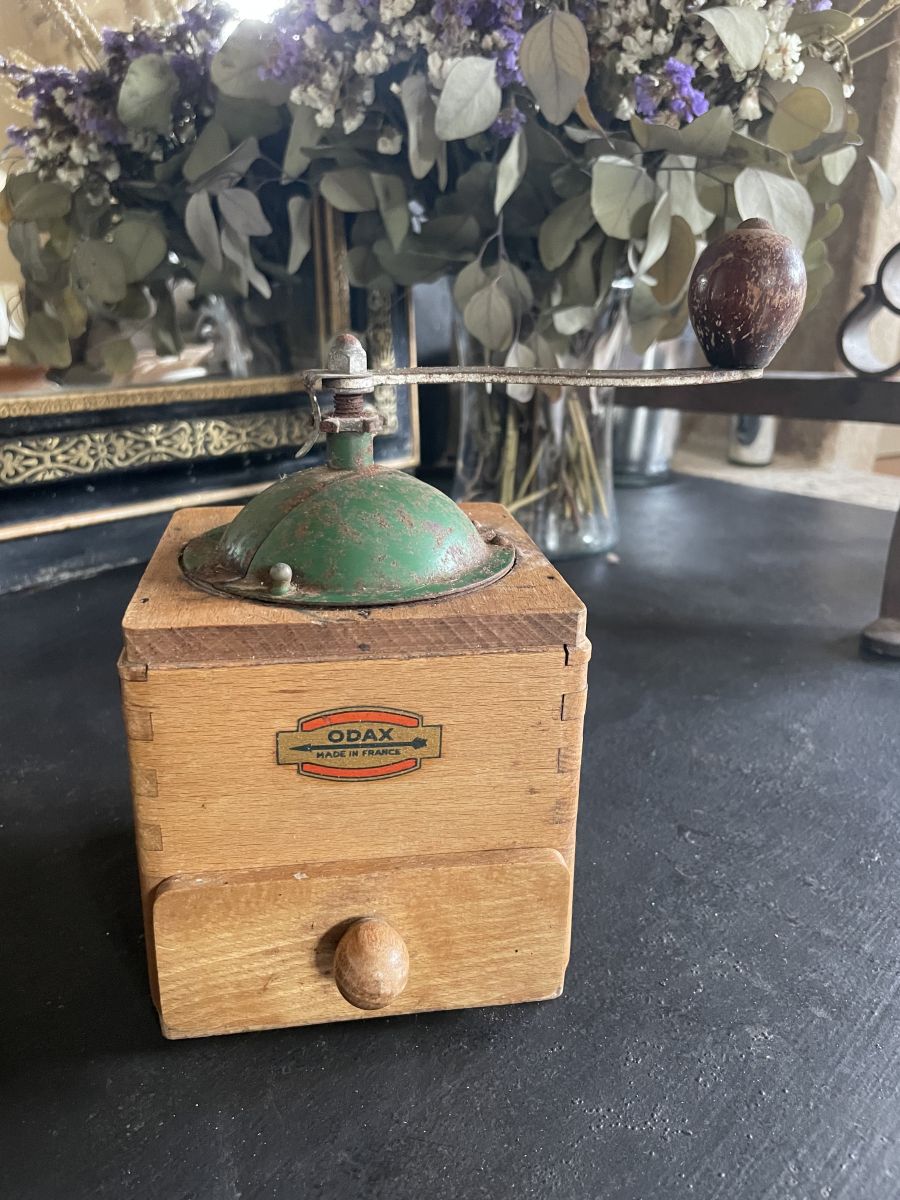 Joli moulin à café de marque ODAX (a priori fabriqué par Peugeot dans les années 1950) avec son couvercle de couleur verte d'origine.