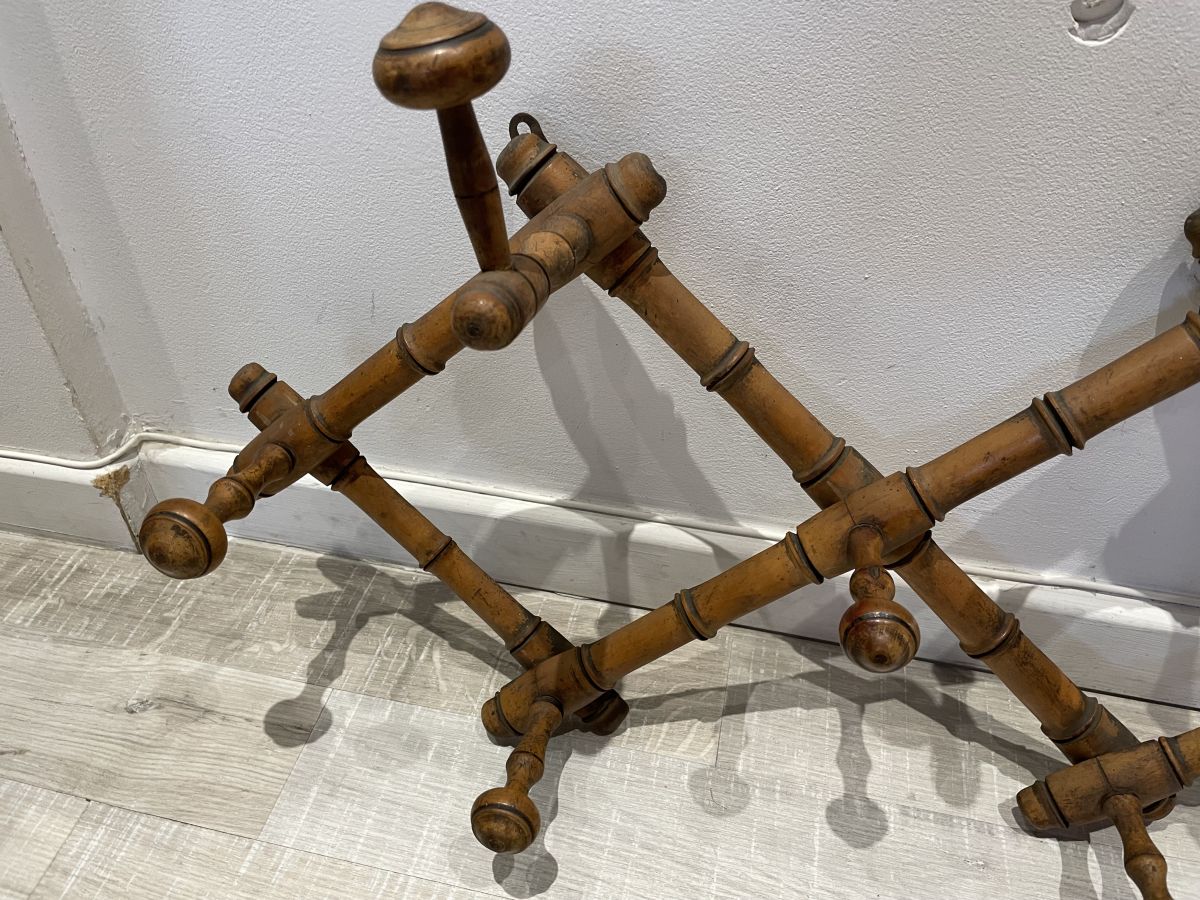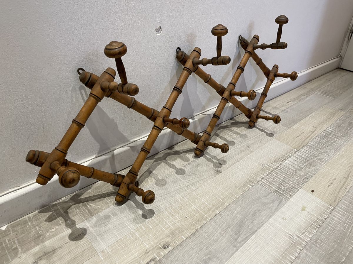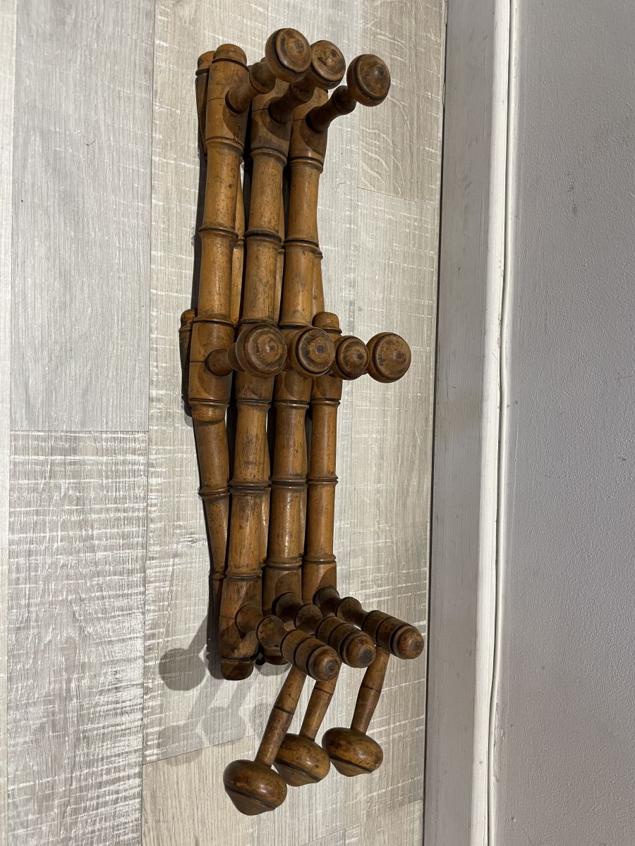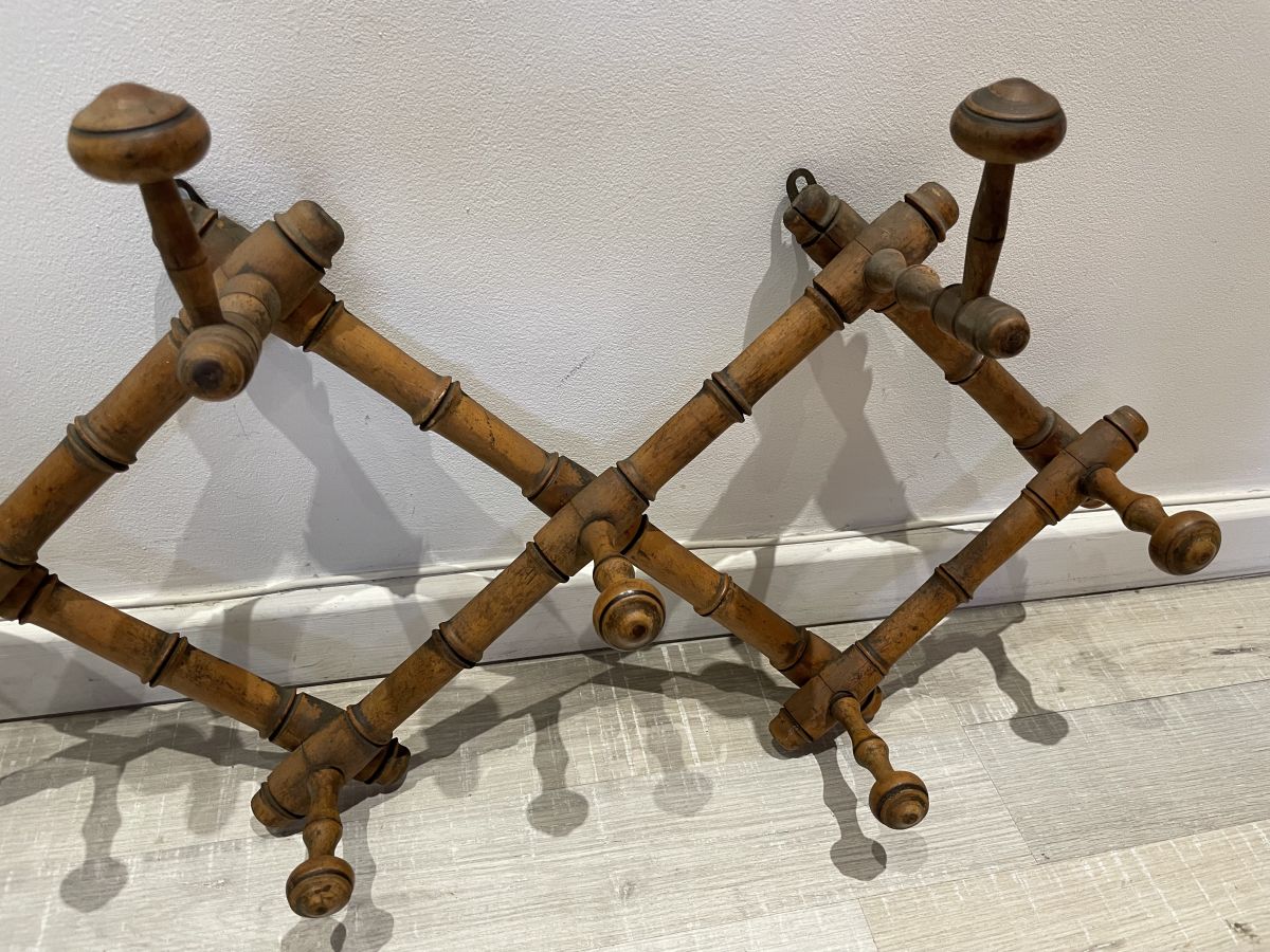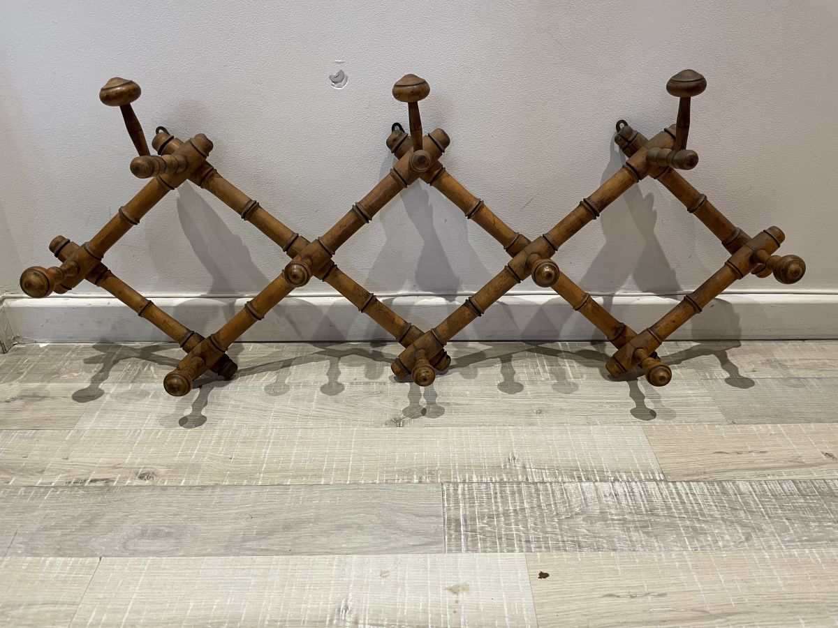 Portemanteau en bois des années 60, dépliant, 8 patères, très belle patine, dimensions (cm) : L.100xH.41xP.16, dimensions plié (cm) : L.55xH.16xP.16, bon état.