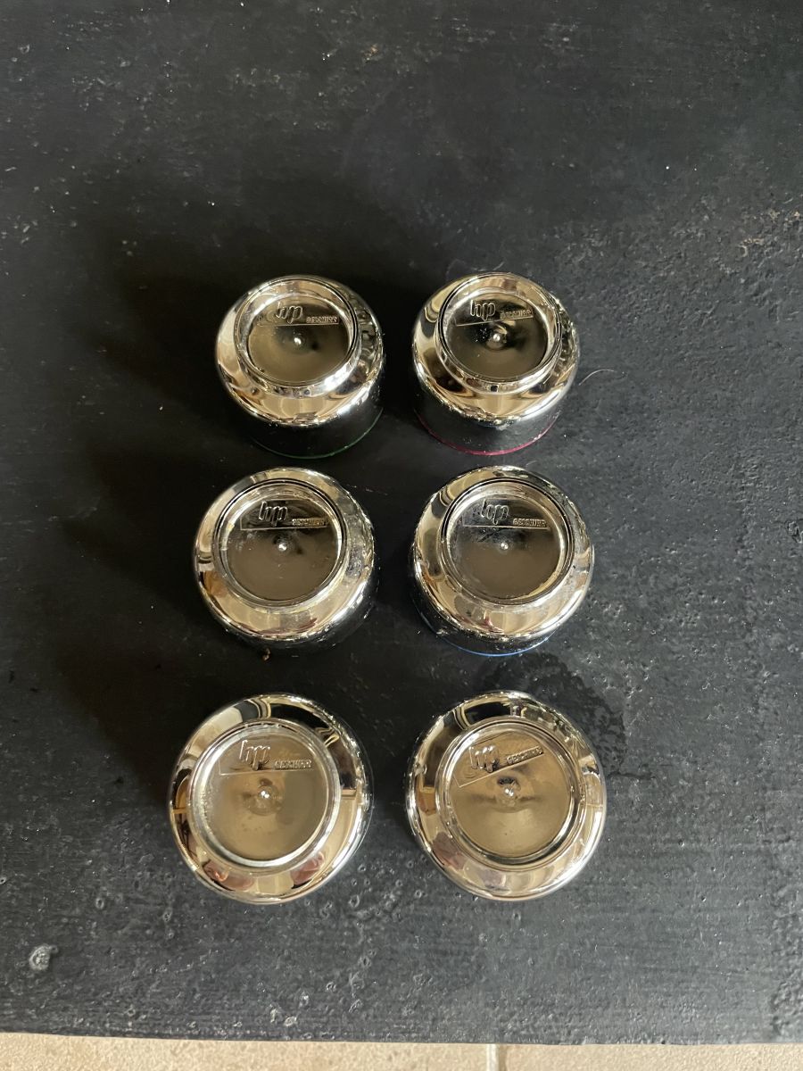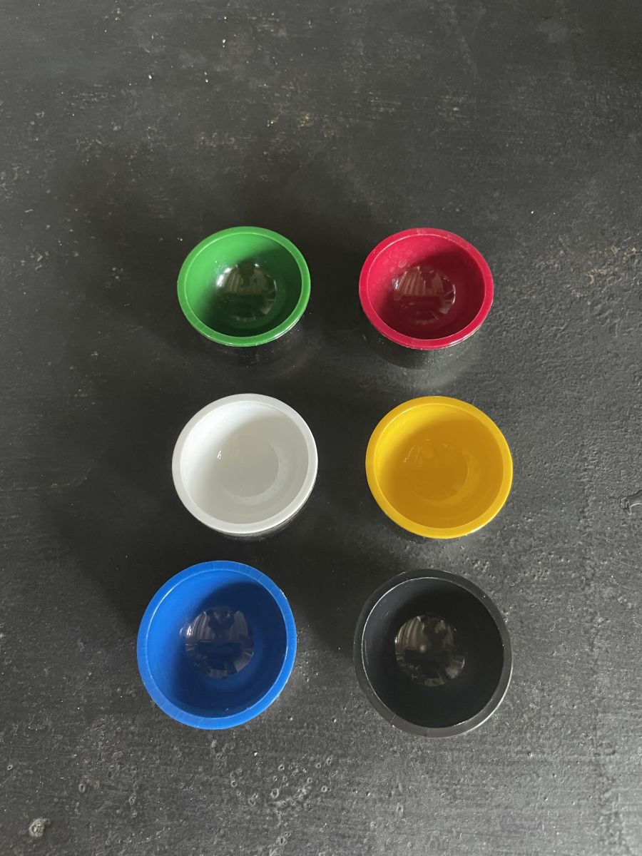 6 petits coquetiers aux couleurs vives: 1 jaune, 1 blanc, 1 rouge, 1 bleu, 1 noir. Marque: HP geschirr. En matière plastique. Très légers ( 100 g les 6)