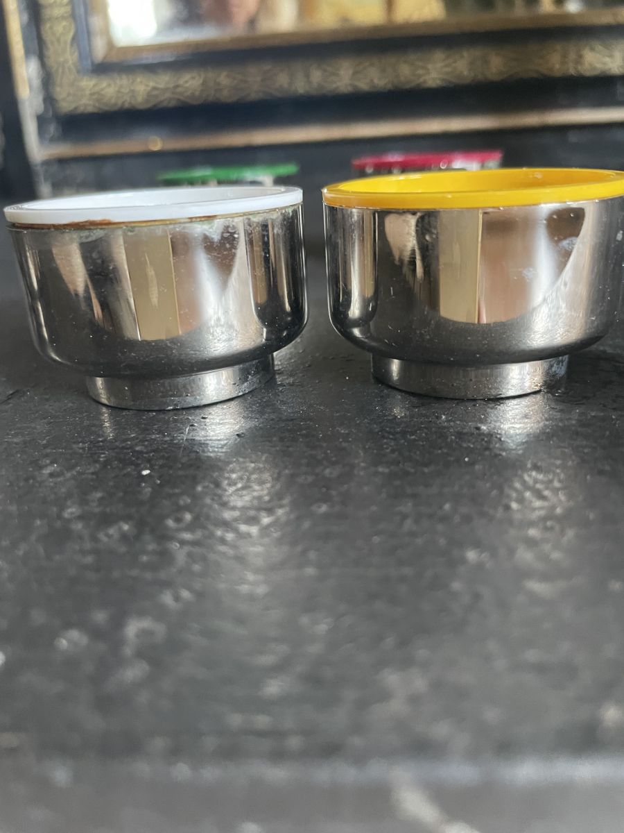 Assez bon état mais la colle qui fait tenir la partie en couleur dans le pied "argenté "du coquetier ne tient plus. Le coquetier bleu et le vert nécessitent d'être refixés avec un peu de colle. Diamètre: 4,5 cm, Hauteur: 3 cm
