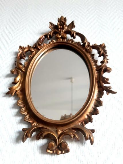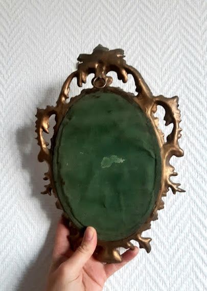 Petit miroir ovale vintage, travail de style rocaille en bois doré. Anneau d'accrochage à l'arrière.