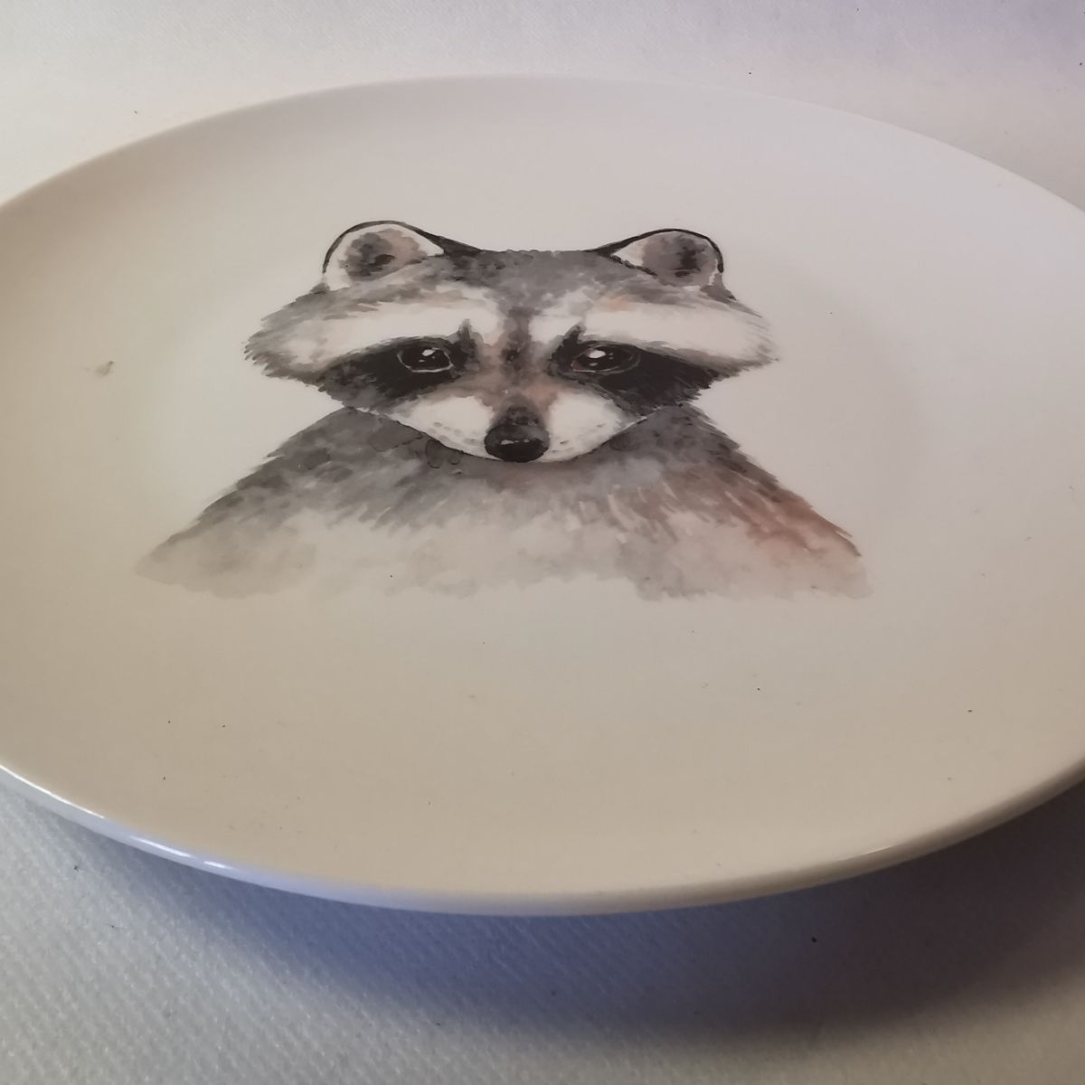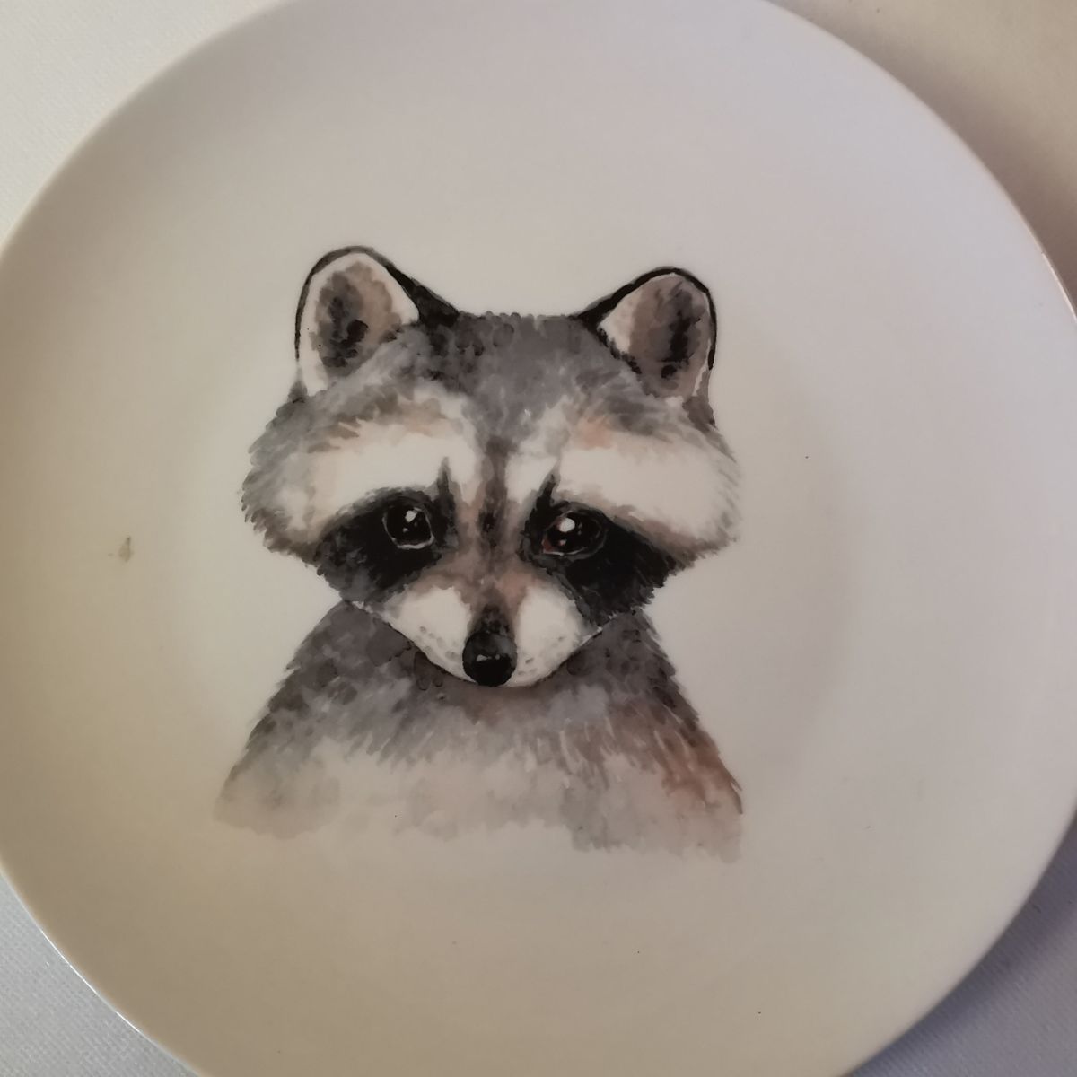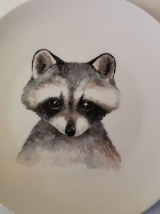 JOLIE Assiette Finement peinte au décor d'un Raton Laveur signée Wonder Wall avec son attaché murale