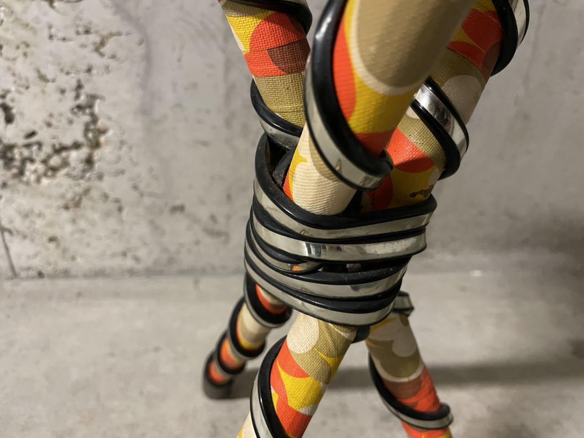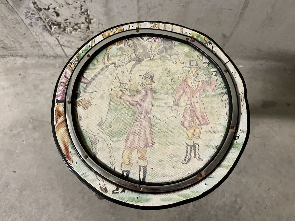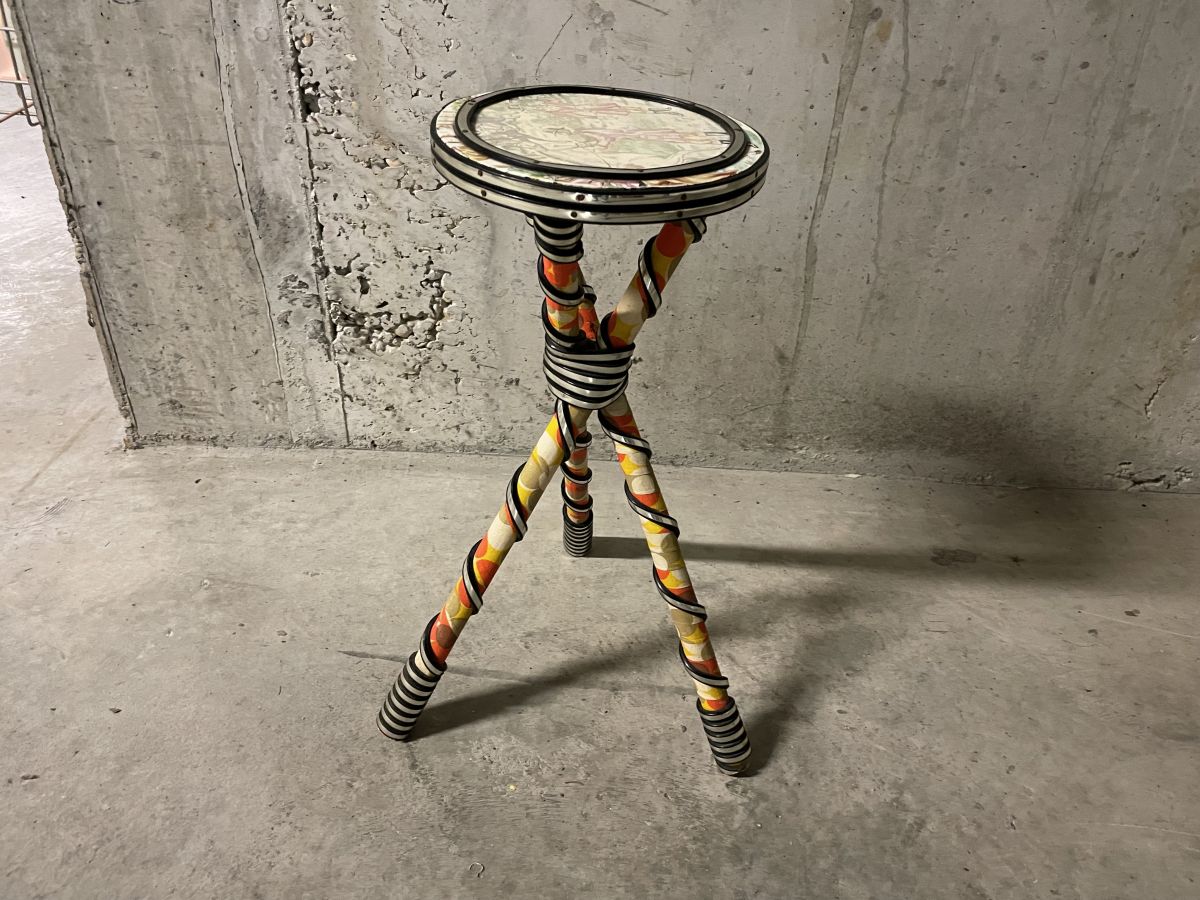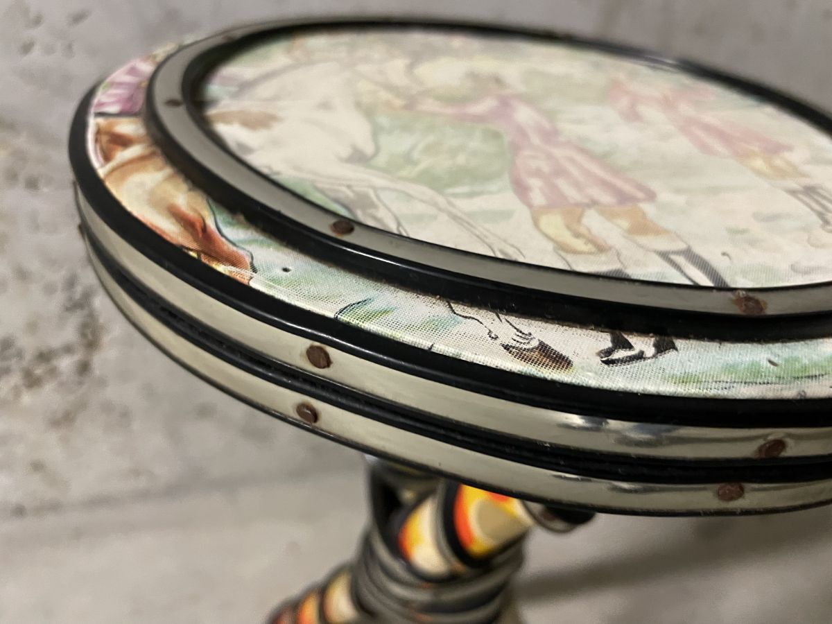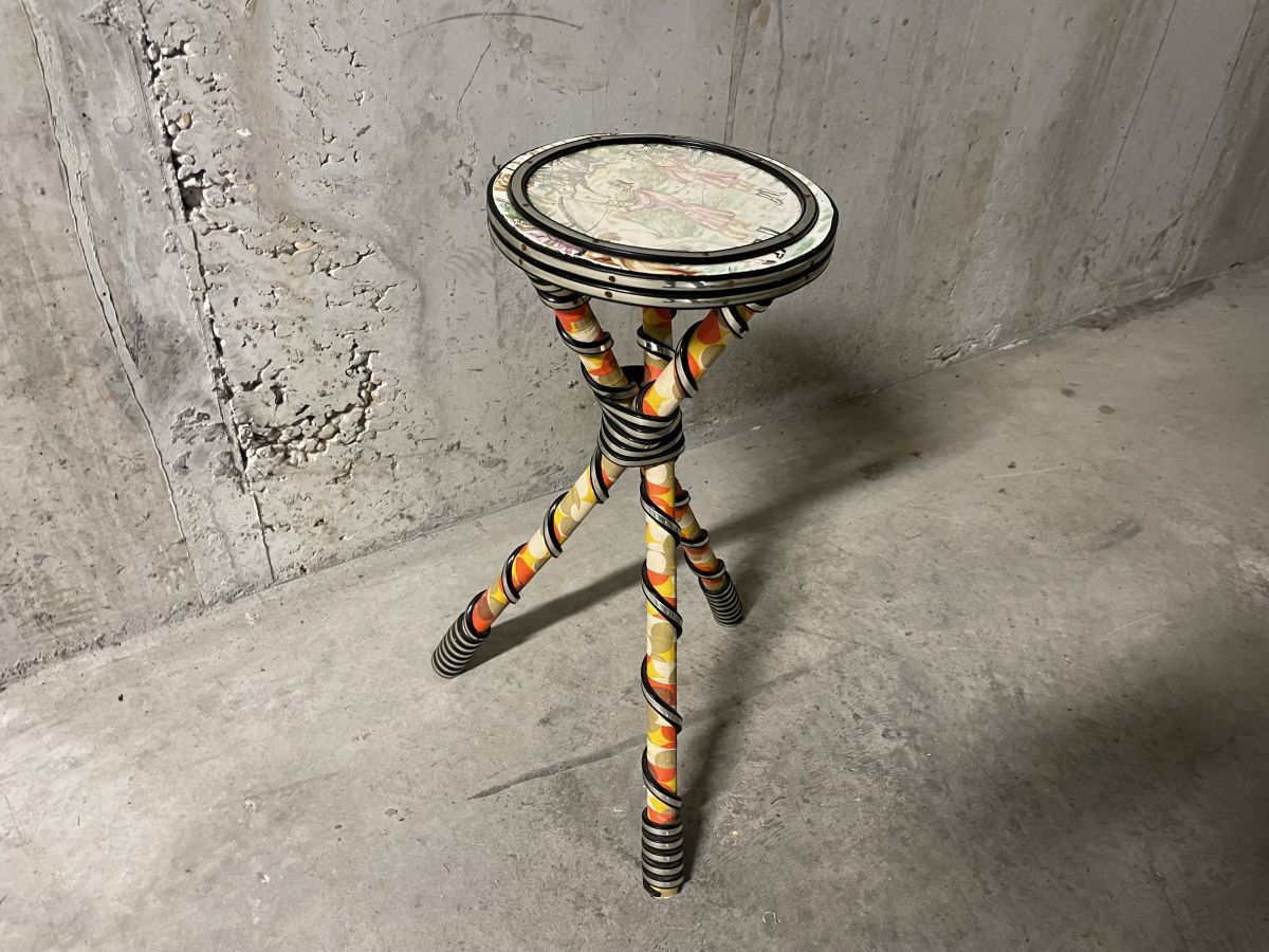 Petit guéridon artisanal et original des années 70, plateau cerclé représentant une scène de chasse, piétement réalisé avec du papier peint et des lanières, style kitsch psychédélique des années 70, hauteur 50cm, diamètre du plateau 22cm, diamètre du piétement 33cm, bon état.