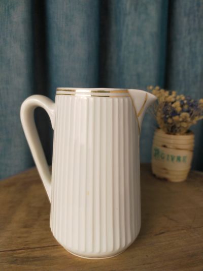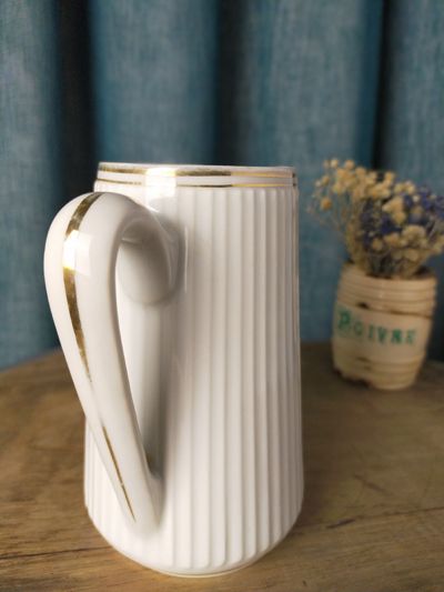 Petit pot à eau en porcelaine blanche. Corps cannelé, liserets dorés sur l'anse et le bord haut, un peu éffacé par endroit. Production : Porcelaine de Luxe de la Compagnie Nationale, CNP du Berry, Vierzon.