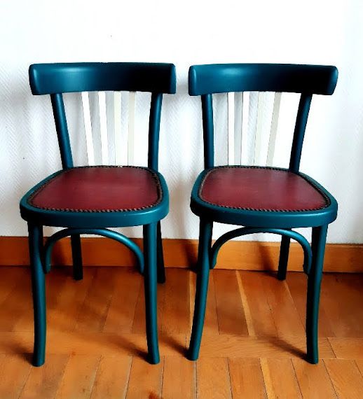Paire de chaises bistrot en bois, travail vintage repeint. Corps de la chaise repeint en vert émeraude, barreaux du dossier en vert très clair, assise recouverte bordeaux.