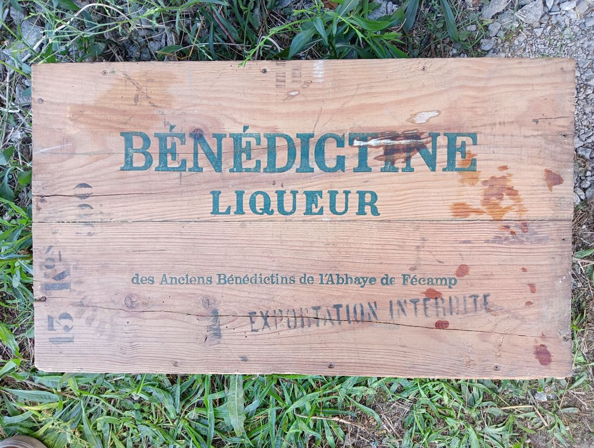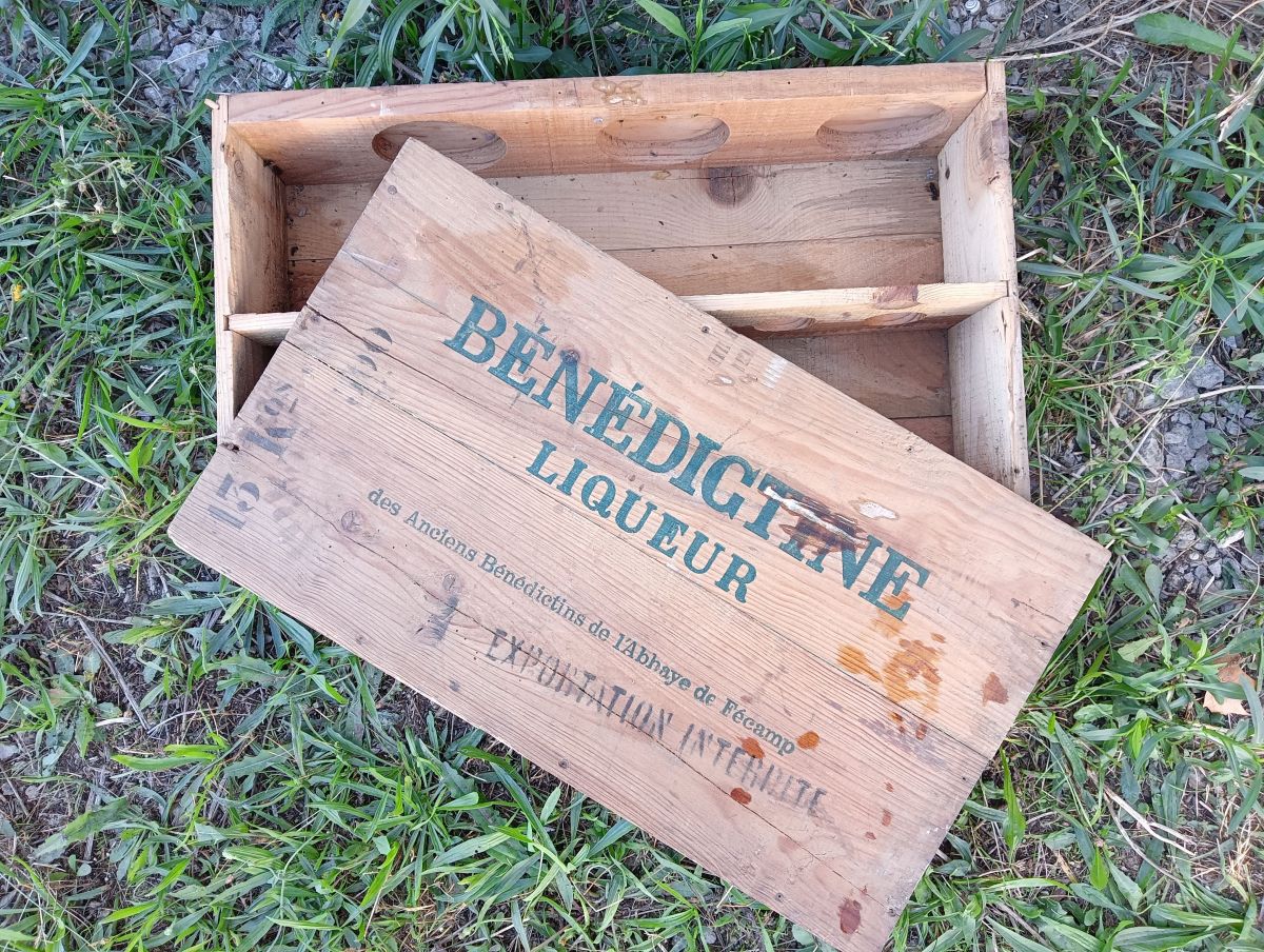 Caisse ancienne en bois, contenance 6 bouteilles(non fournis) liqueur des anciens Bénédictins de l'Abbaye de Fécamp, c'est une caisse d'origine, il y a juste le plateau du dessus qui pivote ou peut s'enlever car il y a un clou. Dimensions: longueur 56 X largeur 34 X hauteur 13 cm.