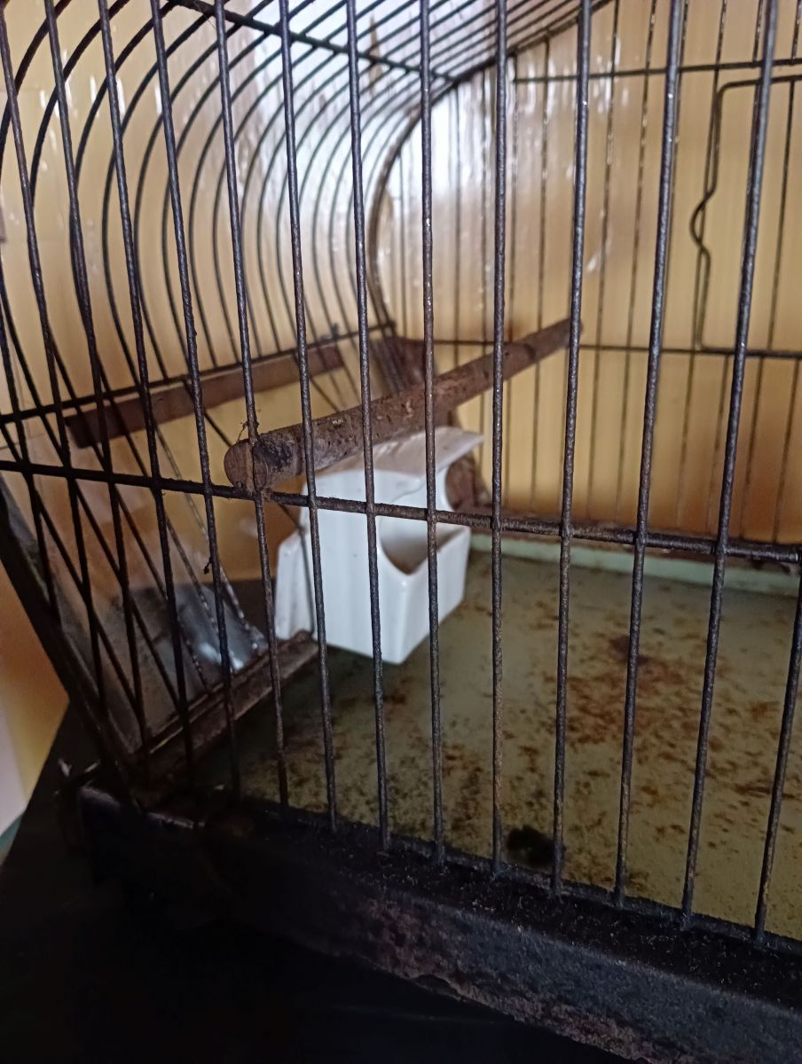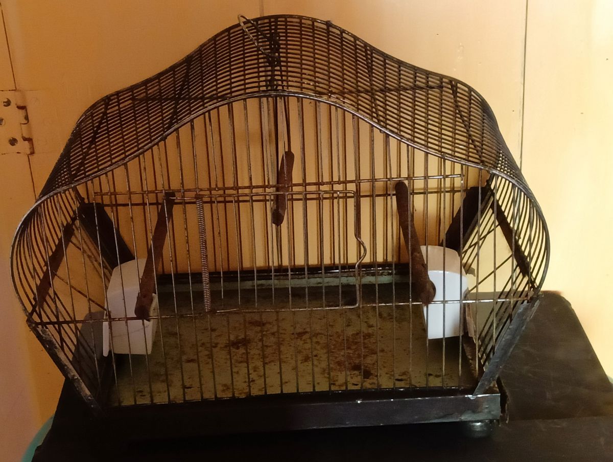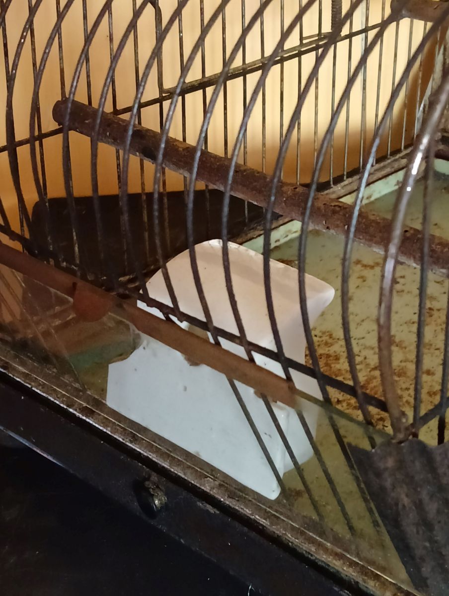 Cage à oiseaux en métal avec mangeoires en porcelaine.