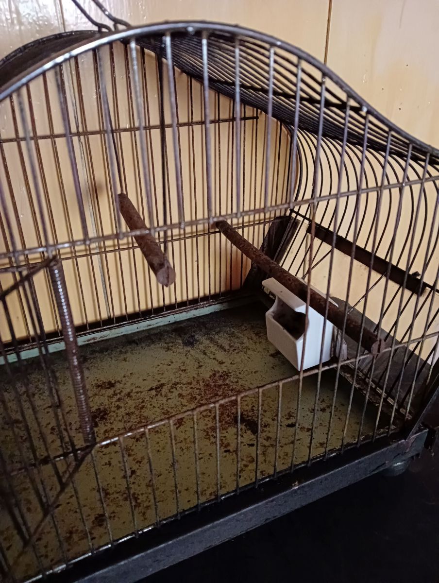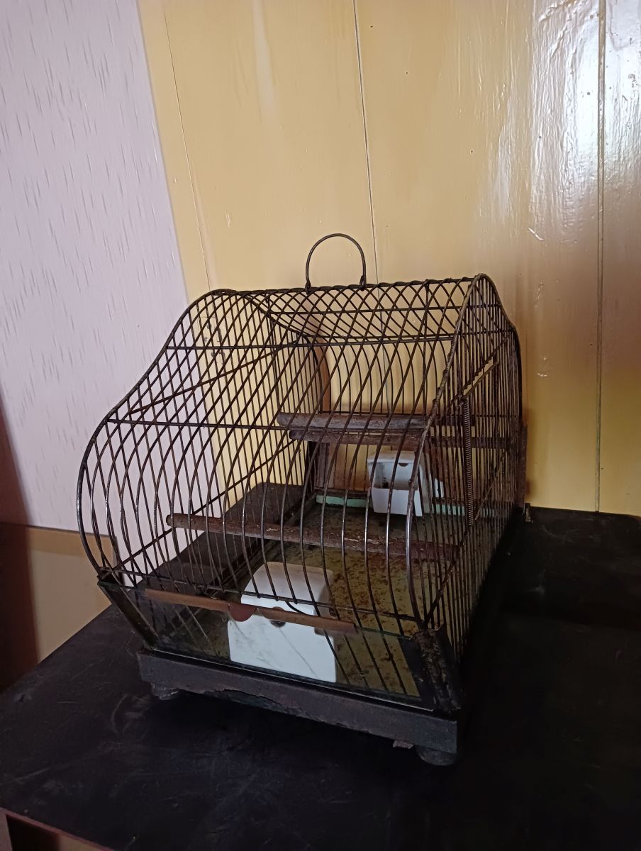 Cage à oiseaux en métal et inox(presque disparue par le temps) encore visible à quelques endroits, elle possède deux plateaux en métal dans le fond, les deux mangeoires sont en porcelaine, une et abimée mais tient parfaitement, deux vitres protègent les mangeoires, il y aune porte fonctionnelle, perchoirs et balançoire en bois, un anneau de maintien, il y a des défauts dus au temps, la cage a été entièrement nettoyer, c'est un bel objet de déco solide ou tout simplement pour s'en servir. Dimensions: hauteur 30 X largeur 41 X profondeur 23 cm.