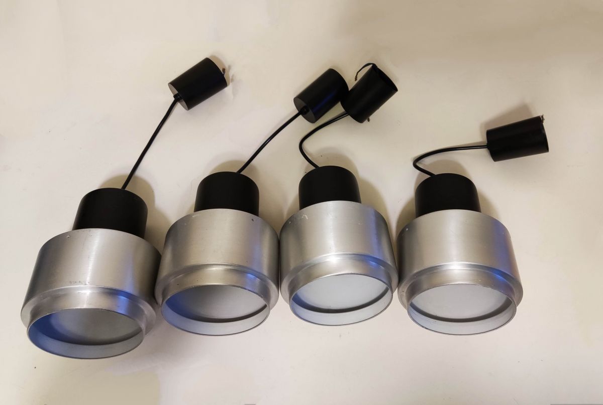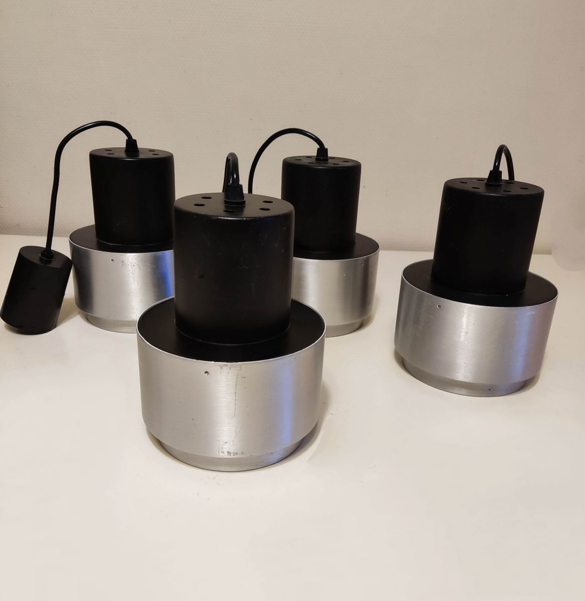 lot de 4 lustres vintage en alu brossé et métal noir avec douille en porcelaine