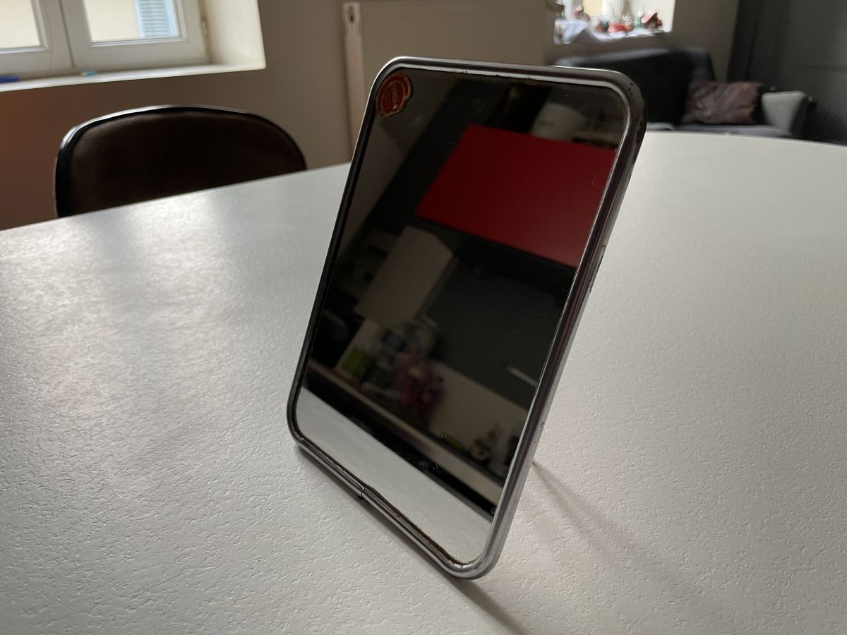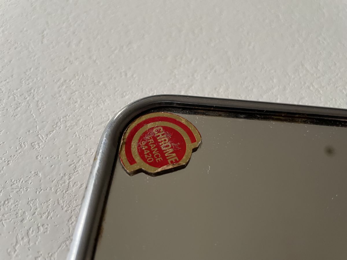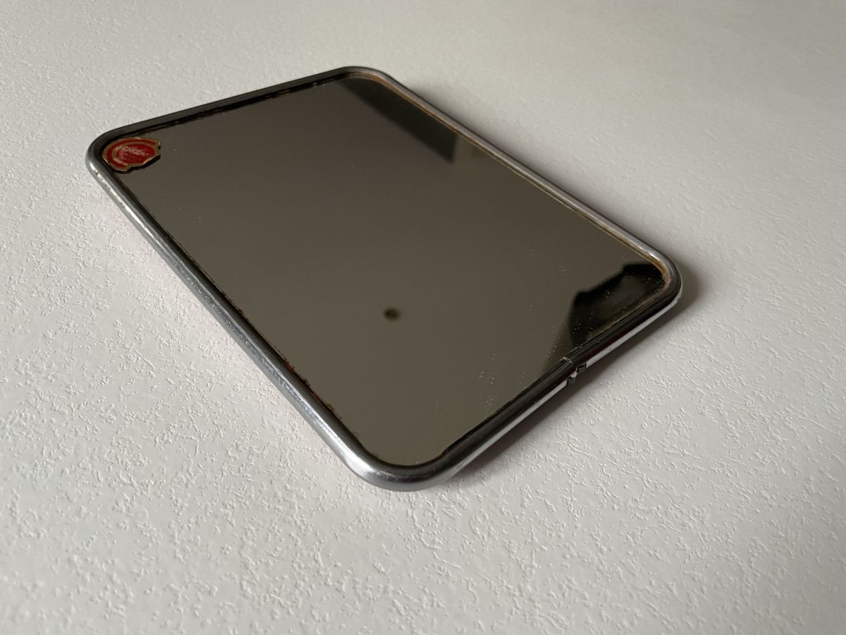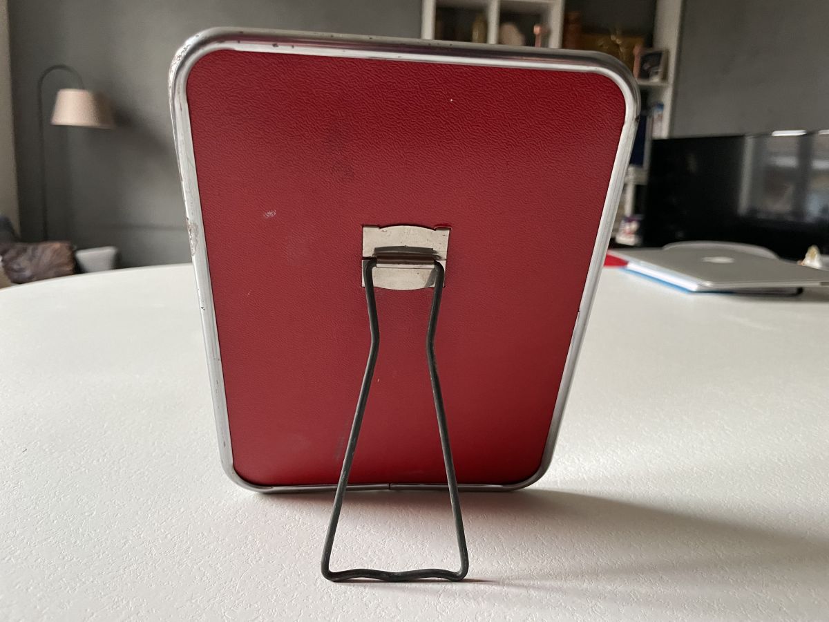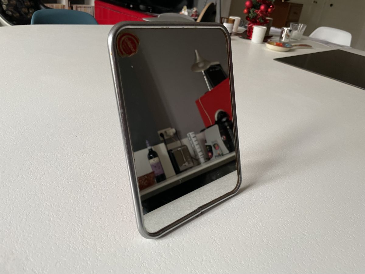 Miroir de barbier ancien des années 50 à poser ou à suspendre, 20x15cm, glace chrome 18x14cm, fabrication française (estampille), dos en skaï rouge, bon état.