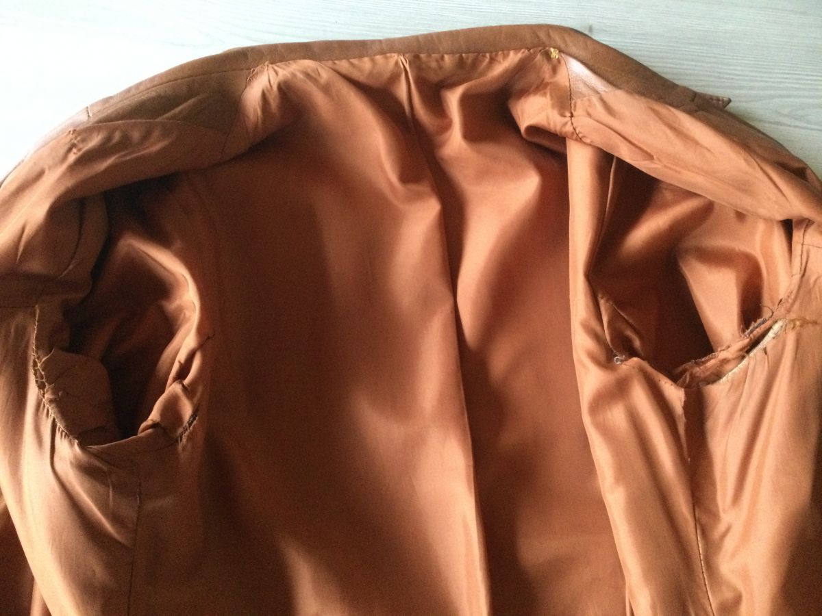 La doublure est à recoudre sous les bras (cf photo) ainsi que la poche gauche mais cuir en parfait état. Vendu ce prix à cause du col en fourrure qui peut d’ailleurs être mis sur n’importe quelle autre veste ou manteau à col croisé.