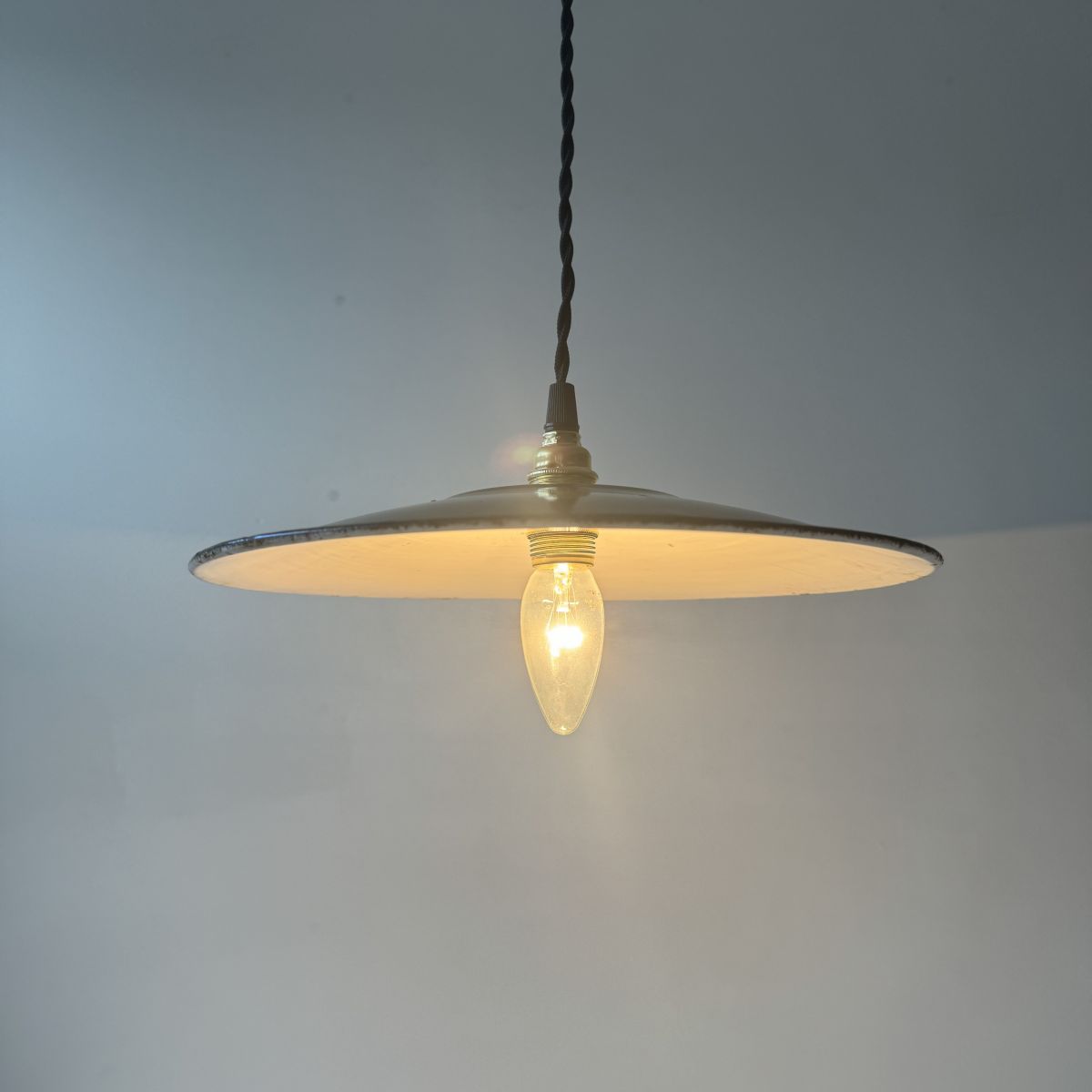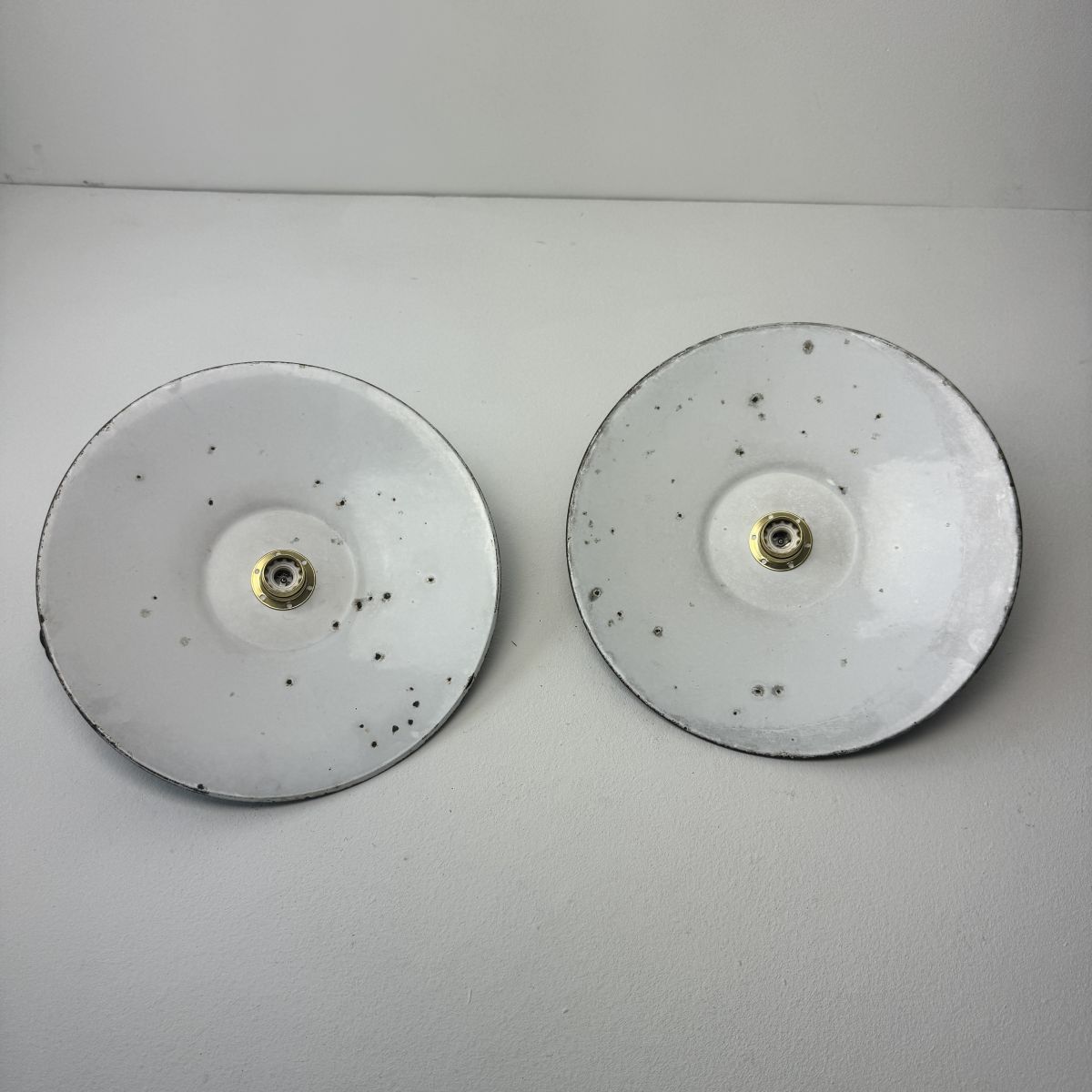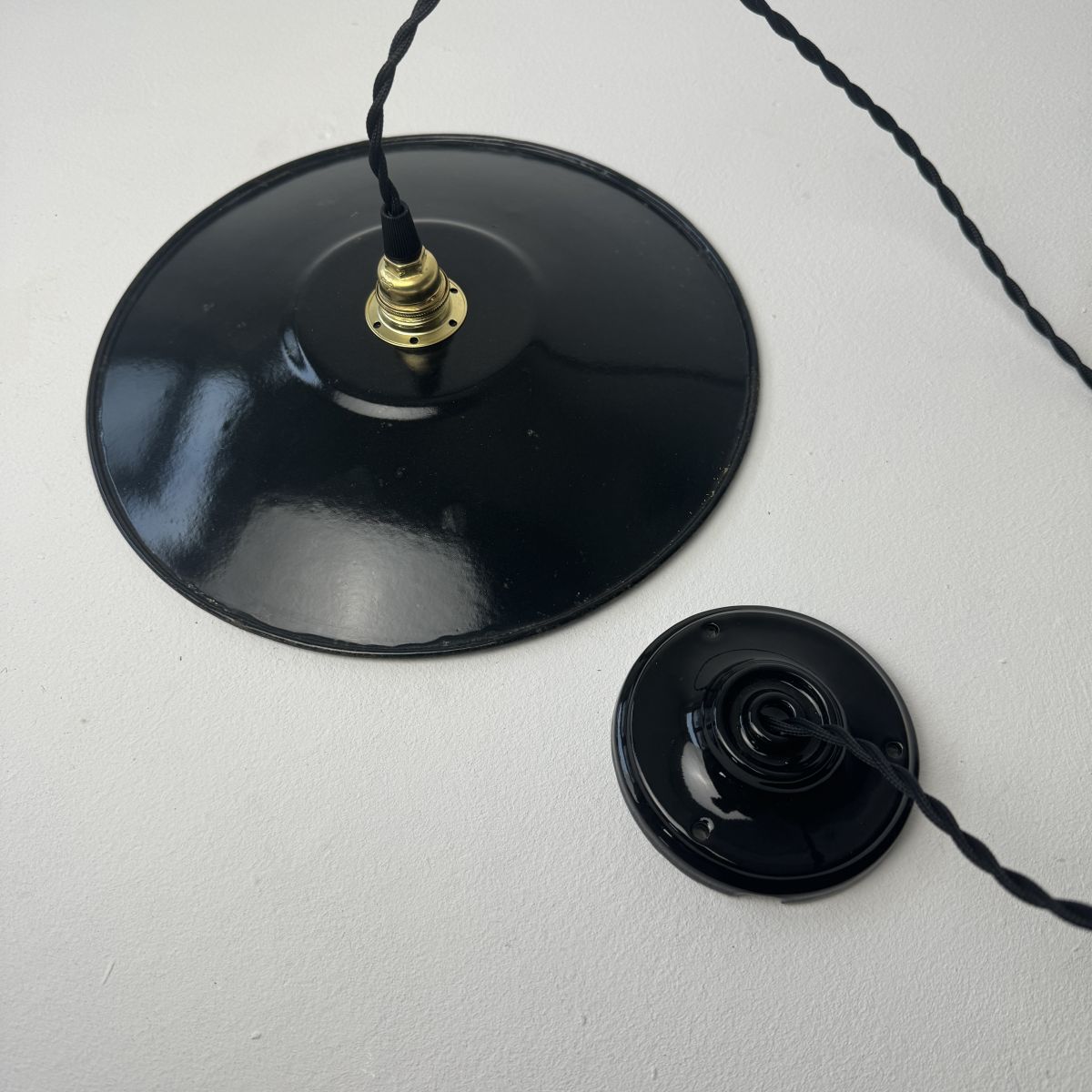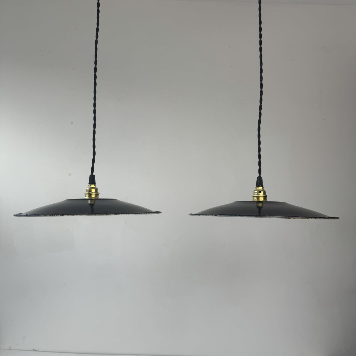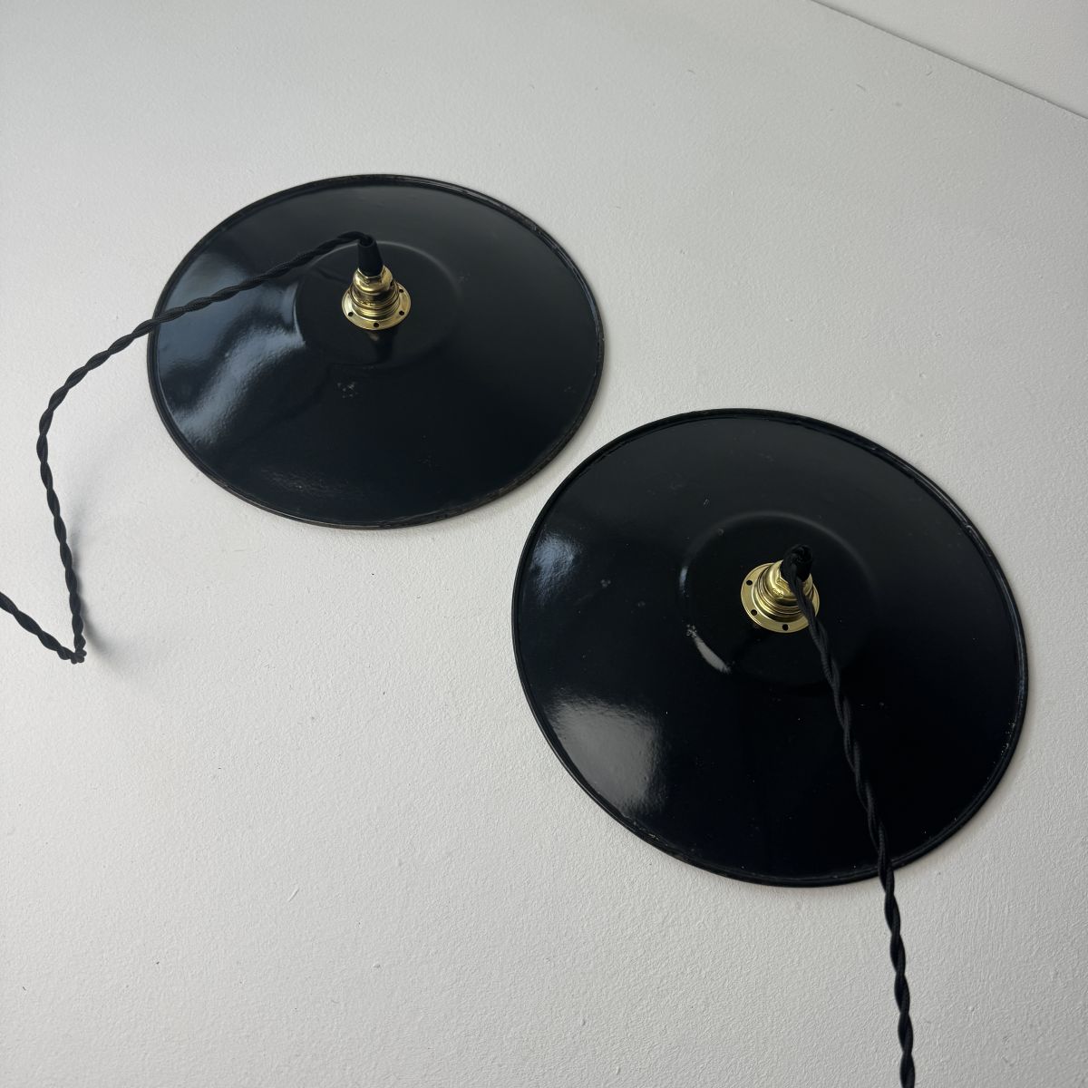 Lot de 2 suspensions en tôle émaillée plates. Noires. Quelques sauts d’émail et de nombreux points de rouille dus à leur passé industriel