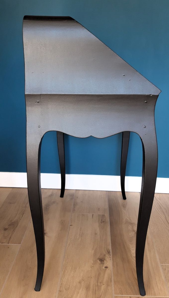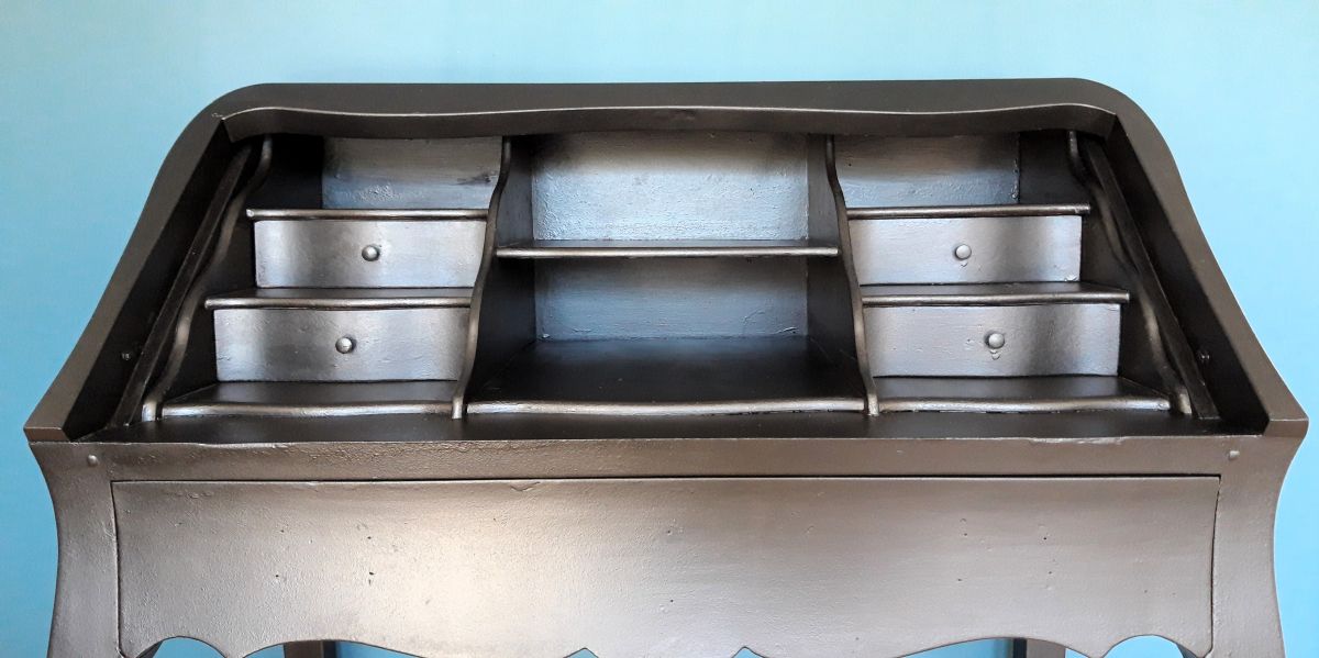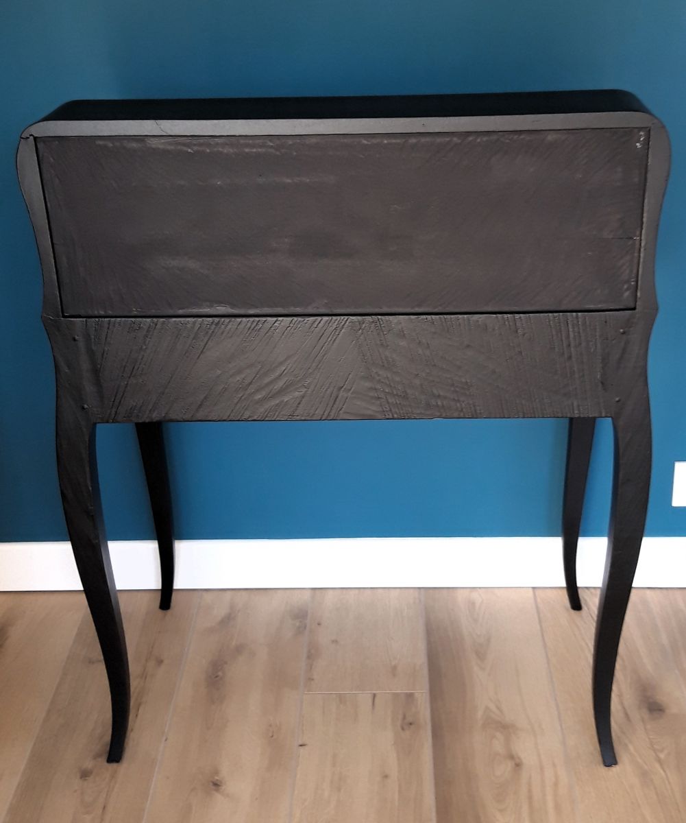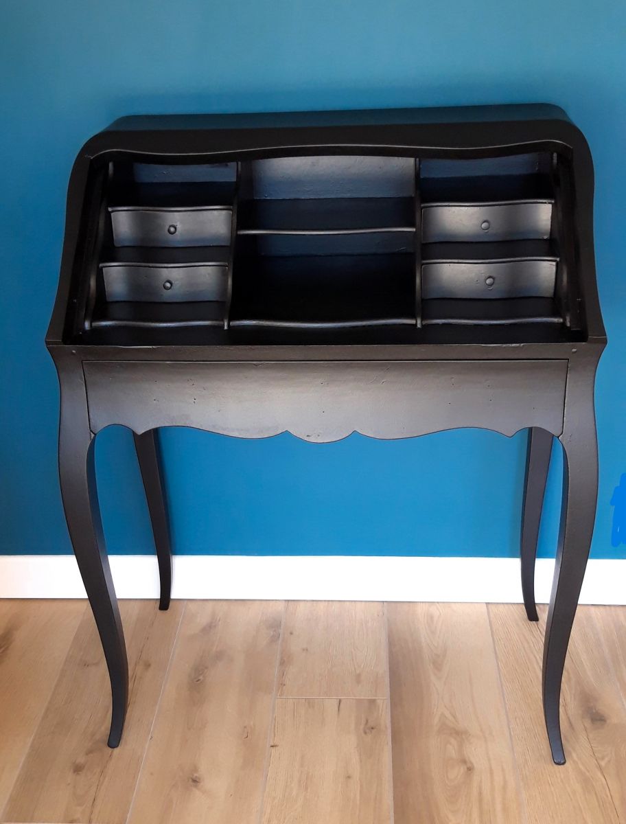 Ancien secrétaire tout en bois repeint en noir satiné (donc lessivable, facile d'entretien). L'abattant a été retiré pour faire apparaitre ses formes arrondies. Il comporte 2 petits tiroirs, 2 moyens et un grand ainsi que 4 niches. Parfait pour y ranger des clés et autres papiers ou accessoires dans une entrée ou un salon.