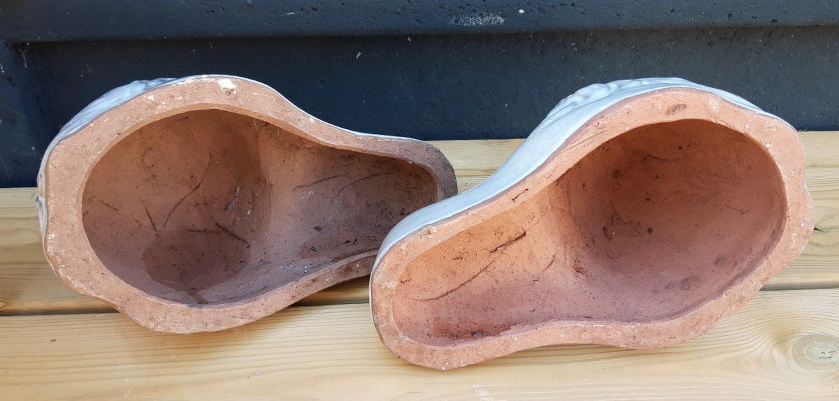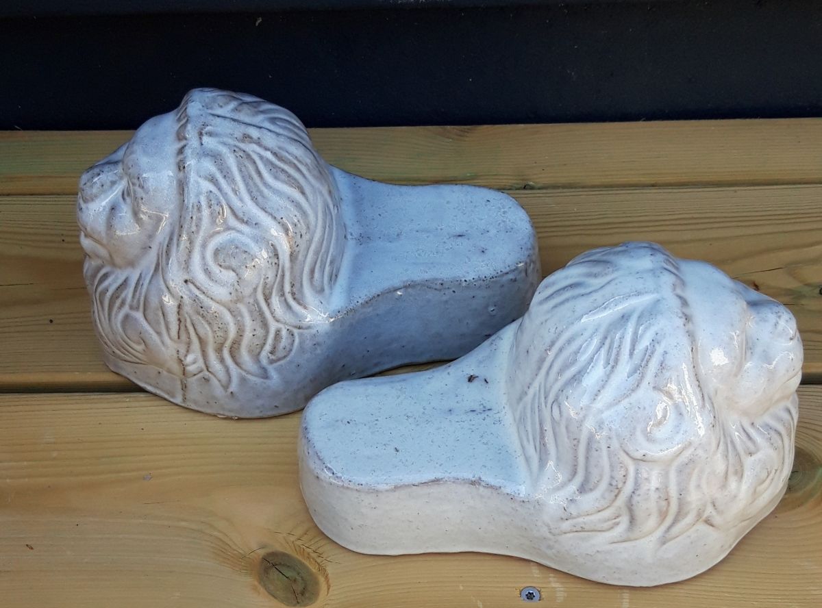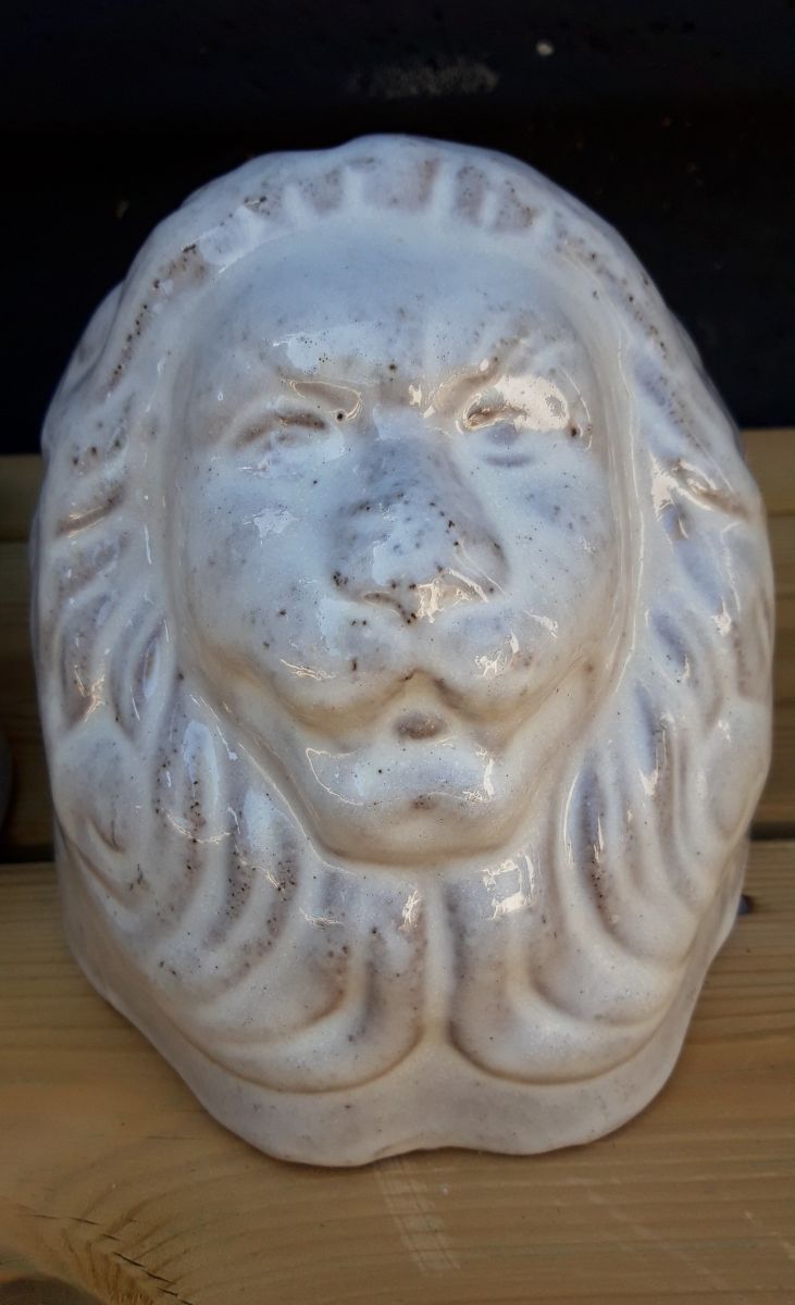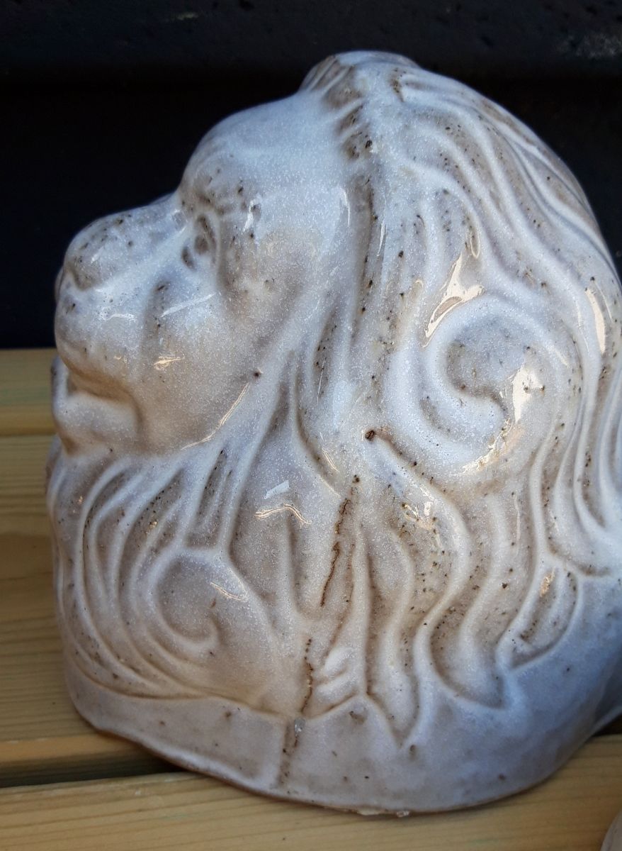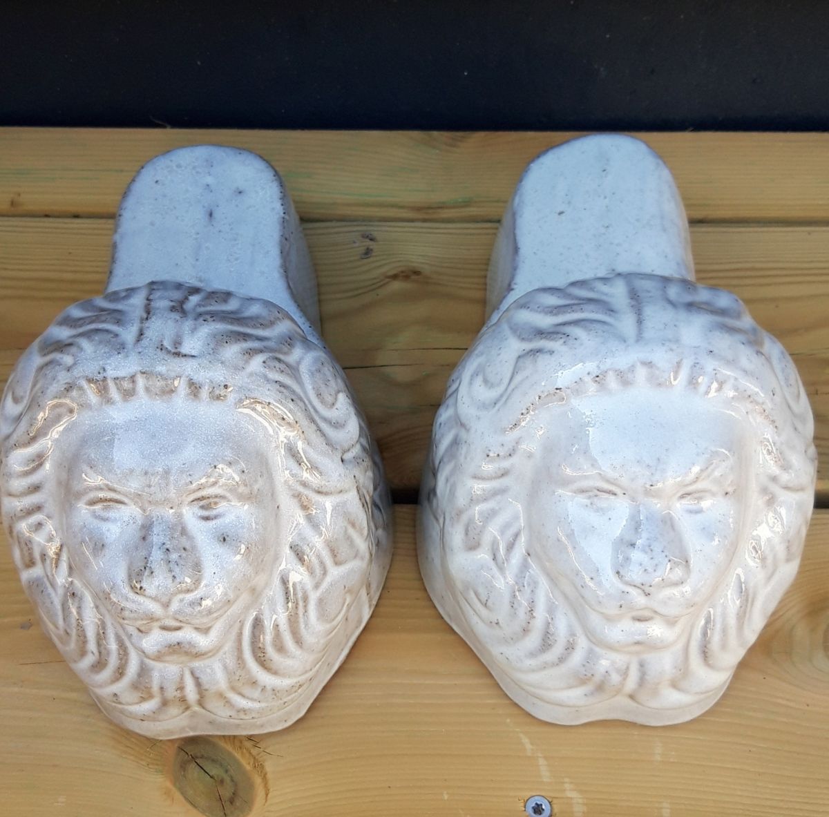 Paire de belles céramiques en forme de tête de lions pour poser un pot de fleurs, un photophore... Cela fera un joli effet dans votre jardin ou sur votre terrasse.