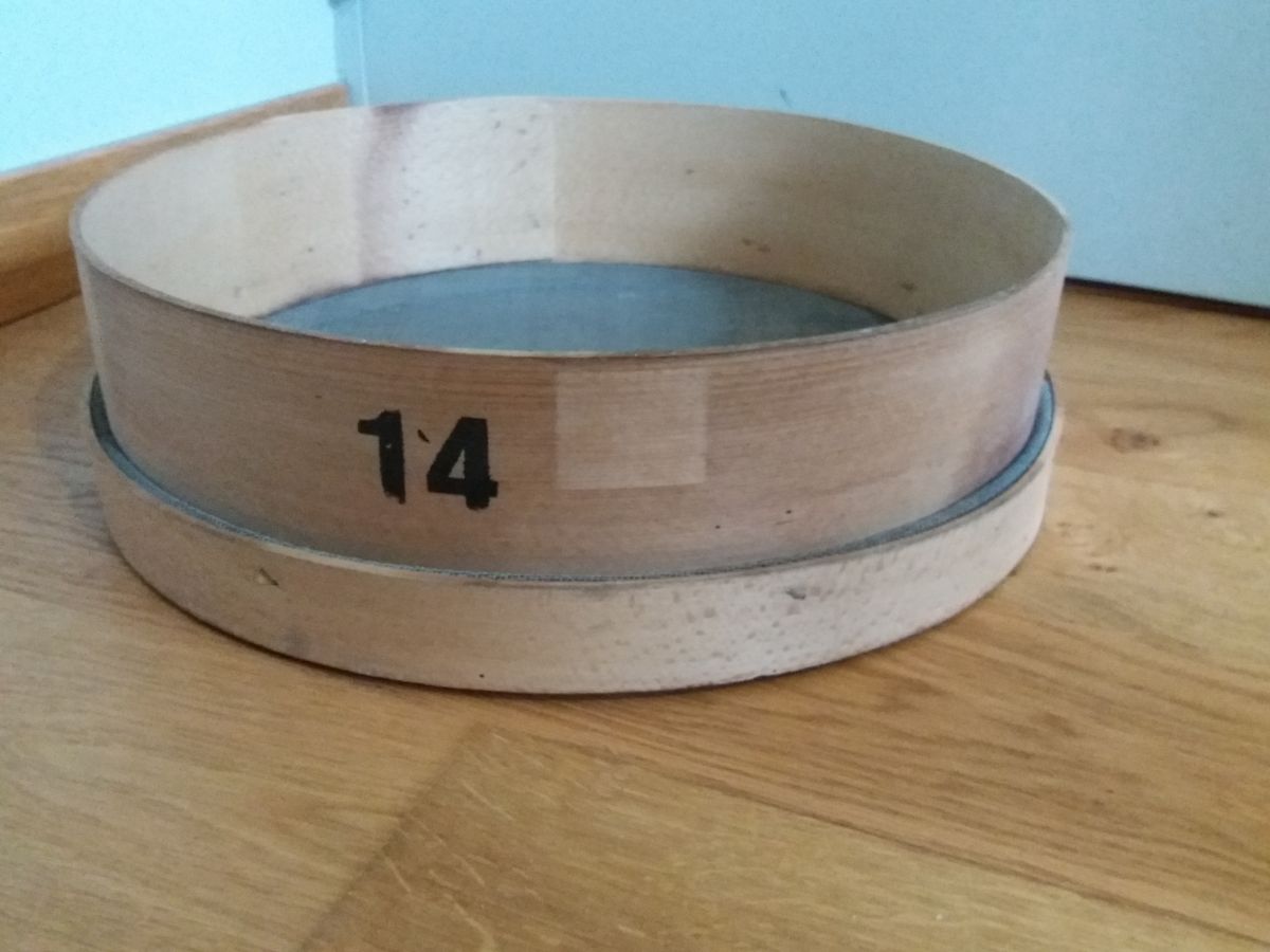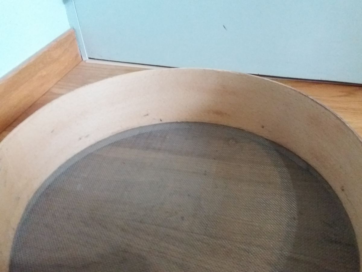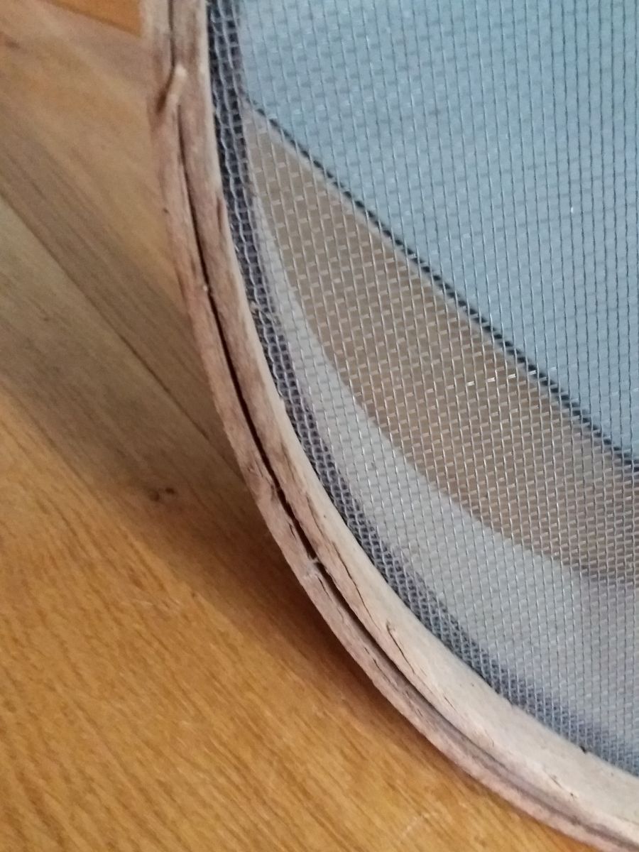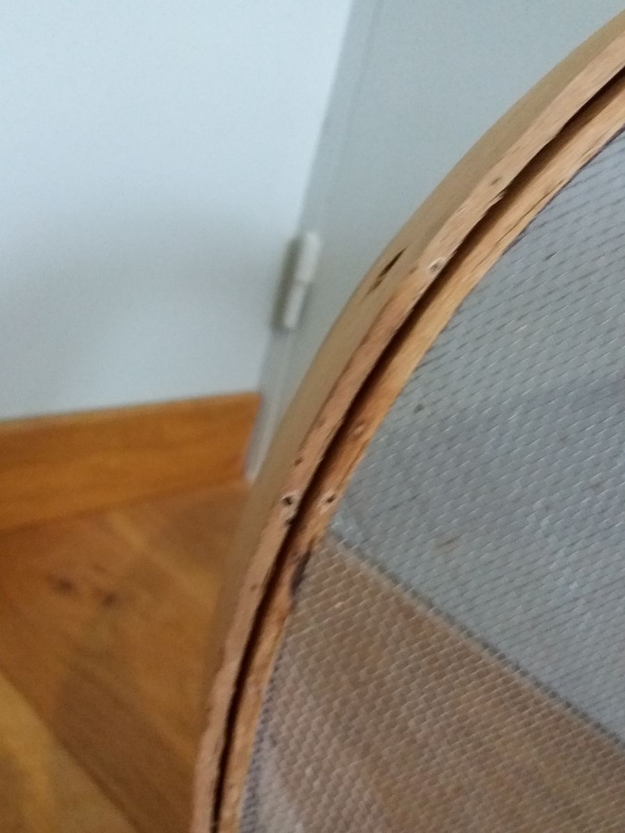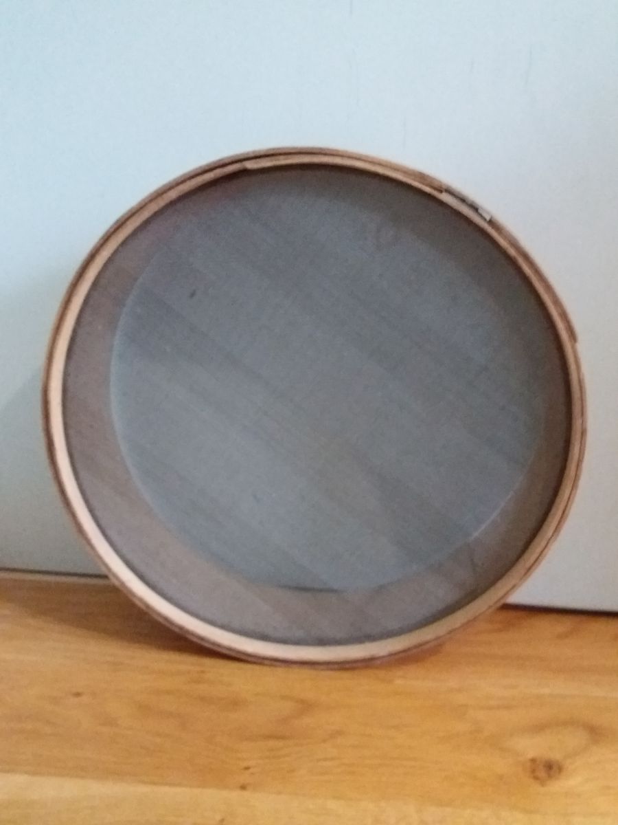 Ce tamis en bois et grillage en métal pourra être utilisé pour son usage premier, en maçonnerie ou au jardin pour tamiser du sable ou des graines, car il est tout à fait fonctionnel. Le marquage 14 dessus indique, j’imagine, la finesse de la grille de tamisage. Mais on pourra aussi le revisiter comme étagère, lampe en applique, porte-boucle d’oreilles, les idées ne manquent pour sur le web… Il n’a vraisemblablement jamais été utilisé car dans un bel état, mais doit dater des années 80 ou 90 car il comportait encore une étiquette avec un prix en Francs (qui s’est détachée au dépoussiérage en laissant une marque plus clair sur le bois). Il est donc en bon état, bien solide, amis comporte des petits signes d’un stockage pendant quelques années : une petite tache de corrosion sur la grille et sur le bois une dizaine de trous de vrillettes, non actifs, mais que j’ai tout de même traités par injection de vinaigre blanc dans les trous (c’est ma méthode naturelle pour remplacer l’insecticide chimique) et quelques petites marques ou échardes sur les bords. Il mesure 44 cm de diamètre d’un côté, 42 cm de l’autre côté pour une épaisseur de 12 cm.
