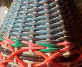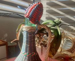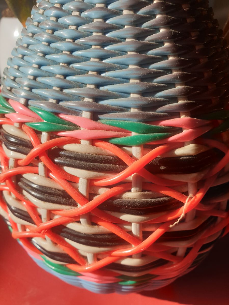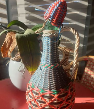 Carafe vintage en verre recouverte d un tressage scoubidou plastique coloré, turquoise, rose,blanc