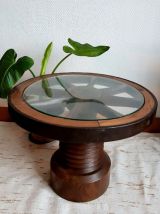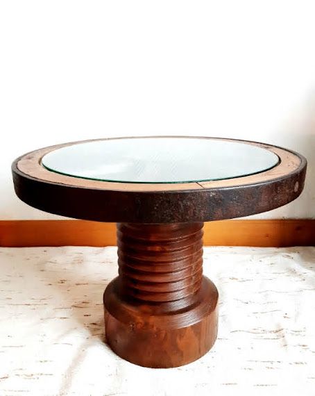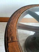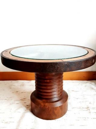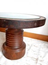 Table lourde en bois massif, le plateau étant formé d'une roue à rayons, cerclée de métal. Le pied en bois en forme de visse rappelle les créations de Charles Dudouyt.
