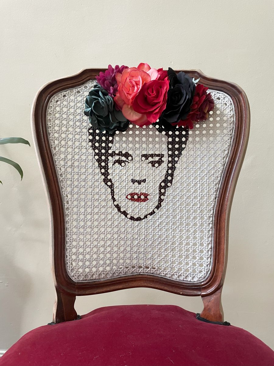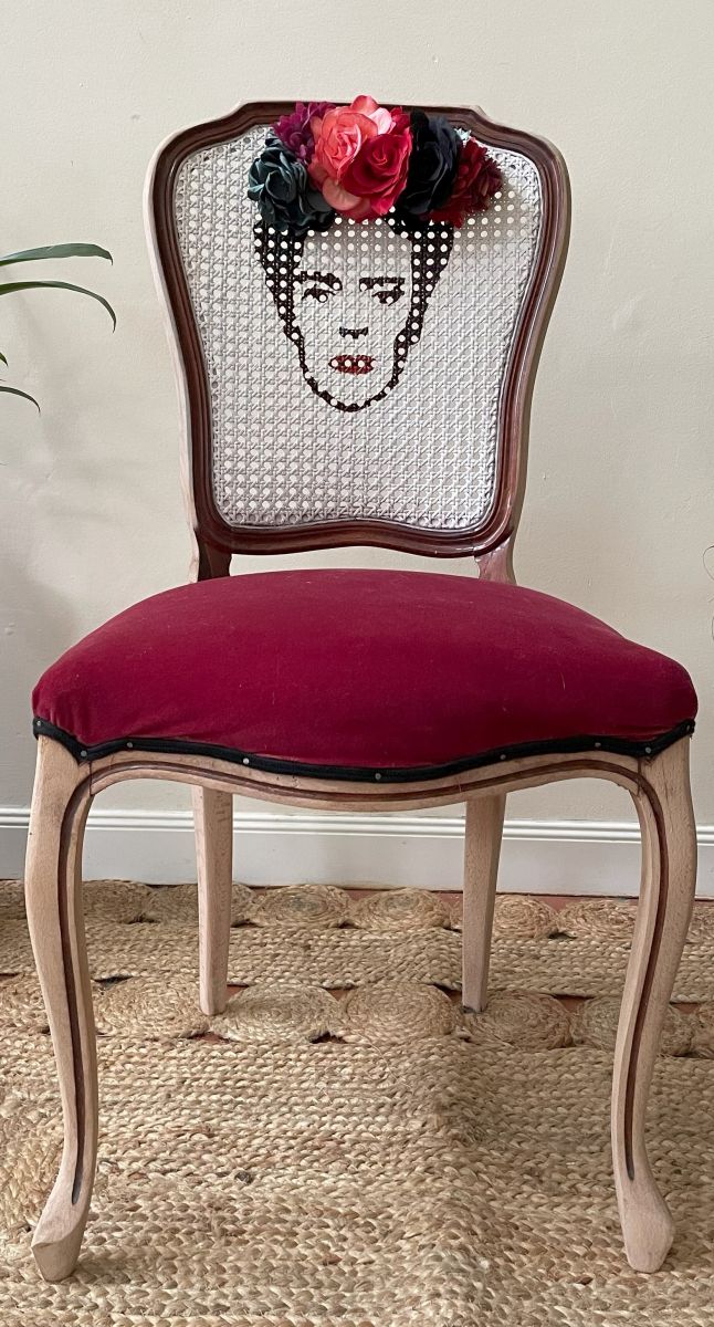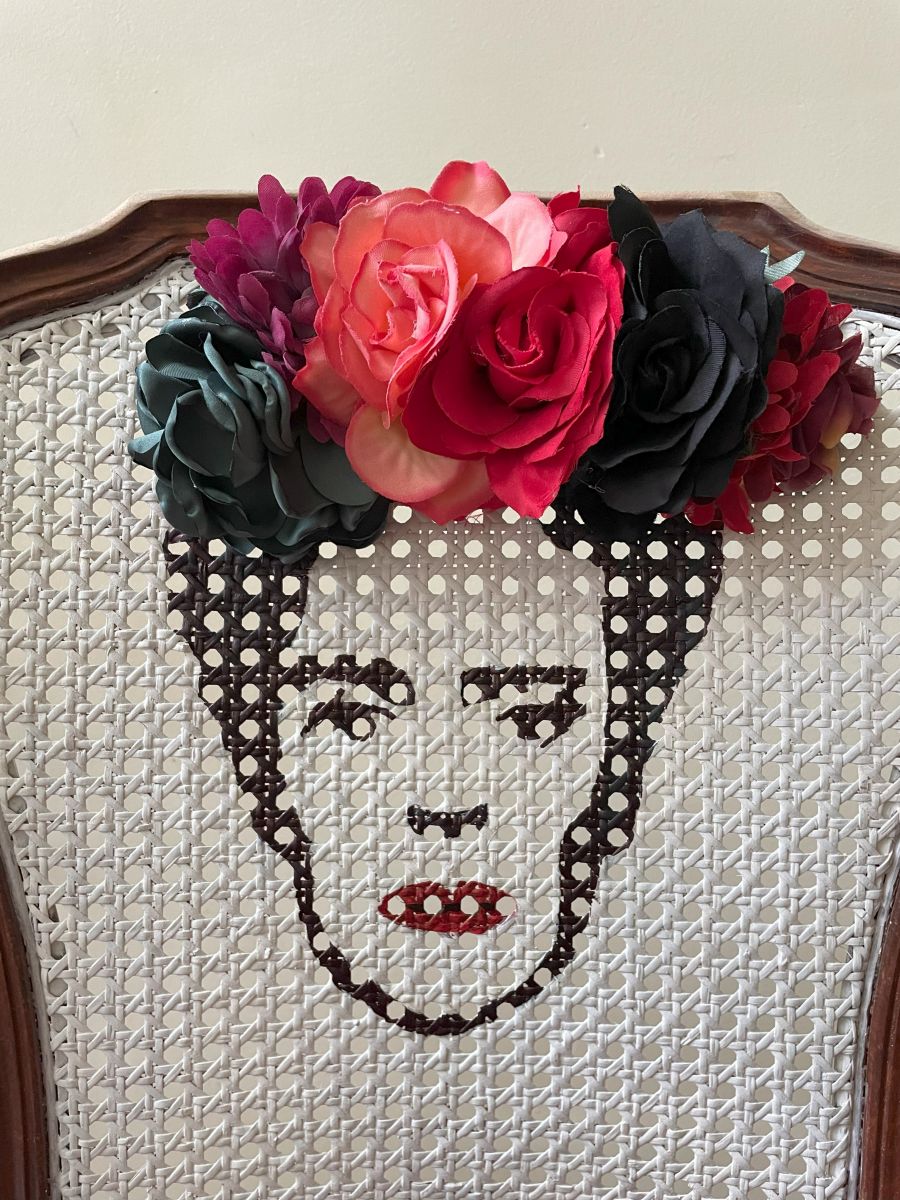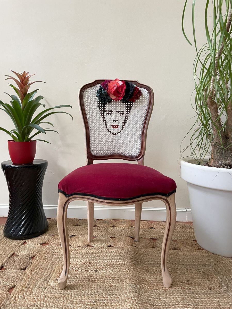 Jolie chaise, poncée en partie pour un effet brut puis repeinte en blanc au niveau du cannage pour y dessiner la tete de Frida Kahlo. A été ajouté un serre-tête fleuri.