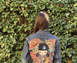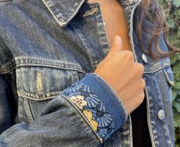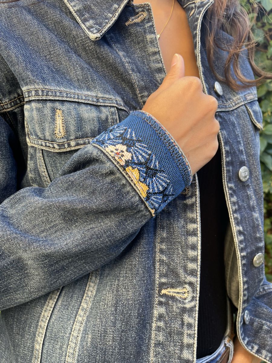 Veste en jean, avec fleurs de différentes couleurs, faites au crochet.