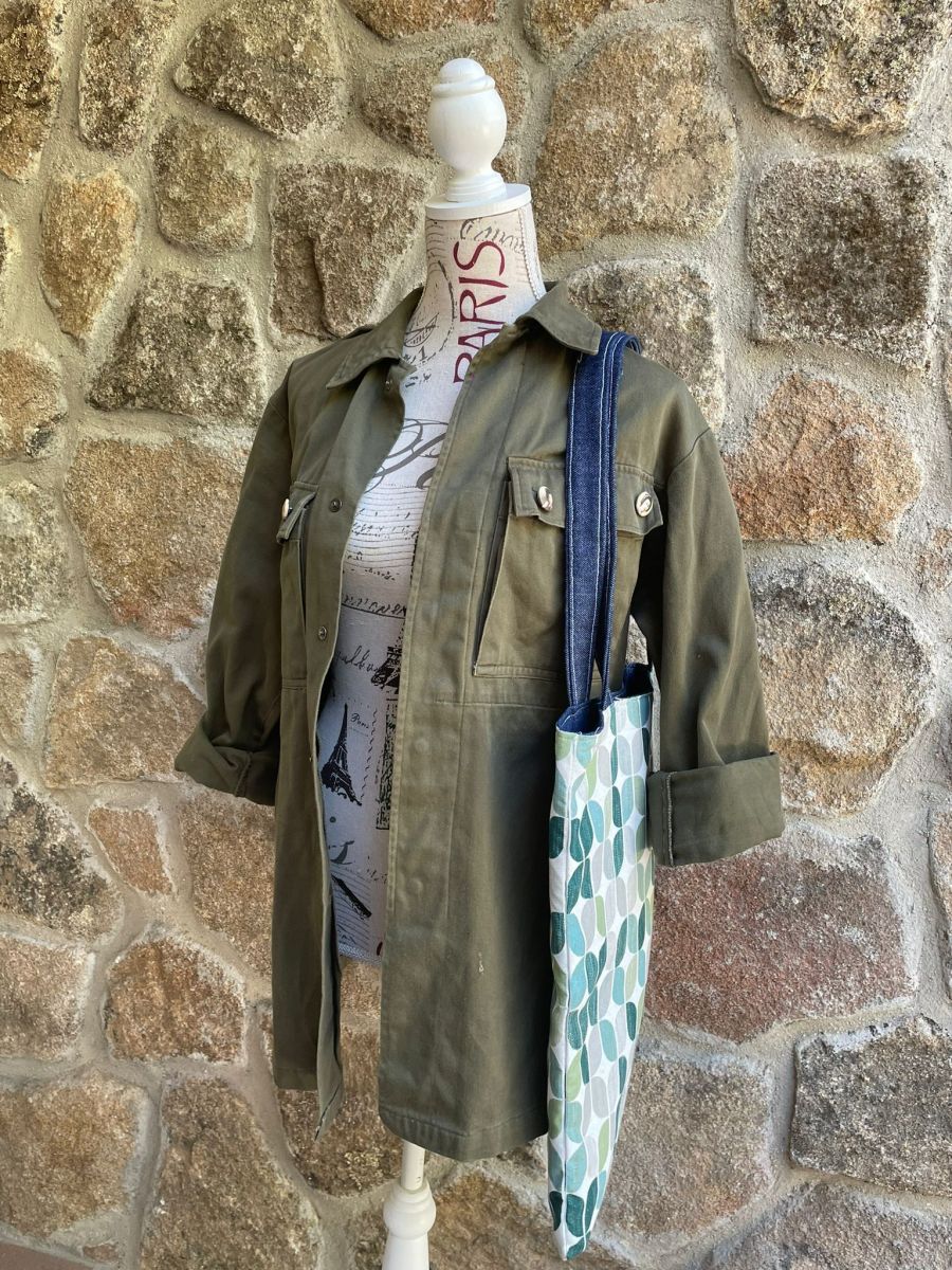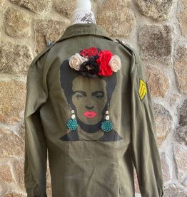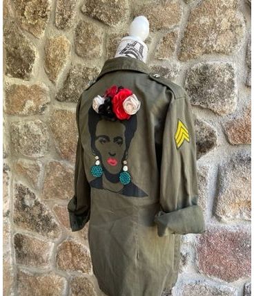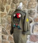 Veste militaire, customisée Frida, avec fleurs en tissu de diverses couleurs