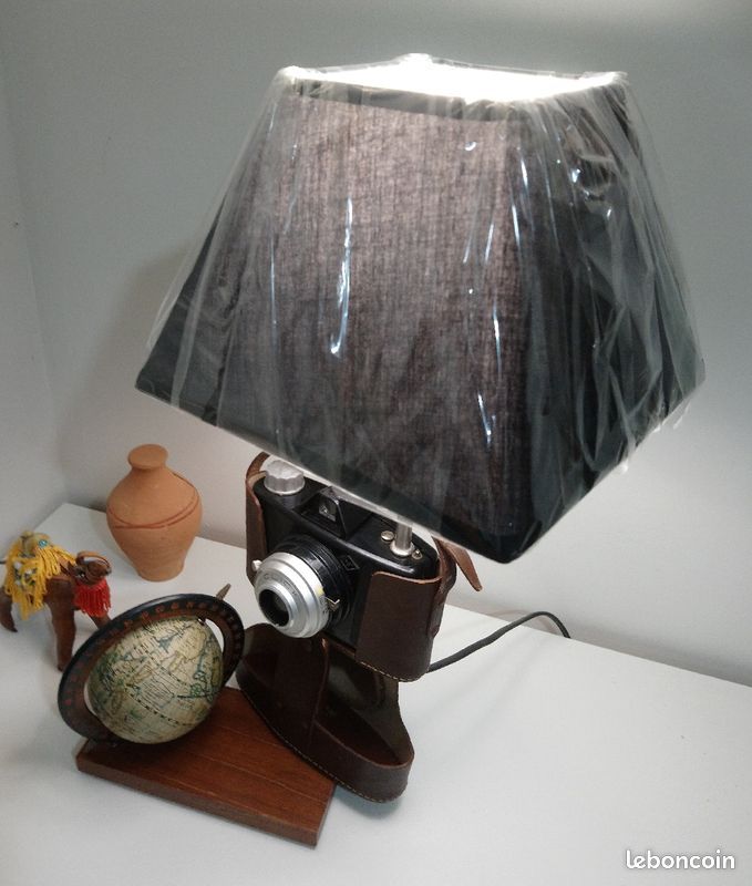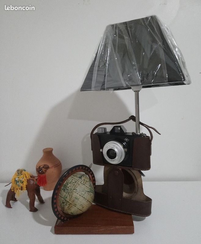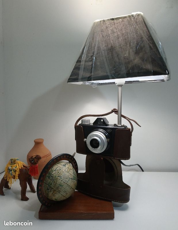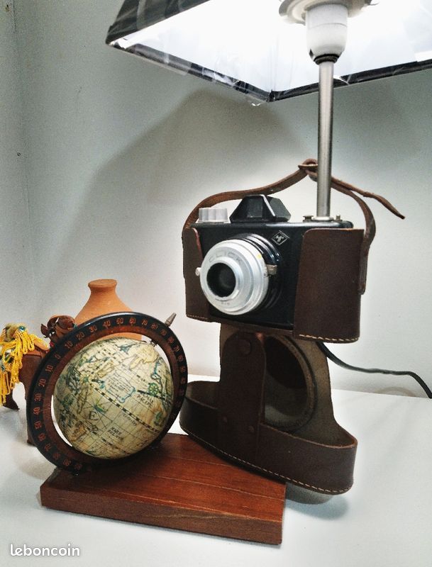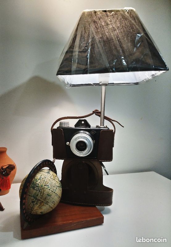 Conçue sur la base d'un ancien appareil photo vintage et de son étui, monté sur un socle bois (ancien porte crayon de bureau) avec petit globe tournant.